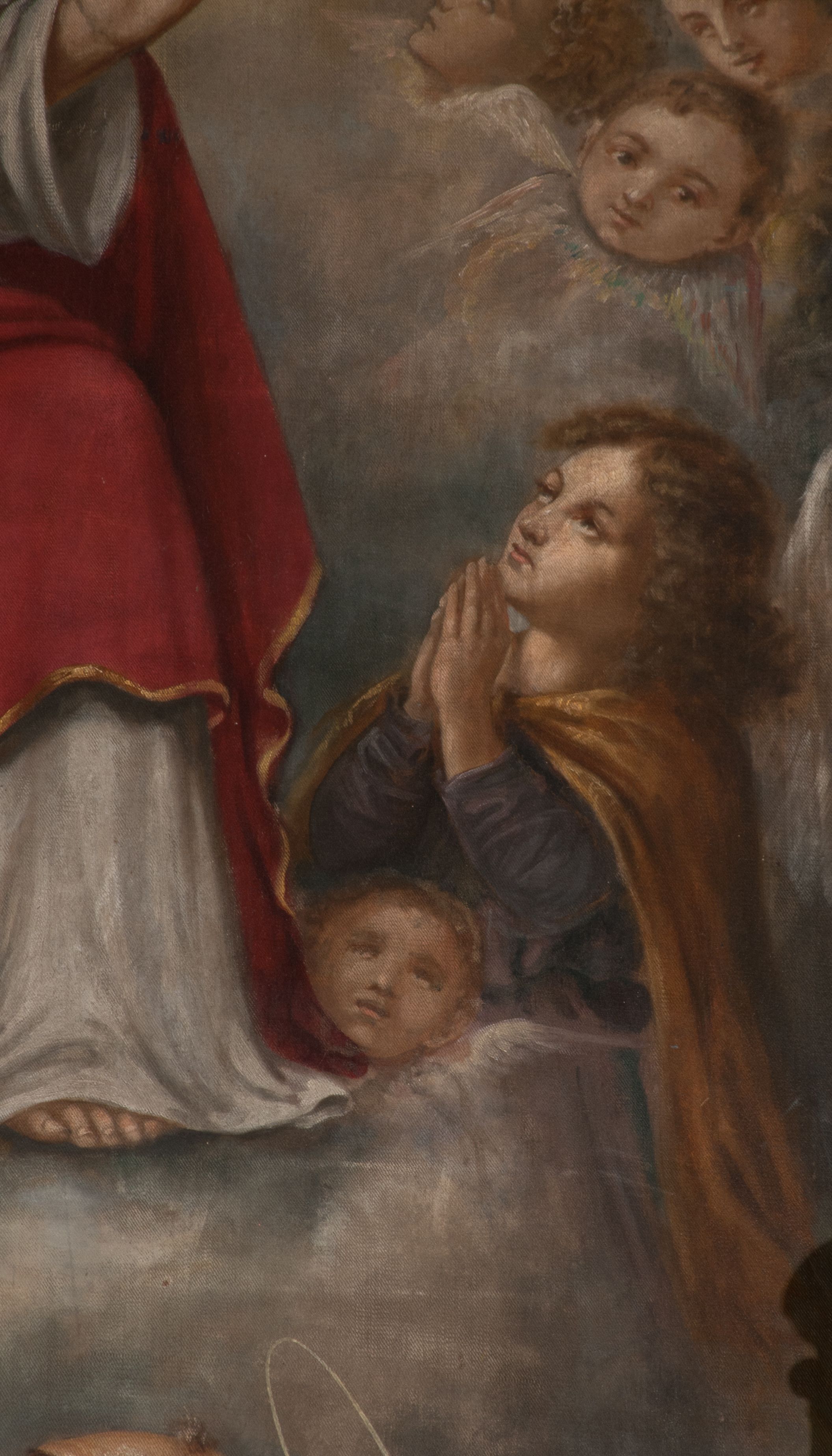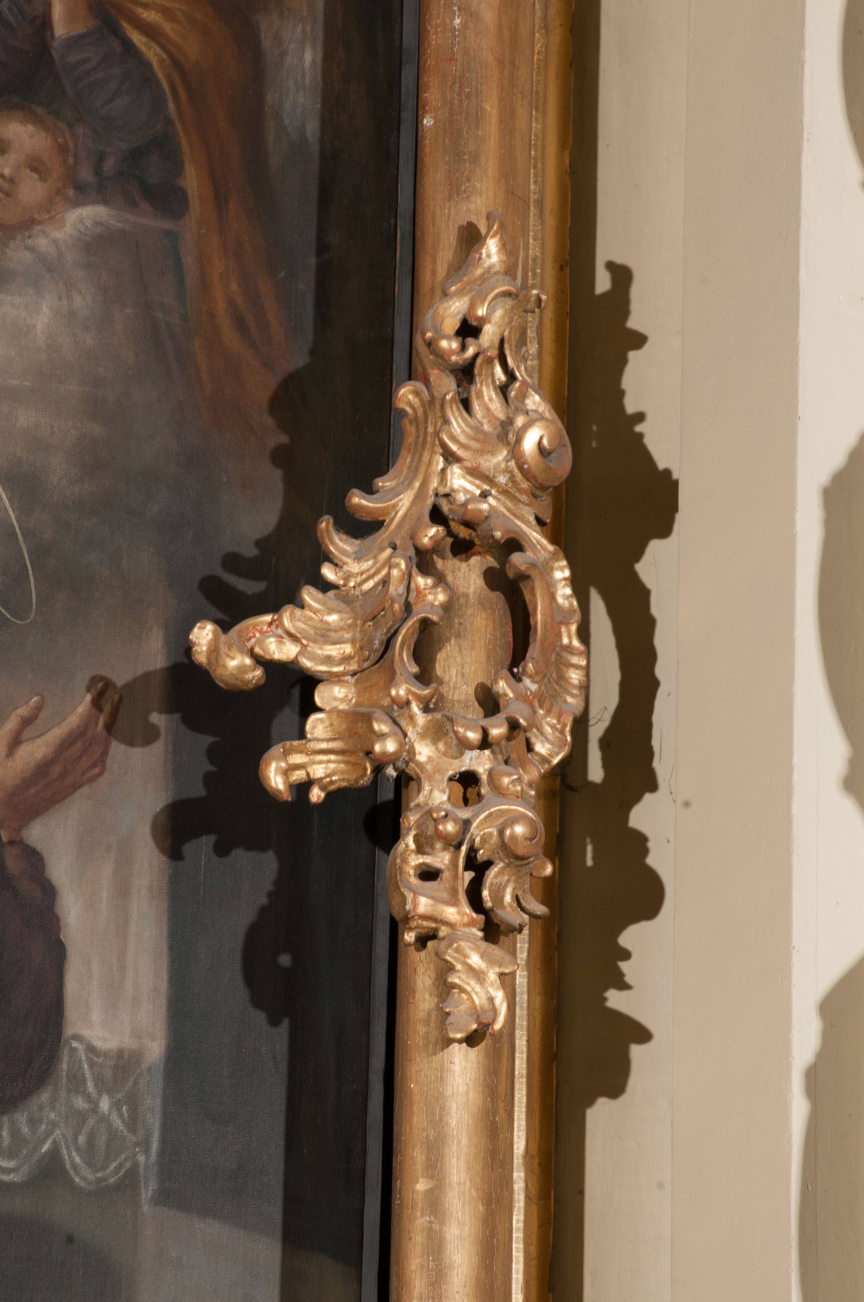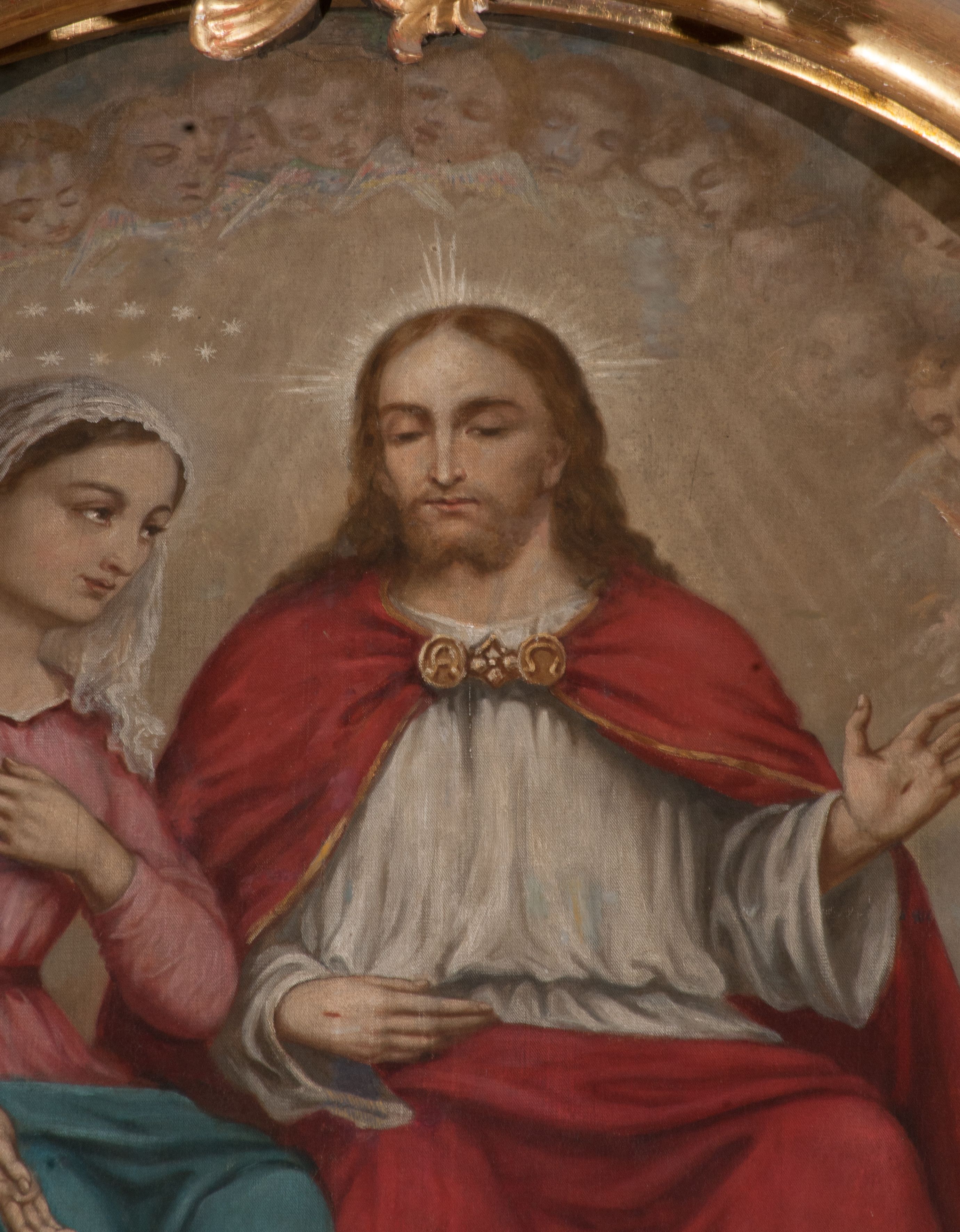 Obraz klęczącego przed ołtarzem św. Franciszka, któremu ukazuje się siedzący w chmurach Jezus i Maria w otoczeniu aniołów. Maria zwrócona w trzech czwartych w lewo, ukazana w różowej sukni, niebieskim płaszczu i z białym welonem na głowie oraz wieńcem z gwiazd. Prawa ręka wyciągnięta w stronę świętego, lewa przyłożona do piersi. Chrystus o długich, brązowych włosach i krótkim zaroście, ukazany frontalnie, w białej luźniej szacie i czerwonym płaszczu spiętym broszą i z krzyżowym promienistym nimbem nad głową. Lewa ręka lekko uniesiona do góry, prawa spoczywa na kolanie. Święty Franciszek ukazany tyłem do widza, z twarzą z profilu, uniesioną w stronę Marii, z rozłożonymi rękoma. Ubrany w brązowy habit franciszkański, przepasany podwójnym sznurem. Wokół Marii i Jezusa aniołowie w różnych pozach i główki aniołów.