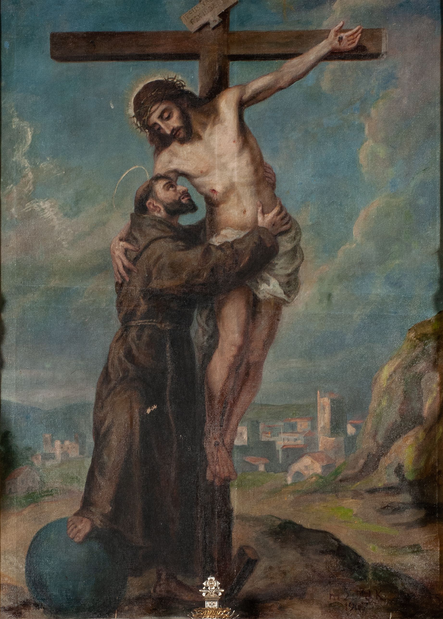 Obraz w kształcie stojącego prostokąta ukazuje wizję św. Franciszka. Święty obejmuje ciało wiszacego na krzyżu Chrystusa. W tle widok Jerozolimy. W prawym dolnym rogu sygnatura "m[alował] X[iądz] D[oktor] J[ózef] K[aczmarczyk] / 1907".