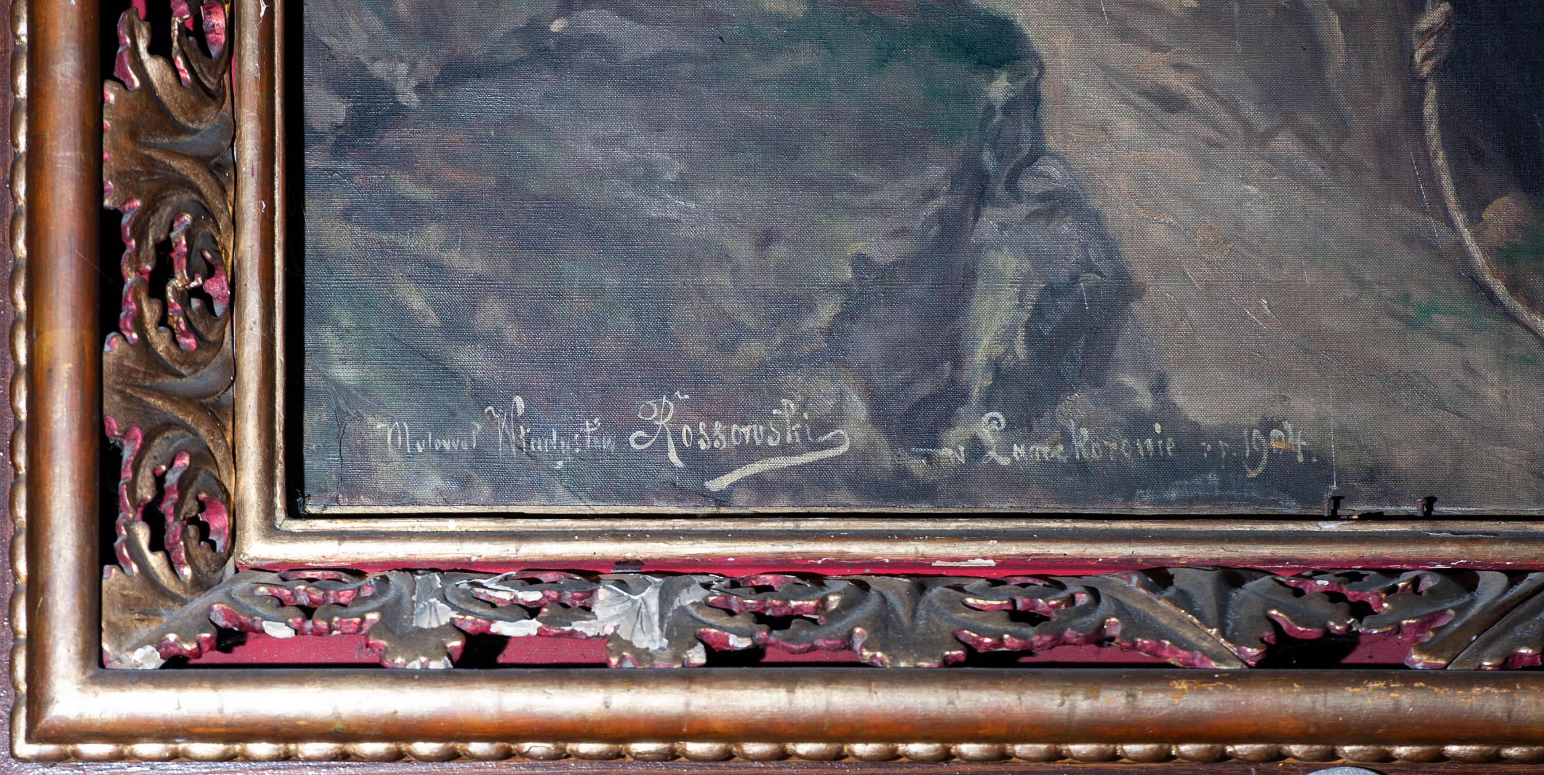 Obraz sprawiony jako zasuwa barokowego obrazu ołtarzowego.