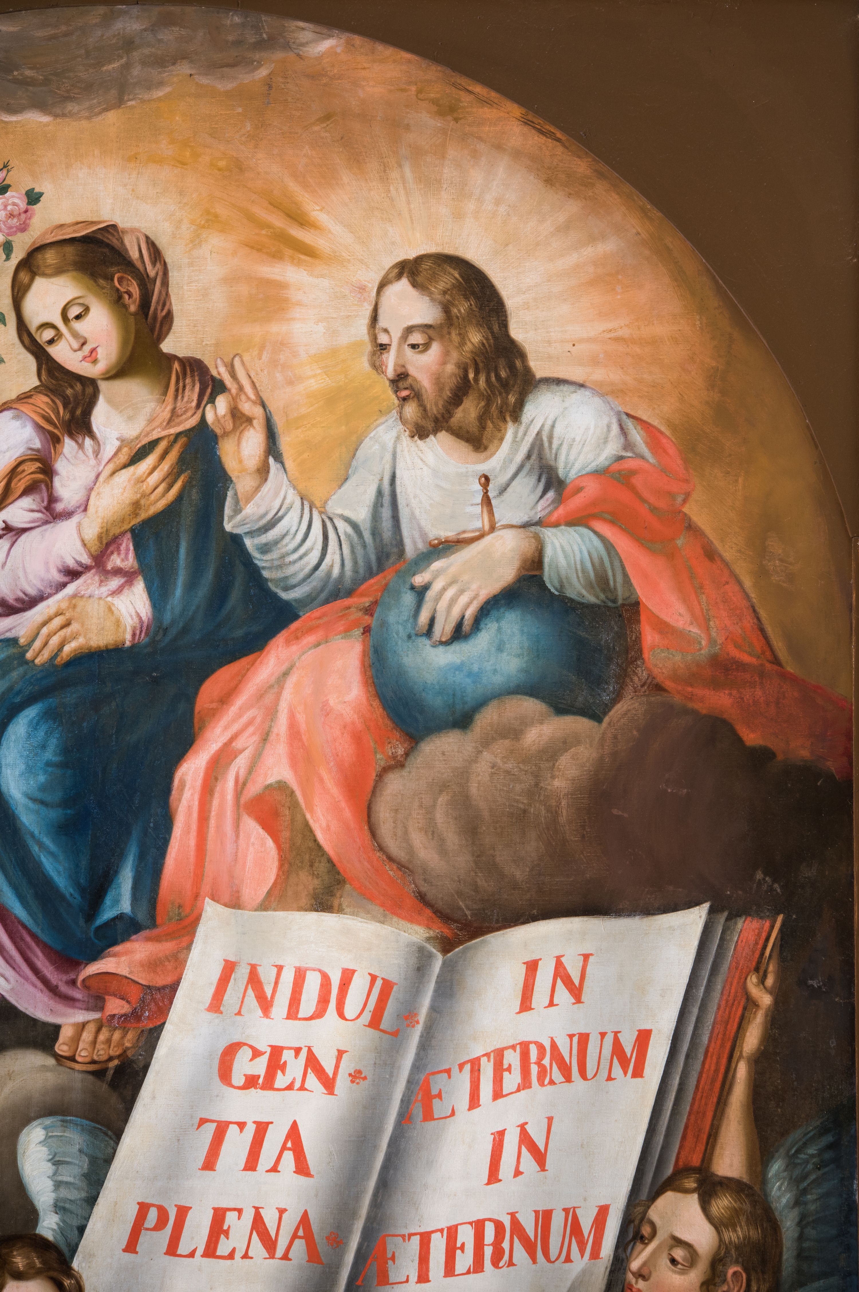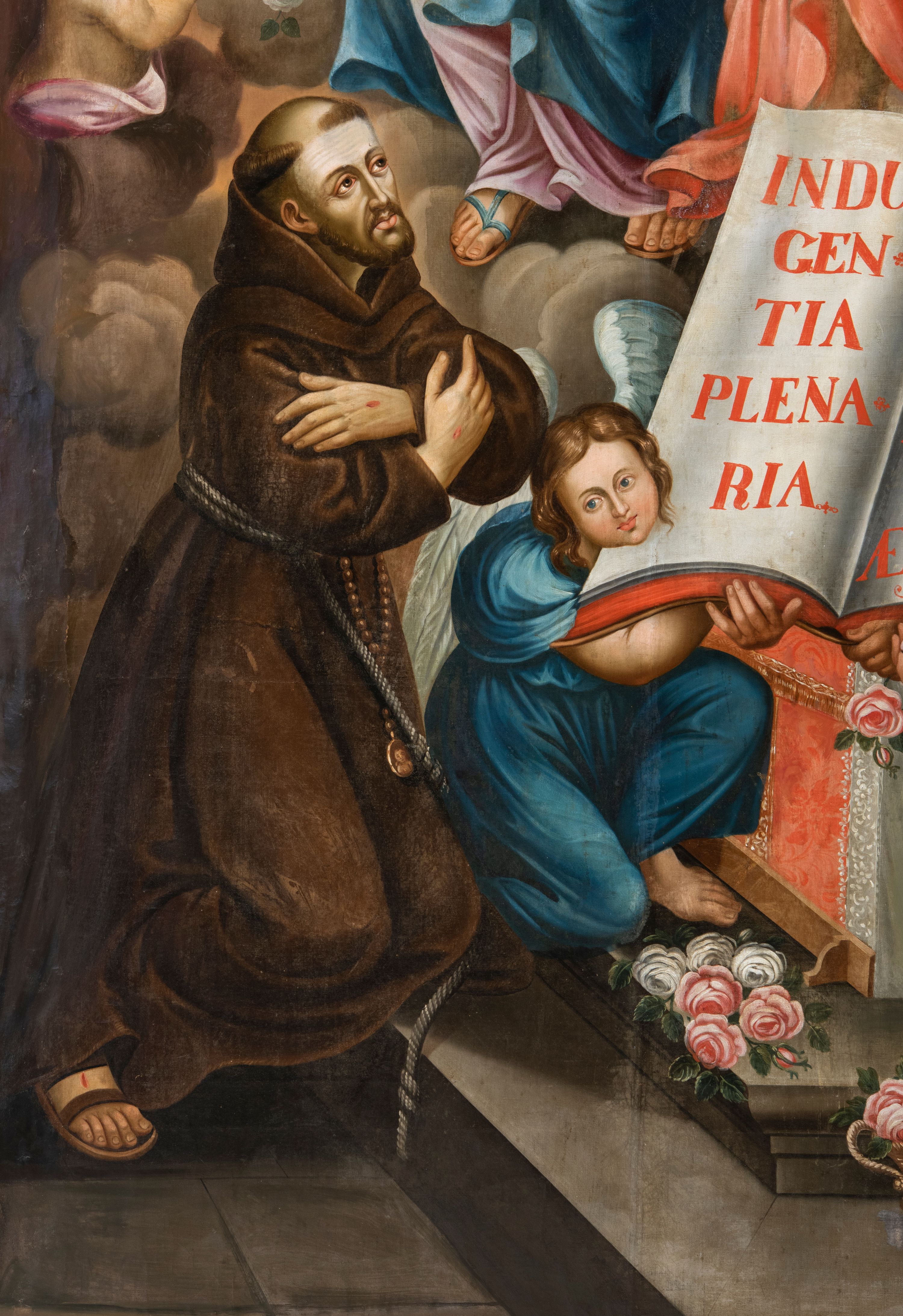Obraz w kształcie stojącego prostokąta, pole obrazowe zamknięte łukiem półkolistym, ujęty wąską, profilowaną, jasnobrązową ramą, z przedstawieniem Wizji św. Franciszka. Po lewej stronie kompozycji ukazany jest klęczący na kamiennym stopniu, zwrócony w trzech czwartych w lewo św. Franciszek. Odchyloną głowę charakteryzuje pociągła twarz o jasnej karnacji, wyrazistych rysach i krótkim zaroście. Głowę okala krótka tonsura. Święty ubrany jest w brązowy habit franciszkański przepasany szarym sznurem z przewiązanym na nim różańcem, na stopach ma sandały. Ręce skrzyżowane na piersiach, na dłoniach widoczne rany. Święty Franciszek spogląda w kierunku siedzących pośród obłoków Jezusa i Marii, którzy są w trzech czwartych zwróceni w prawo i spoglądają w dół na zakonnika. Jezus ubrany jest w białą suknię i zsuwający się z ramion czerwony płaszcz. Lewą rękę wspiera na niebieskim globie, prawą unosi w geście błogosławieństwa. Maria ma na sobie jasnoróżową suknię i narzucony na lewe ramię niebieski płaszcz. Na głowie pomarańczowa chusta opadająca na ramiona. Prawą rękę wspiera na piersiach, lewą na nodze. Ich głowy ujmują świetliste nimby promieniste. Poniżej, przed prostopadłościennym ołtarzem są dwaj aniołowie ubrani w niebieską i zieloną szatę, trzymający dużą, otwartą księgę z czerwonym napisem „INDUL/GEN/TIA / PLENA/RIA / IN / AETERNUM / IN / AETERNUM / IN / AETERNUM”. W prawym, dolnym rogu kompozycji przyklęka trzeci anioł w zielonej szacie, który w podniesionej do góry prawej ręce trzyma dwie jasnoróżowe róże. Na stopniach ołtarza leży bukiet i kosz z białymi i różowymi różami. Po lewej stronie obrazu, powyżej świętego, pośród obłoków sylwetki trzech aniołów trzymających w rękach kosze z białymi różami i gałązki z różowymi.