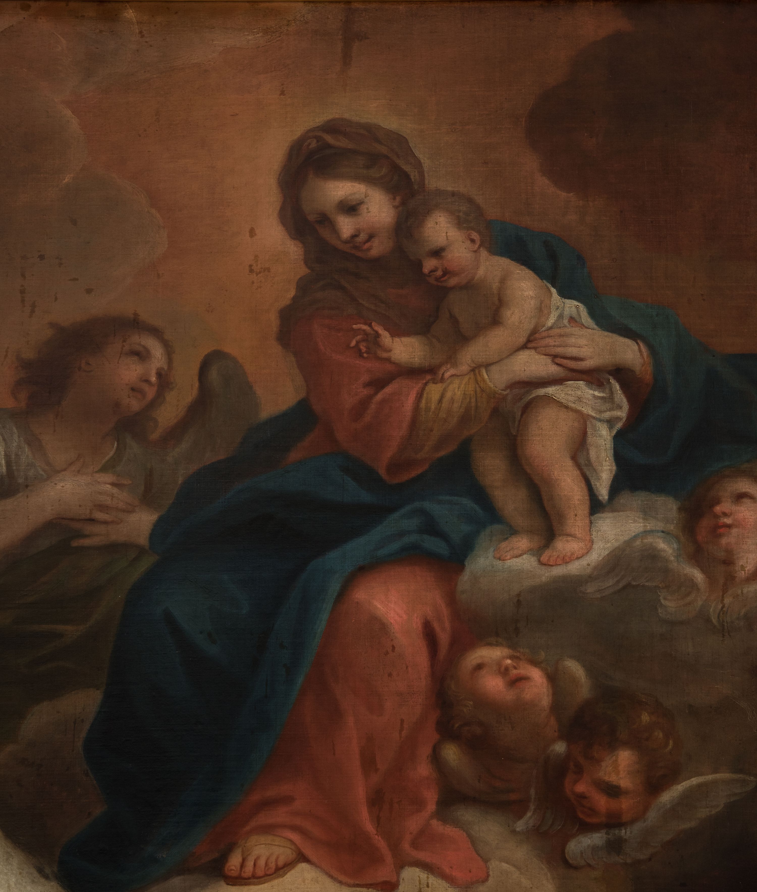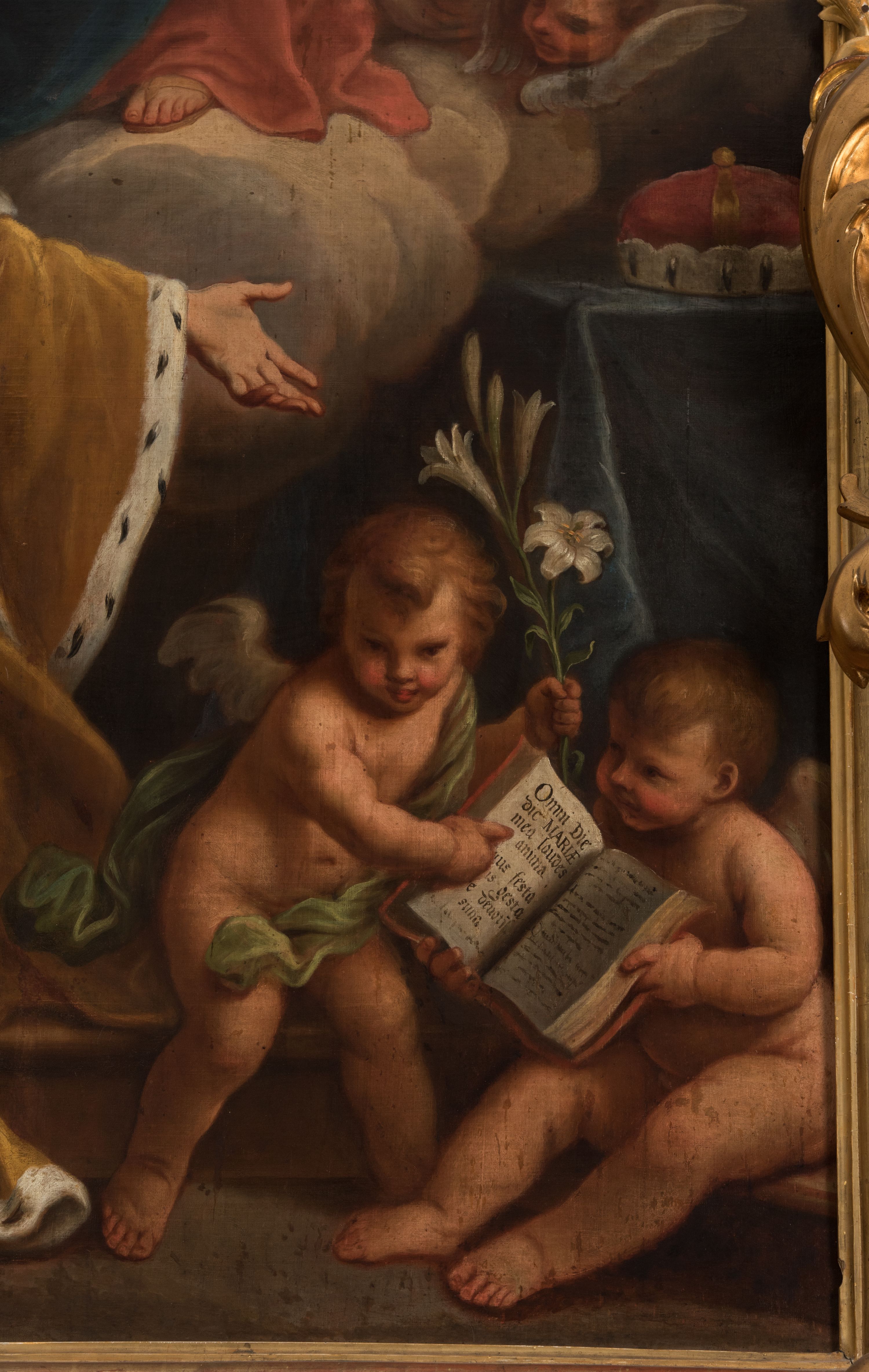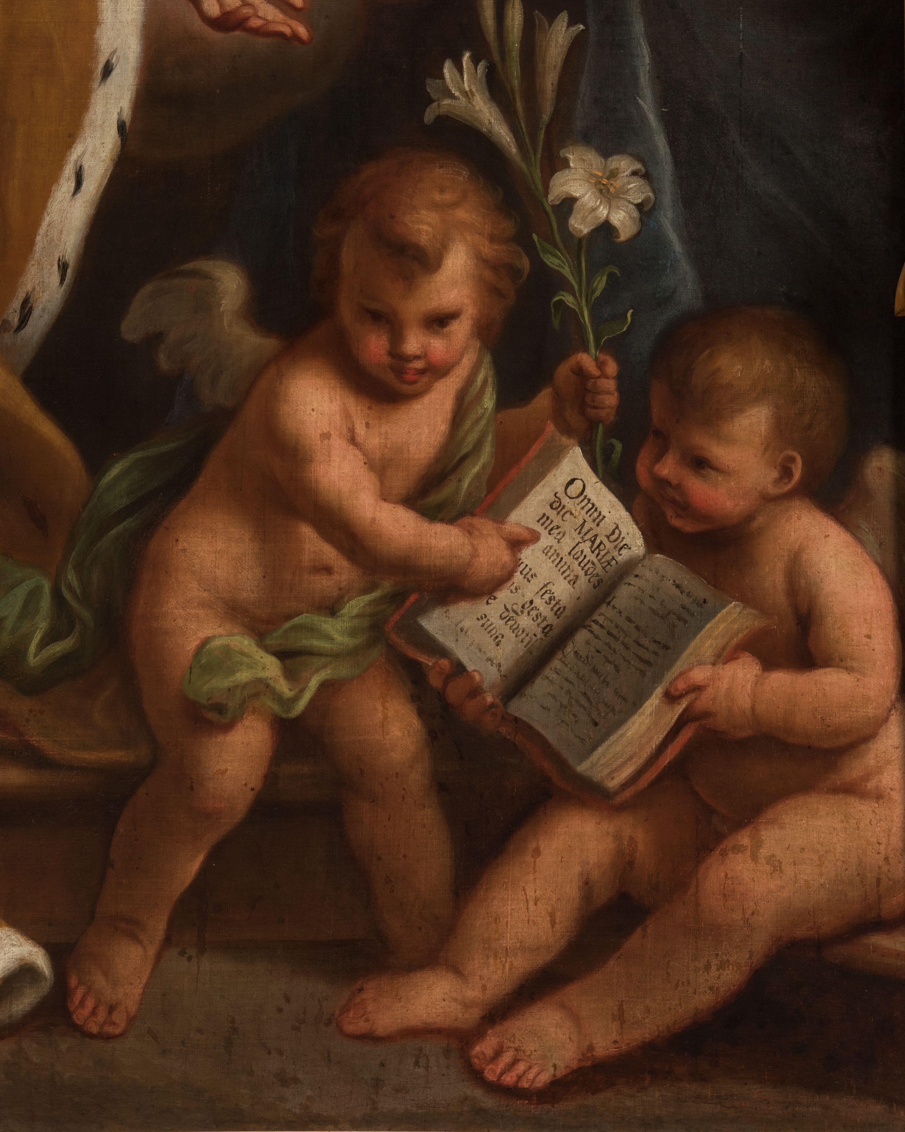 Mimo braku dokumentów archiwalnych potwierdzających autorstwo obraz jest niewątpliwym dziełem Szymona Czechowicza. Z innymi dziełami mistrza łączą go rozbudowany typ wieloosobowej kompozycji, szkicowy sposób malowania twarzy, miękki modelunek draperii, bogata kolorystyka oraz swoista atmosfera wizyjności, podkreślona miękkim i ukrytym światłem oraz rozmytymi, jakby niematerialnymi postaciami aniołów. Typowe dla malarza były grupy małych aniołów trzymających księgę lub atrybut świętego (obrazy w kościele św. Katarzyny w Wilnie i w kościołach Kapucynów w Olesku i w Warszawie). W krakowskim wizerunku putta trzymają księgę z początkowymi słowami łacińskiego hymnu do Najświętszej Marii Panny „Omni die dic Mariae”, autorstwa cysterskiego mnicha Bernarda z Morales (zm. ok. 1140), przetłumaczonego na język polski przez Stanisława Grochowskiego (ok. 1524-1612), brzmiącego: „Duszo moja, rzecz to twoja, Co dzień Maryję sławić. W jej dniach świętych, w sprawach wziętych Nabożeństwem się bawić”.