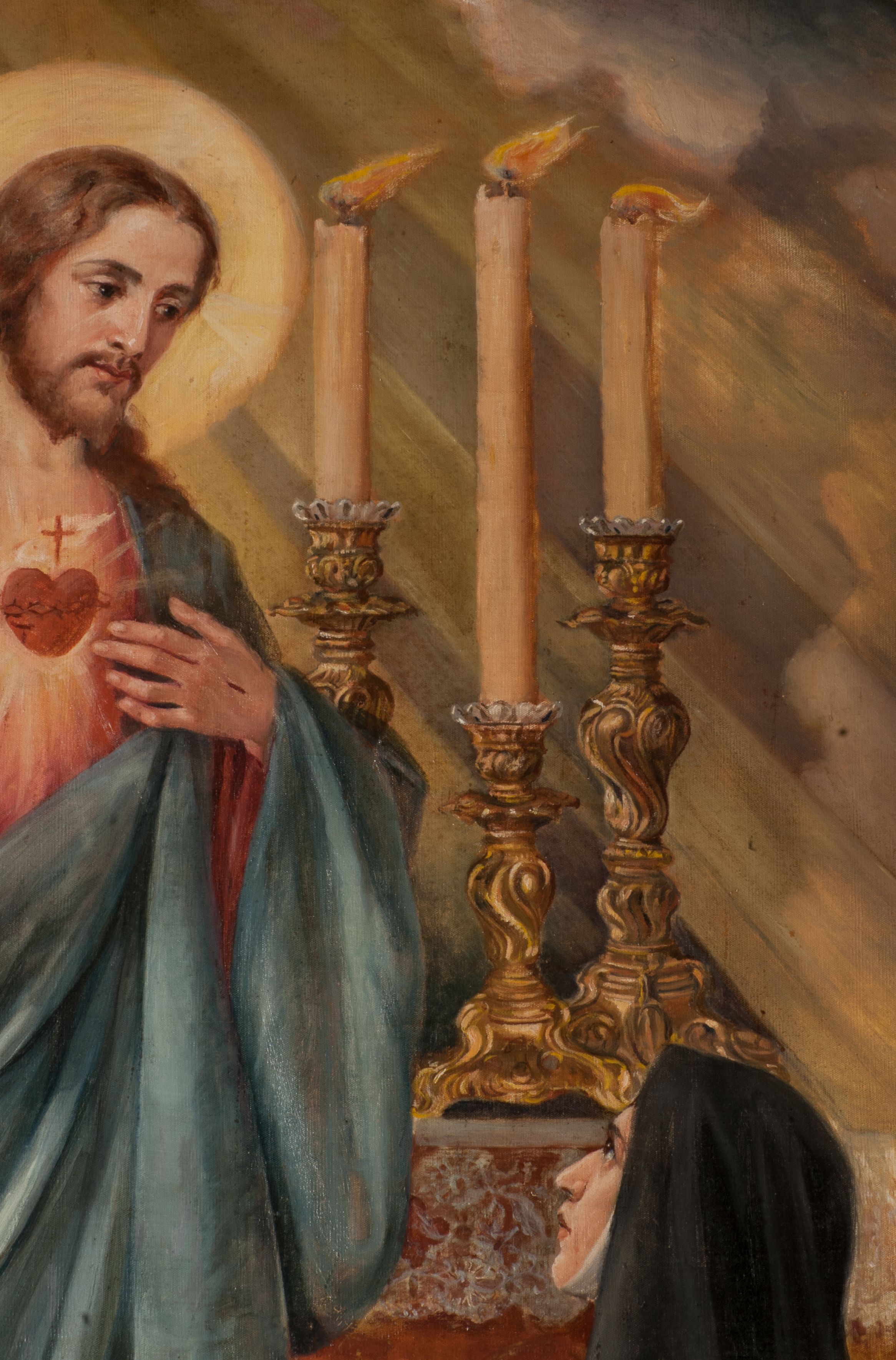 Obraz ilustruje jedno z czterech objawień Chrystusa z gorejącym sercem, które miała Małgorzata Alacoque w latach 1673-1675. Święta już jako pobożna dziewczynka została oddana do kolegium Klarysek w Charolles, jednak na kilka lat popadła w ciężką chorobę. Później wstąpiła do klasztoru Wizytek w Paray-le-Monial, gdzie przyjęła śluby zakonne. Podczas modlitwy kilkakrotnie doświadczyła wizji Chrystusa, który objawił jej swoją wolę słowami: „Moje Boskie Serce płonie tak silną miłością ku ludziom, że nie może dłużej utrzymać tych gorejących płomieni, zamkniętych w moim łonie. Ono pragnie je rozlać za twoim pośrednictwem i pragnie wzbogacić ludzi swoimi skarbami”. Podczas wizji Chrystus przekazał Małgorzacie, że jego wolą jest, aby zapoczątkowała kult do Serca Jezusowego, aby powstało osobne święto ku jego czci i w jaki sposób ma to wykonać. Za sprawą św. Małgorzaty