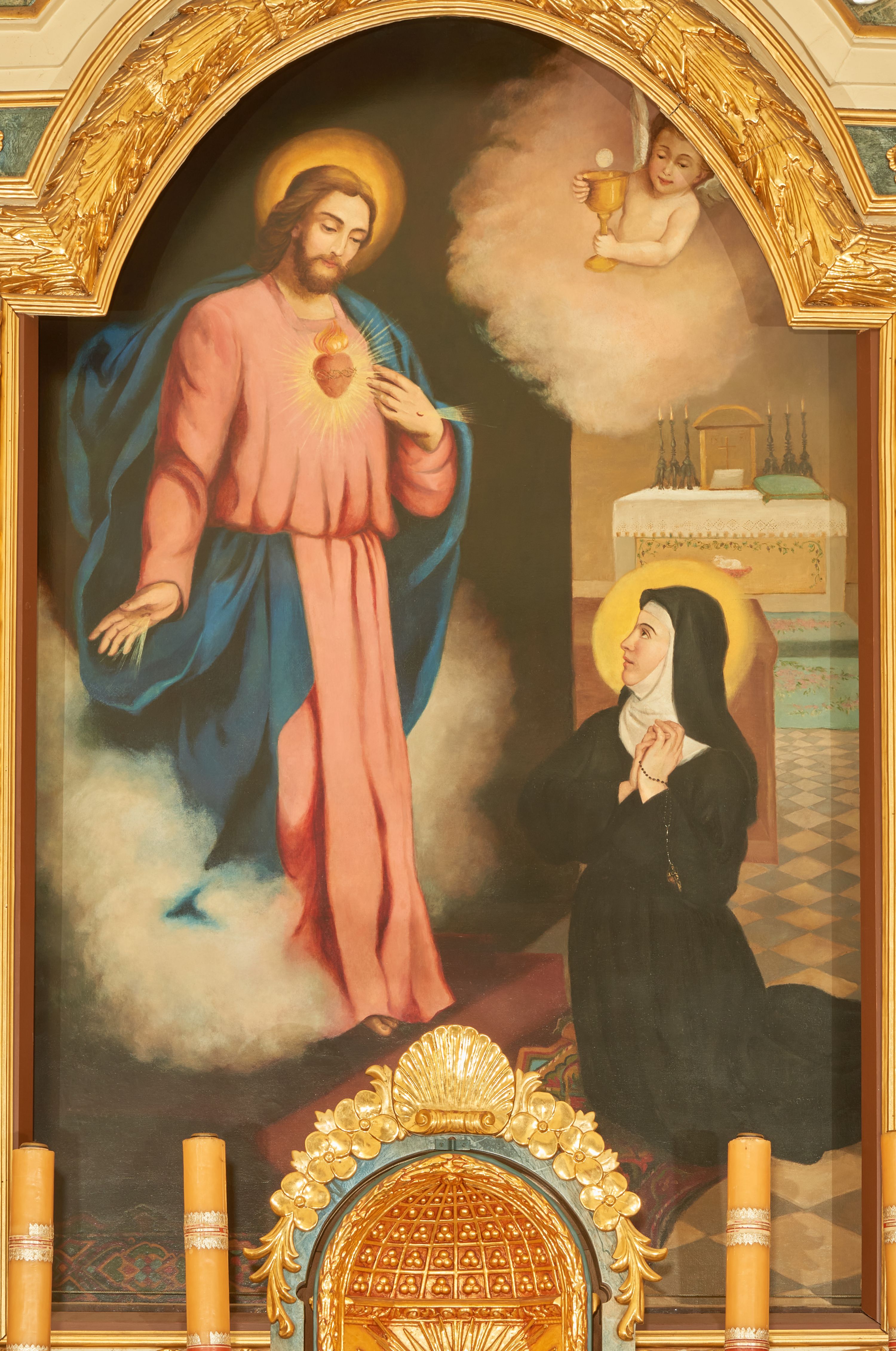 Niestety nie jest znany autor tego obrazu. Ukazano na nim świętą Małgorzatę Marię Alacoque, która urodziła się 22 czerwca 1647 w Lautecour. W latach 1673-1689 siostra zakonna doświadczyła 80 wizji i objawień objaśniających tajemnicę Serca Jezusa. To dzięki jej wizjom został w sposób szczególny rozpowszechniony kult Najświętszego Serca Jezusa. Obraz przedstawia jedno z czterech objawień, jakich doznała św. Małgorzata Maria Alacoque na temat Chrystusa z gorejącym sercem, który przekazał jej swoją wolę słowami: „Moje Boskie Serce płonie tak silną miłością ku ludziom, że nie może dłużej utrzymać tych gorejących płomieni, zamkniętych w moim łonie. Ono pragnie je rozlać za twoim pośrednictwem i pragnie wzbogacić ludzi swoimi skarbami”. Za sprawą tych objawień kult Najświętszego Serca Jezusowego rozwijał się już od XVII wieku, jednak dopiero w 1765 roku papież Klemens XIII zezwolił na obchodzenie święta przez zakon wizytek, a w 1856 roku ustanowiono je świętem w całym kościele.