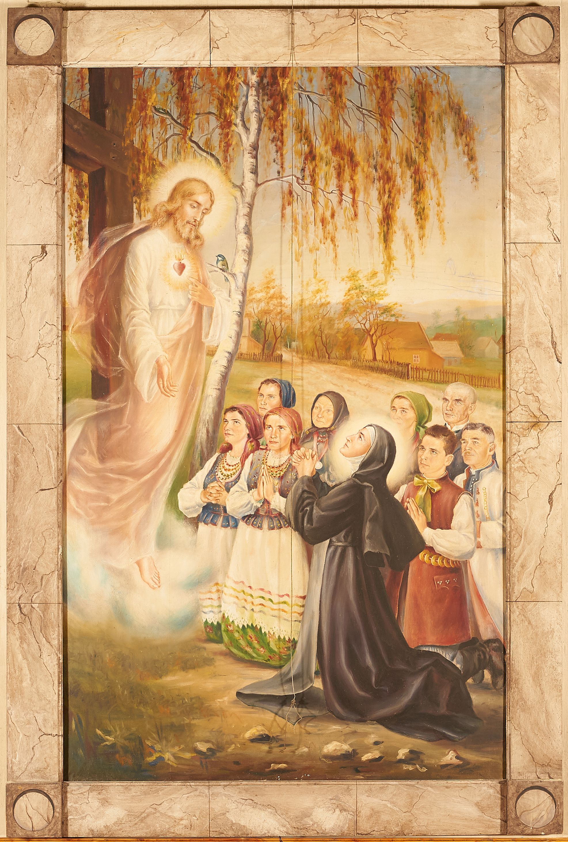 Obraz w kształcie stojącego prostokąta, ujęty prostą, drewnianą ramą dekorowaną polichromią imitującą marmur. Scena wizji św. Małgorzaty Marii Alacoque rozgrywa się na tle wiejskiego pejzażu z widocznymi w oddali zabudowaniami. Na pierwszym planie klęcząca święta przedstawiona jako młoda kobieta ubrana w czarny strój zakonny, ukazana z lewego profilu. Głowa otoczona świetlistym nimbem uniesiona ku górze, ręce złożone w geście modlitwy. Święta Małgorzata w mistycznym zachwycie wpatruje się w ukazanego z lewej strony kompozycji Chrystusa stojącego na obłoku. Zbawiciel przedstawiony na tle krzyża wskazuje lewą ręką na widoczne na jego piersi gorejące serce, prawą wyciąga do świętej Małgorzaty. Został przedstawiony jako młody, jasnowłosy mężczyzna o łagodnych rysach twarzy. Wokół jego głowy widoczny jest świetlisty nimb. Chrystus ubrany jest w długą, białą tunikę oraz jasnoróżowy płaszcz o rozwianych połach. Stopu bose. Nieco z tyłu, za postacią św. Małgorzaty ukazane postaci klęczących mężczyzn i kobiet w strojach krakowskich oraz brzoza z siedzącym na jednej z gałęzi ptakiem. Kolorystyka obrazu jasna, utrzymana w pastelowych barwach.