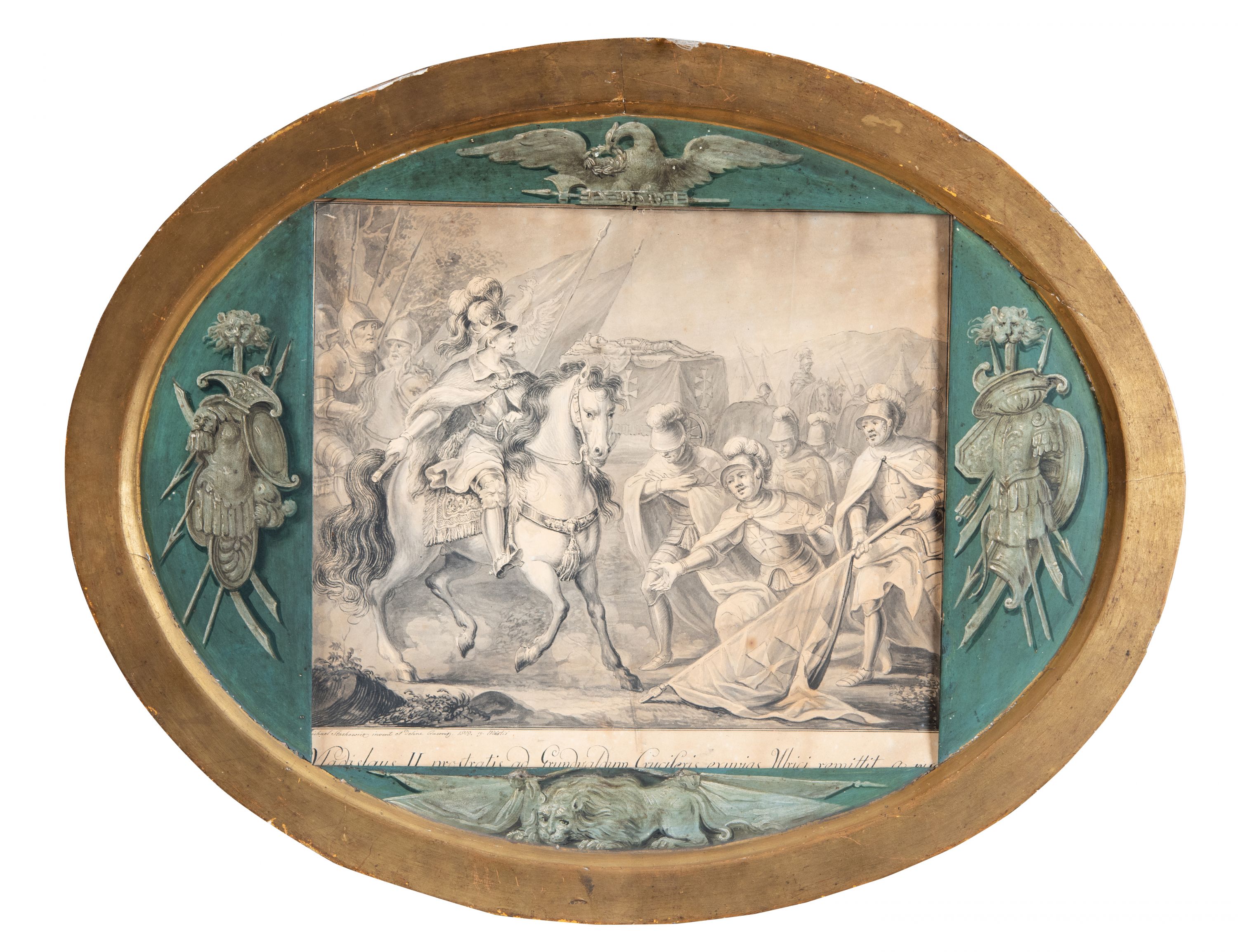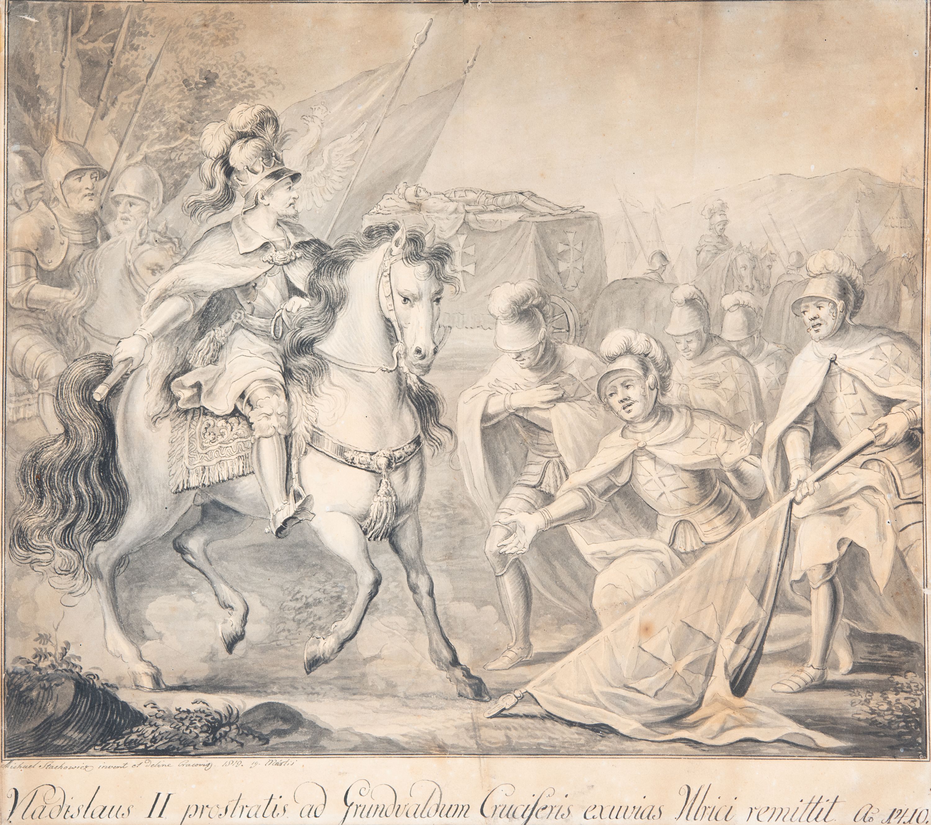 U dołu napisy: "Michael Stachowicz invenit et deline Cracovia 1819.19." i "Vladislaus II prostratis ad Grundvaldum Cruciferis exuvias Ulrici remittit a. 1410."