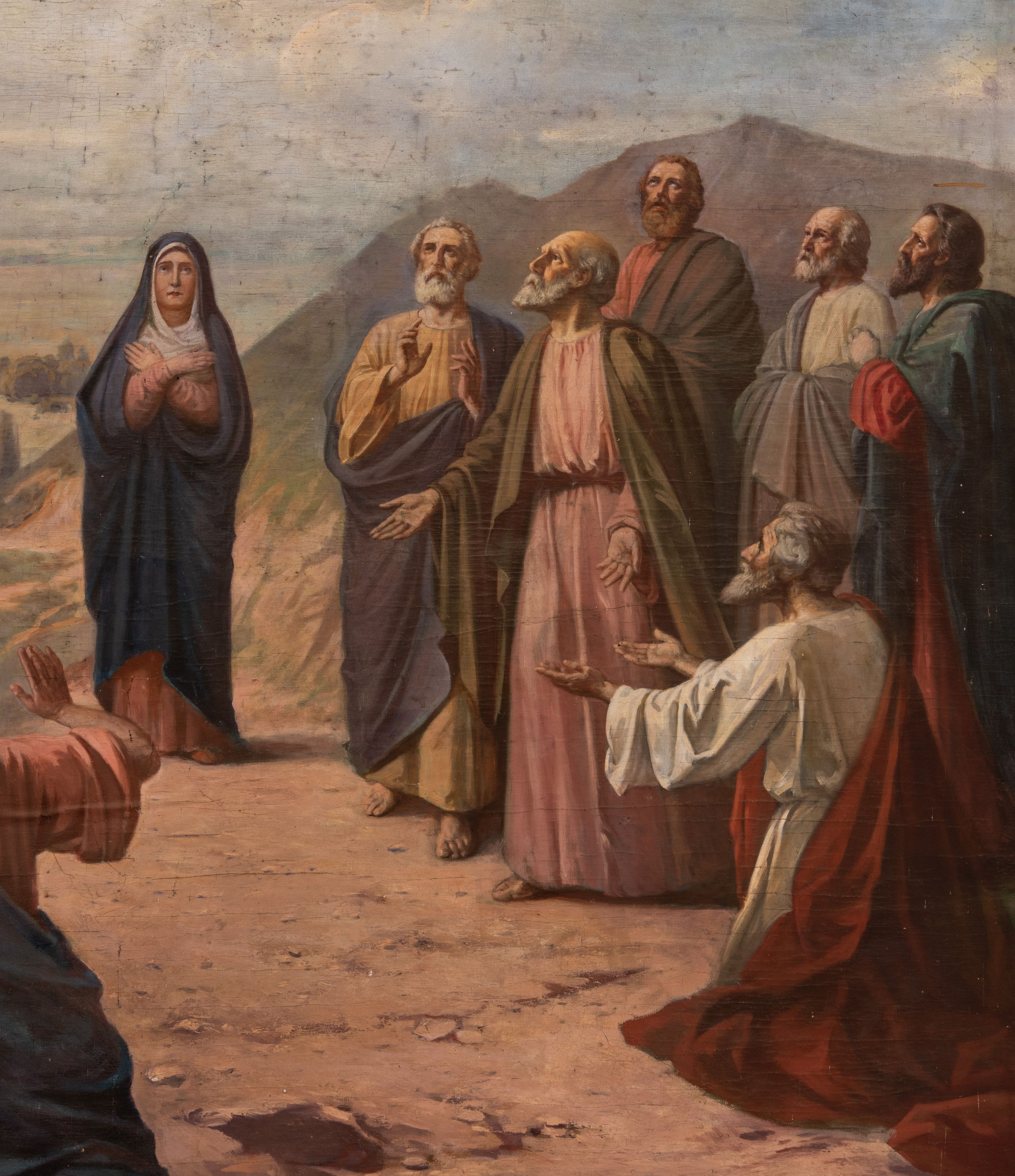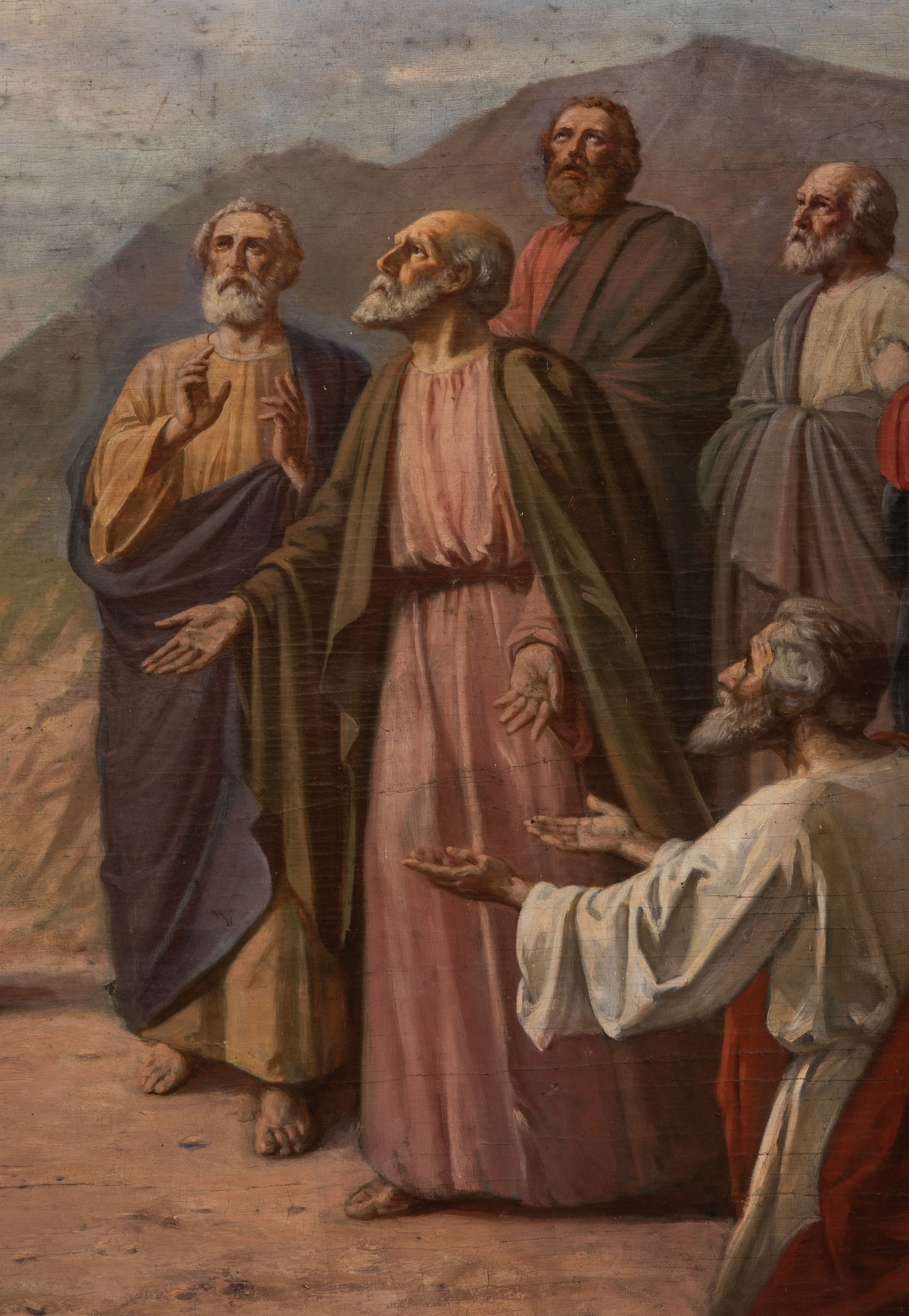 Autorstwo ani szczegółowy czas powstania omawianego dzieła nie są znane. Pod względem stylistycznym obraz stanowi przykład malarstwa religijnego pierwszej połowy XX wieku. Przedstawiona scena ukazuje wniebowstąpienie Chrystusa. Wydarzenie to opisują Ewangelie św. Marka (Mk 16, 19) i św. Łukasza (Łk 24, 50-51) oraz Dzieje Apostolskie (Dz 1, 9-11). Chrystus przez 40 dni po zmartwychwstaniu przebywał wśród swoich uczniów. Po upływie tego czasu apostołowie wspólnie udali się na Górę Oliwną. W ich obecności Jezus uniósł się w górę i zniknął. W ikonografii chrześcijańskiej scena Wniebowstąpienia przedstawiana jest dwojako – zmartwychwstały Chrystus unosi się do góry na tle obłoków, a towarzyszący mu apostołowie wpatrują się w niebo lub Chrystus wstąpił już do nieba, a śladem, który po nim pozostał, jest odbicie stóp widoczne na skale.
