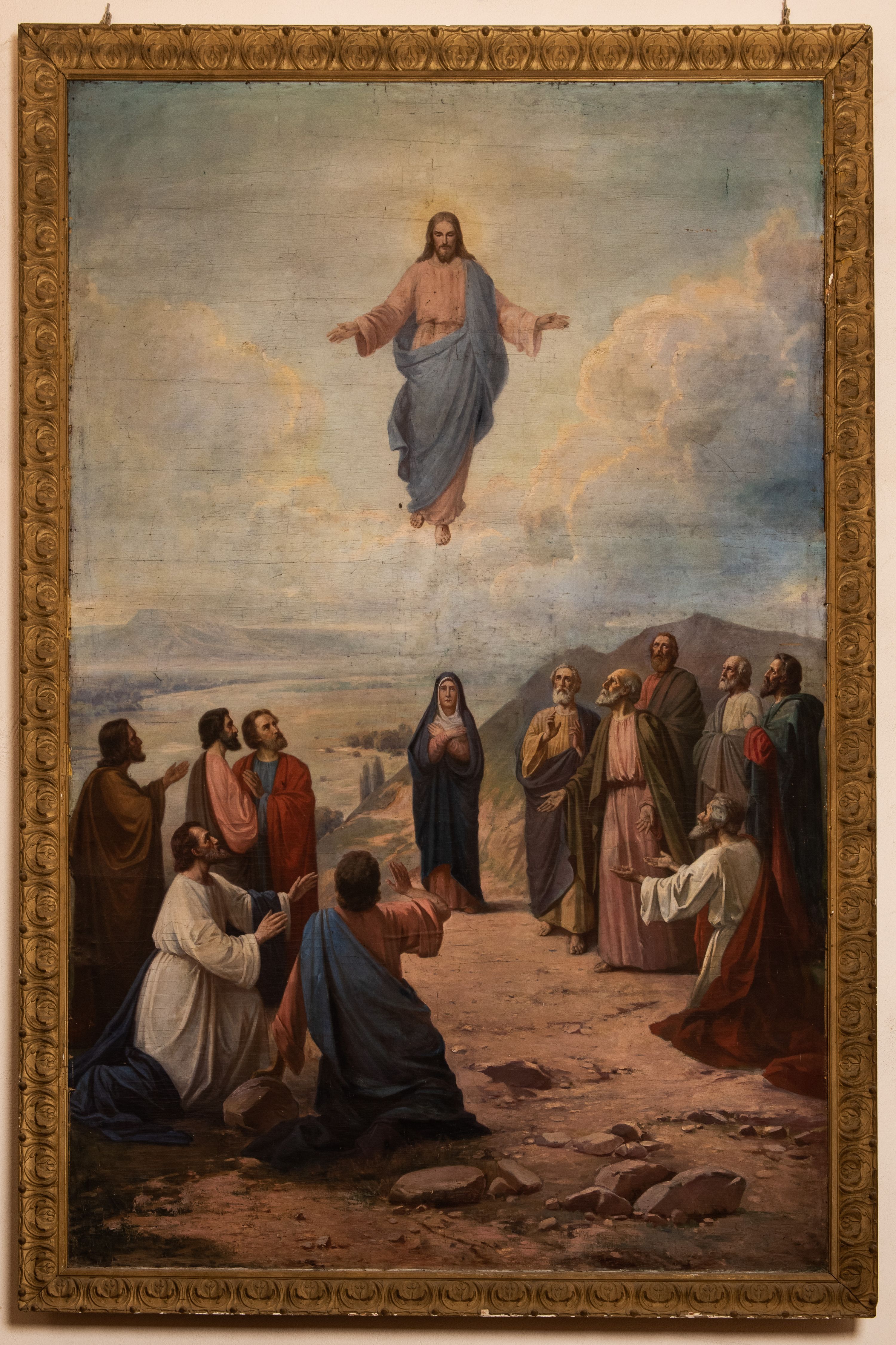Autorstwo ani szczegółowy czas powstania omawianego dzieła nie są niestety znane. Pod względem stylistycznym obraz stanowi całkiem udany przykład malarstwa religijnego pierwszej połowy XX wieku. Przedstawiona scena ukazuje wniebowstąpienie zmartwychwstałego Chrystusa. Wydarzenie to opisują Ewangelie św. Marka (Mk 16, 19) i św. Łukasza (Łk 24, 50-51) oraz Dzieje Apostolskie (Dz 1, 9-11). Chrystus przez 40 dni po zmartwychwstaniu przebywał wśród swoich uczniów. Po upływie tego czasu apostołowie wspólnie udali się na Górę Oliwną. W ich obecności Jezus uniósł się w górę i zniknął. Święto Wniebowstąpienia należy do najważniejszych obchodów roku liturgicznego. W ikonografii chrześcijańskiej przedstawienia najbardziej istotnych świąt nie ulegały z czasem znaczącym zmianom i, jak pisze Władysław Smoleń, były ilustrowane z większą ostrożnością i dbałością o poprawność doktrynalną. Sceny Wniebowstąpienia można podzielić zasadniczo na dwie grupy. Pierwsza, którą reprezentuje omawiany obraz, obejmuje sceny, w których Chrystus unosi się do góry na tle obłoków i widocznej w dole Góry Oliwnej, a towarzyszący mu apostołowie wpatrują się w niebo. Druga grupa to przedstawienia, na których Chrystus już wstąpił do nieba, a śladem, który po nim pozostał, jest odbicie stóp widoczne na skale.