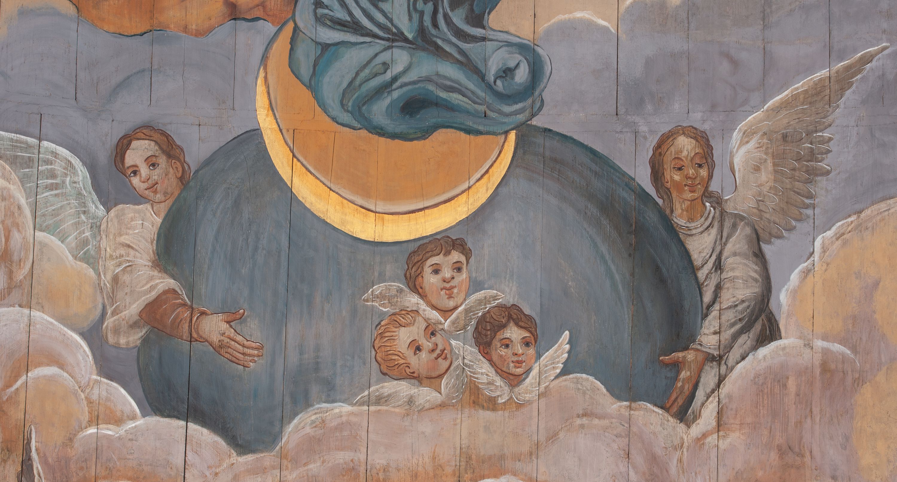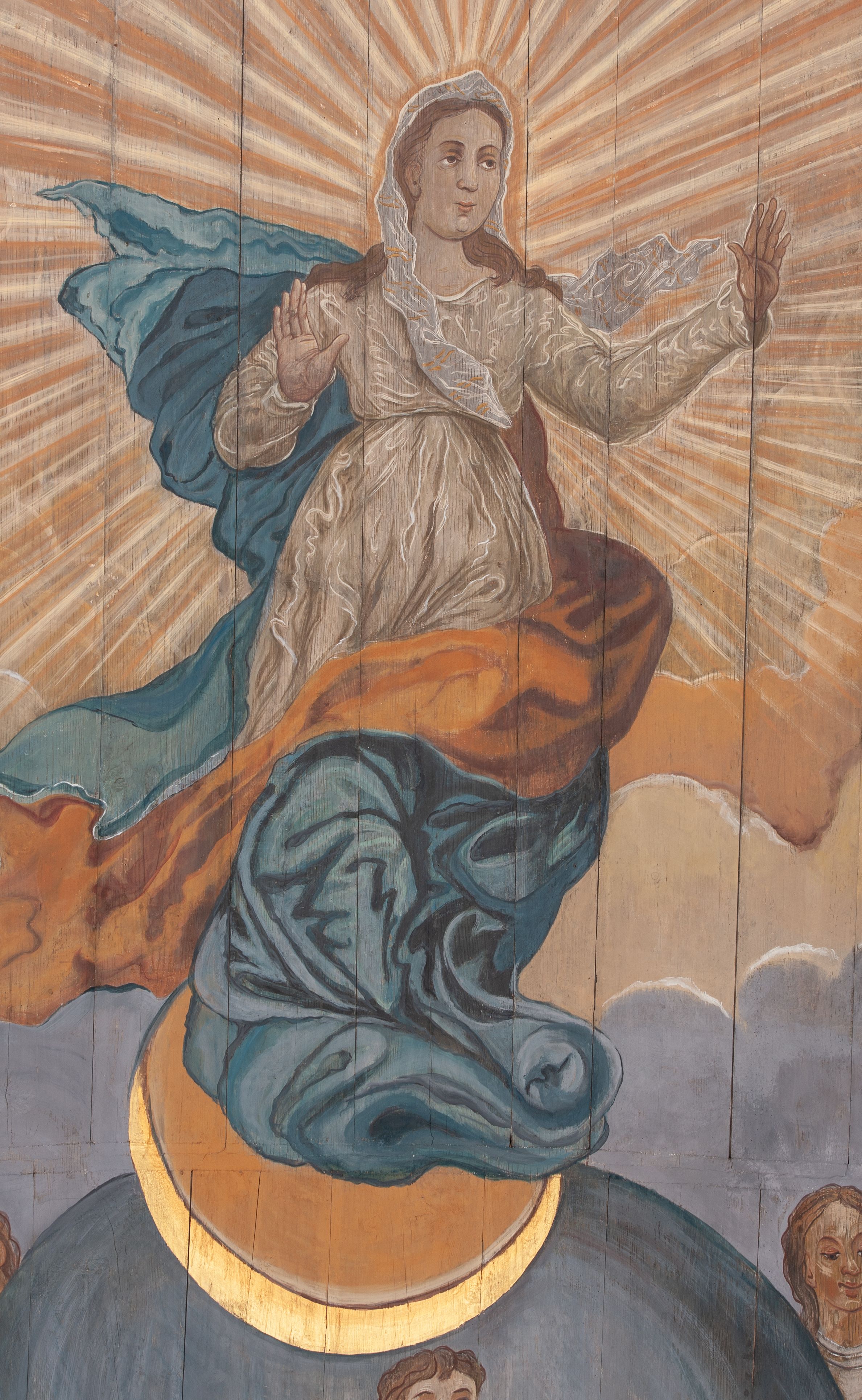Wniebowzięcie Najświętszej Marii Panny (łac. Assumptio Beatae Mariae Virginis in coelum) jest udzielonym Marii przez Boga nadprzyrodzonym przywilejem, na mocy którego po zakończeniu ziemskiego życia została wzięta do nieba z duszą i ciałem. Dogmat o Wniebowzięciu został ogłoszony dopiero 1 listopada 1950 przez papieża Piusa XII w konstytucji apostolskiej „Munificentissimus Deus”, jednak świadectwo na temat końca życia Marii pojawiało się już w pismach patrystycznych, np. w „Panarionie” Epifaniusza (IV w.). Obok terminu „wniebowzięcie” (assumptio) stosowano także „zaśnięcie” (dormitio) oraz „przejście” (transitus). Obraz reprezentuje nowy wariant ukazywania Wniebowzięcia Najświętszej Marii Panny jako Niewiasty Apokaliptycznej. W ten sposób Marię malował w rozbudowanych kompozycjach El Greco: w kościele San Domingo el Antiguo w Toledo (1577) lub w Museo Thyssen-Bornemiasza w Madrycie (1573-1576), a także w późniejszych, licznych wersjach Bartolomé Esteban Murillo. Polichromia powstała w XVII wieku, co uwidacznia się w dynamice barokowej kompozycji. Cytaty umieszczone na banderolach są fragmentami „Pieśni nad pieśniami” i Psalmu 23.
