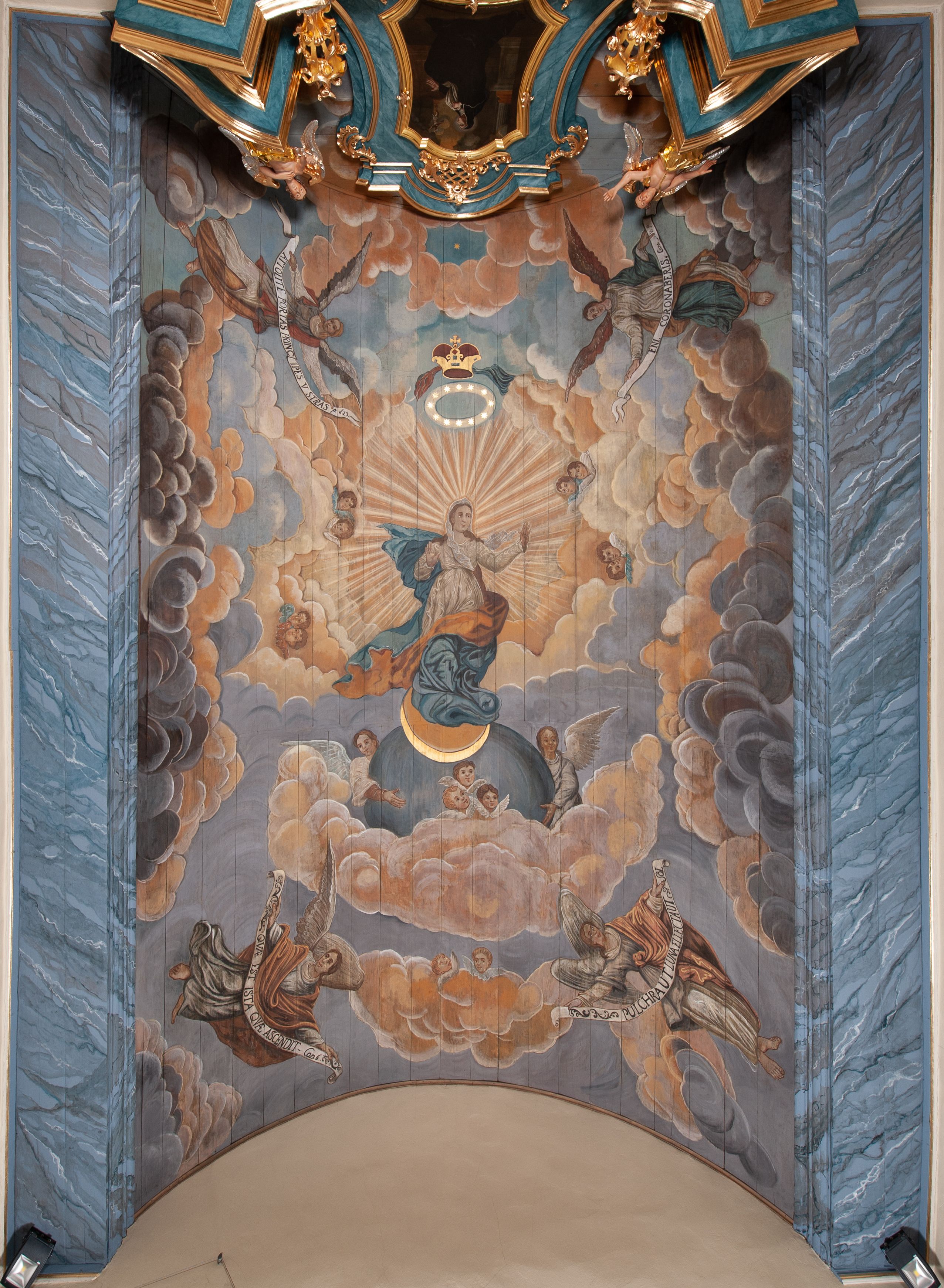Polichromia skomponowana na pozornym, drewnianym sklepieniu kolebkowym przedstawia Wniebowzięcie Najświętszej Marii Panny. W centrum kompozycji Maria stoi na globie i półksiężycu i wyciąga przed siebie ręce. Ma pociągłą twarz, ciemne oczy, szeroki nos i niewielkie usta. Jest ubrana w białą suknię i takiego koloru welon, którego końce rozwiewają się z przodu i z tyłu. Jej nogi otacza niebieski płaszcz z żółtym podbiciem, które wywija się na wysokości lewego biodra Marii. Zza jej głowy rozchodzi się gloria promienista, ponad którą unosi się nimb z 12 gwiazd i zamknięta korona z czerwoną i niebieską szarfą. Powyżej, między obłokami niewielka, złota gwiazda. Półksiężyc pod jej stopami jest ciemnożółty, ze złotym brzegiem, glob jest niebieski, podtrzymują go dwa anioły w jasnych sukniach z długimi rękawami. Scenę otaczają skłębione różowo-niebieskie obłoki, spomiędzy których wyłaniają się w wielu miejscach główki anielskie. W czterech narożnikach znajdują się anioły ubrane w jasne suknie i owijające częściowo ich ciała ciemnożółte (w przypadku jednego niebieski) płaszcze. Każdy z nich trzyma banderolę z łacińskim napisem: „ATTOLITE PORTAS PRINCIPES V[E]STRAS, ps(almi) 23”, „QUAE EST ISTA QUAE ASCENDIT Can[ticum] 6”, „PULCHRA UT LUNA ELLECTA UT SOL”, „ENI CORONABERIS, Cant[icum]”. Scenę z dwóch stron ograniczają pasy polichromii imitującej niebieską marmoryzację.