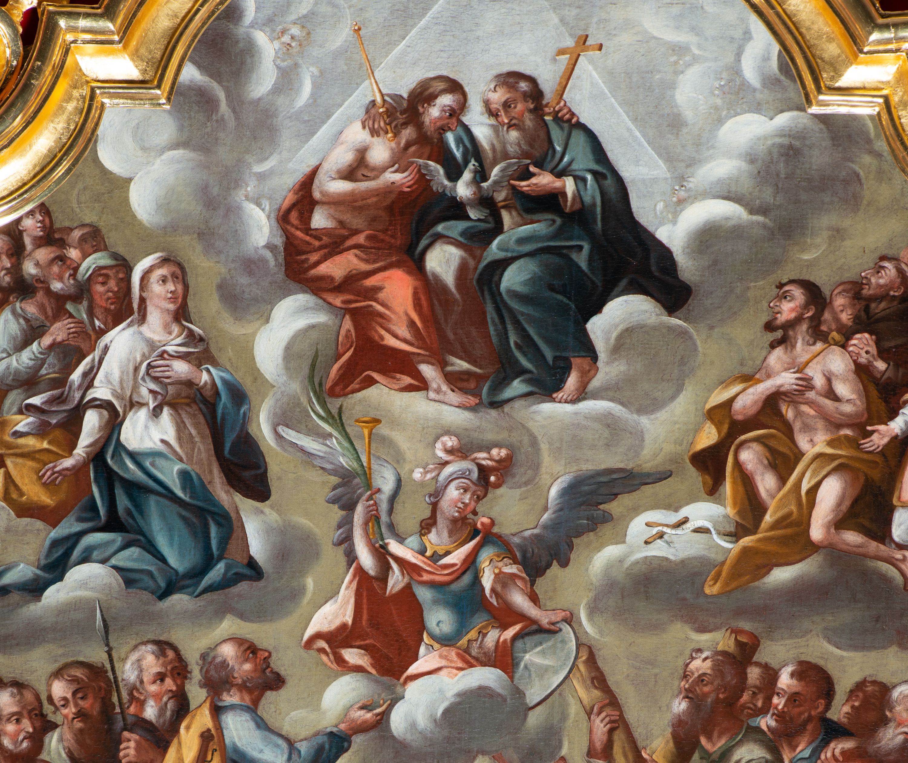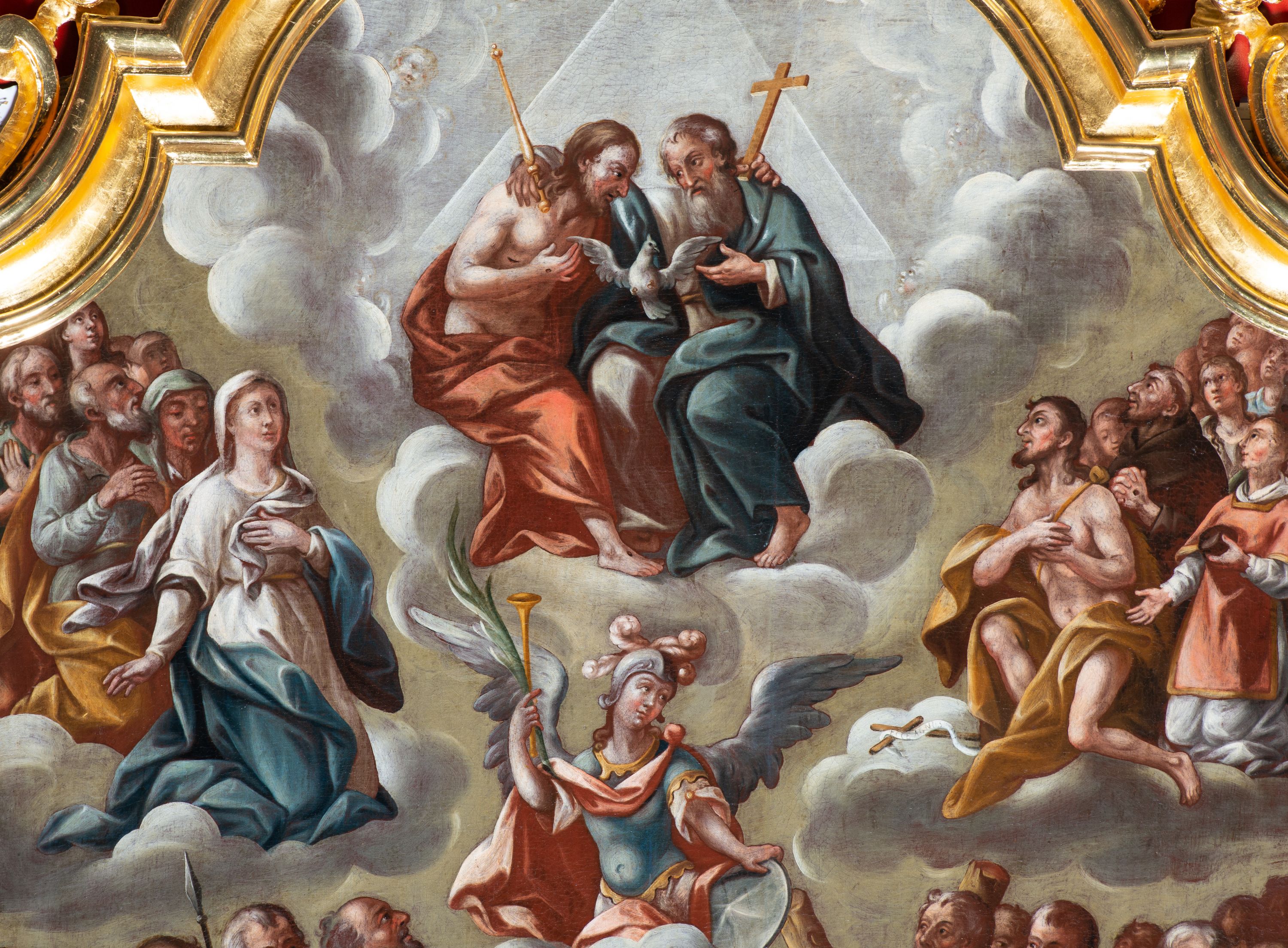 W zwieńczeniu zostali przedstawieni: Bóg Ojciec, Jezus Chrystus i gołębica Ducha Świętego. Bóg Ojciec i Jezus obejmują się jedną ręką za szyję, drugą wskazują na znajdującą się pomiędzy nimi gołębicę. Bóg Ojciec ubrany jest w białą suknię oraz niebieski płaszcz, a Jezus ma odsłonięty nagi tors, okrywa go czerwony płaszcz. Bóg Ojciec w prawej dłoni trzyma berło królewskie, a Jezus mały krzyż. W tle, pośród chmur widoczne są małe, uskrzydlone główki anielskie. Kolorystyka obrazu stonowana o szerokiej gamie barwnej i miękkim modelunku. Rama drewniana, profilowana i złocona.