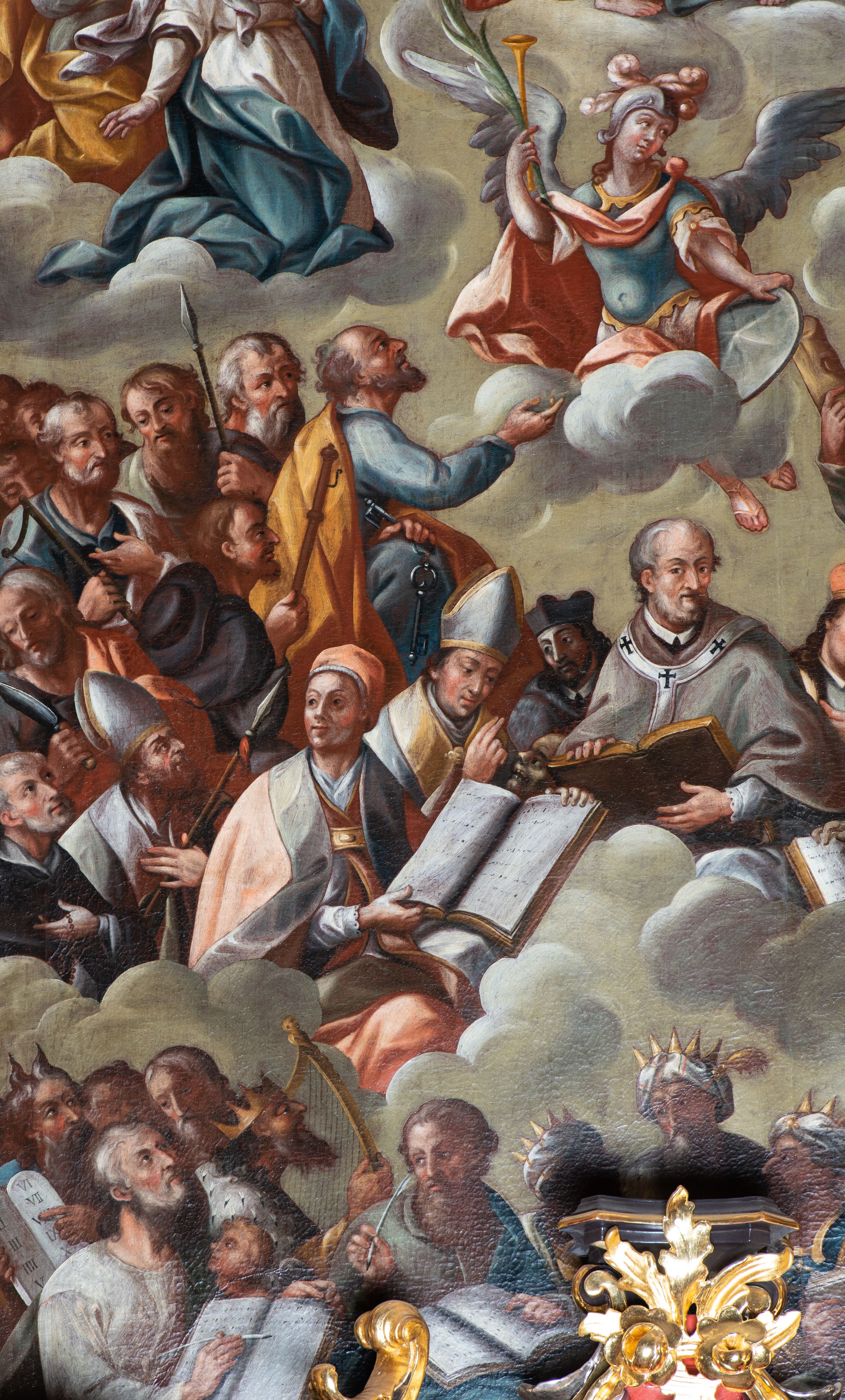 Obraz ten przedstawia triumf nieba, jego najważniejszych świętych, w tym świętych polskich. Na samym dole kompozycji, w pierwszej strefie ukazano czterech Ewangelistów z księgami i piórami w dłoniach (św. Łukasz z obrazem Matki Boskiej) w towarzystwie odpowiadających im atrybutów: człowieka, lwa, orła i woła. Pośrodku kompozycji umieszczeni są trzej królowie, według tradycji nazywani: Kasper, Melchior i Baltazar w turbanach na głowie i złotych koronach. Po lewej stronie obrazu widać Mojżesza z tablicami dekalogu oraz króla Dawida w królewskim stroju z harfą w dłoni. Z kolei po prawej stronie obrazu znajduje się polski święty, patron Krakowa – św. Florian w zbroi legionisty rzymskiego, z chorągwią i wiaderkiem z wodą w dłoniach. Obok niego stoją prarodzice: Ewa z jabłkiem oraz Adam. Ewa umieszczona jest po przekątnej Matki Boskiej w nawiązaniu do słów o Matce Bożej „To co Ewa straciła przez niewierność, Maryja odzyskała przez wiarę”. Podobnie ustawieni są Mojżesz, jako pierwszy prawodawca na dole obrazu i po przekątnej u góry św. Jan Chrzciciel, jako ostatni prorok.