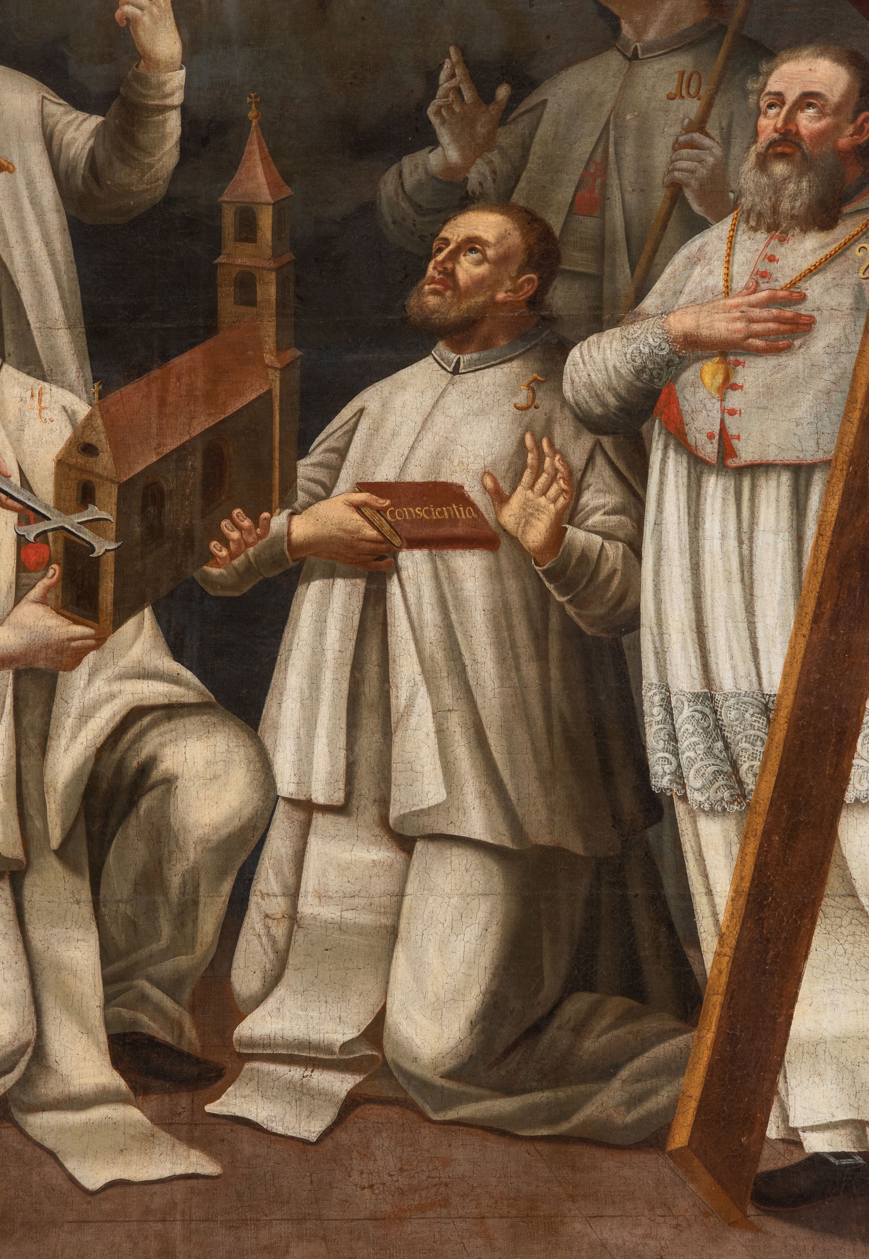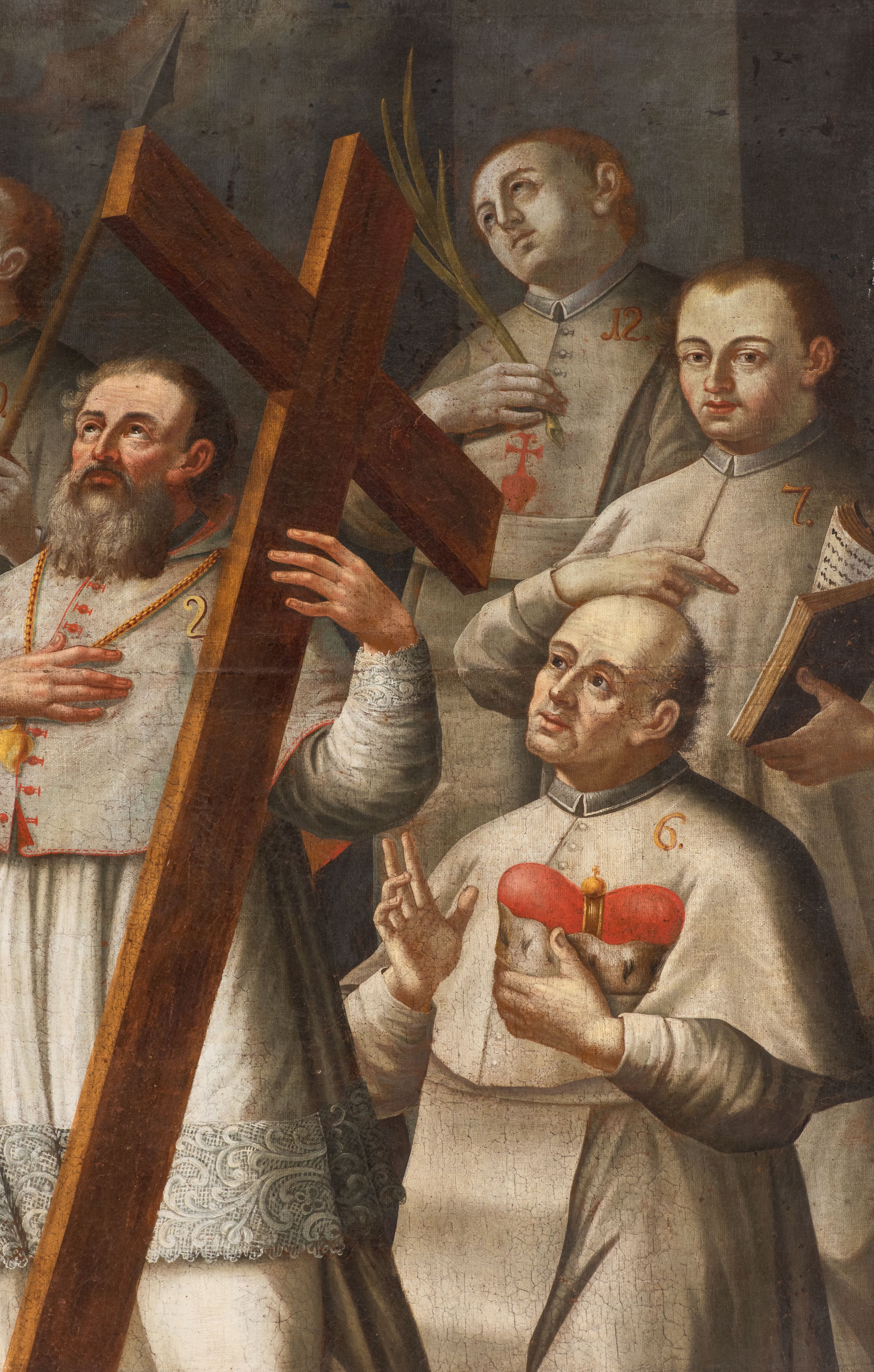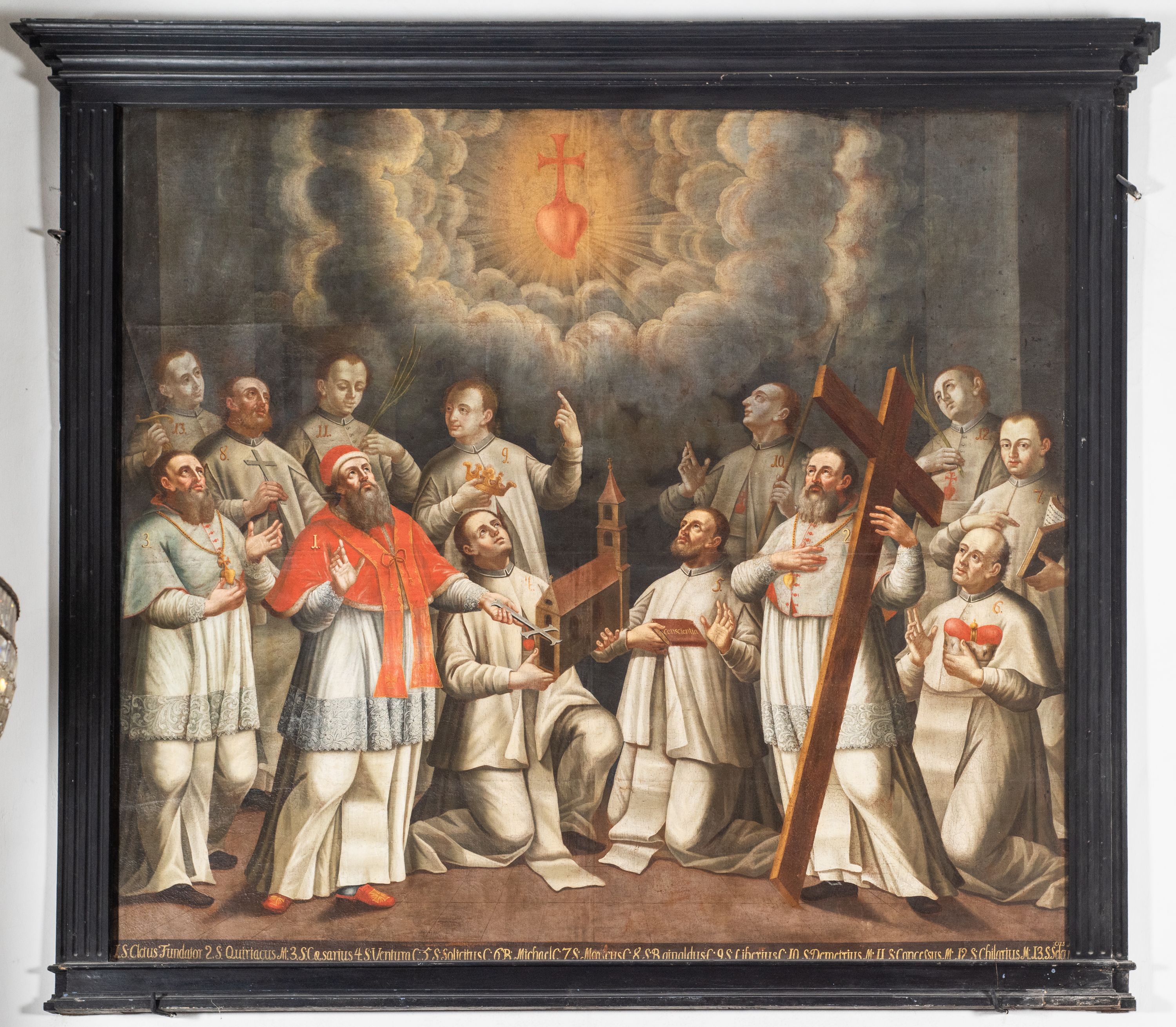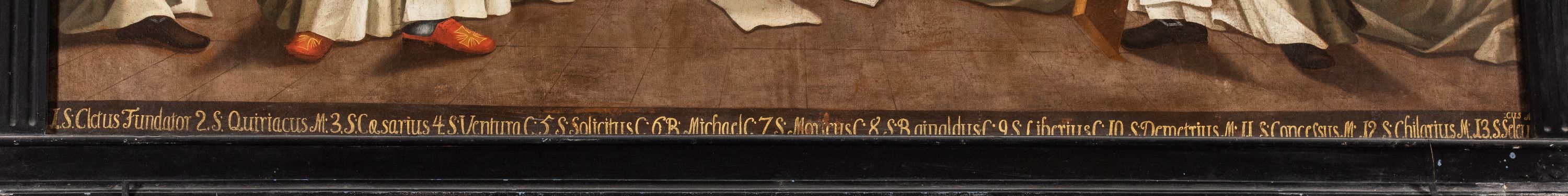 Obraz w kształcie prostokąta przedstawia trzynastu członków zakonu Fratres de Poenitentia (Marków). Po stronie lewej jest ich siedmiu, natomiast po prawej sześciu. Wszyscy zakonnicy posiadają numery do legendy z ich imionami wzdłuż dolnej krawędzi półtna. W centrum kompozycji ukazani są dwaj klęczący zakonnicy. Znajdujący się po lewej stronie, trzyma dwiema rękami brązowy model kościoła opierając go o lewe kolano, a zakonnik po prawej trzyma w lewej ręce księgę. Obok widnieją dwaj starsi mężczyźni o siwych brodach. Stojący po prawej podtrzymuje lewą ręką wysoki drewniany krzyż, a stojący po stronie lewej prawą ręką wykonuje gest błogosławieństwa, a w lewej trzyma krucyfiks. Jest on ubrany w czerwoną: pelerynę, czapkę piuskę oraz buty, a na szyi ma stułę. Pozostali zakonnicy stoją wokół klęczących mężczyzn. Wszyscy ubrani są w białe habity, a ich wzrok zwrócony jest ku świetlistemu niebu , gdzie wśród obłoków widnieje godło zakonu marków. Tło kompozycji stanowi brunatne podłoże oraz ciemne niebo. Rama drewniana na cokole, flankowana kanelowanymi pilastrami, zwieńczona profilowanym gzymsem, polichromowana na czarno, w górnej części profil złocony. Wzdłuż dolnej krawędzi płótna inskrypcja: „I.S: Cletus Fundator 2. S: Quiriacus M: 3. S: Cesarius 4. S: Ventura C: 5 S: Solicitus C: 6. B: Michael C: 7. S: Moricus C: 8. S: Rainaldus C: 9. S: Liberius C: 10. S: Demetrius C: 11. S: Conoesus C: 12. S: Chilarius C: 13. S: Salerius.”