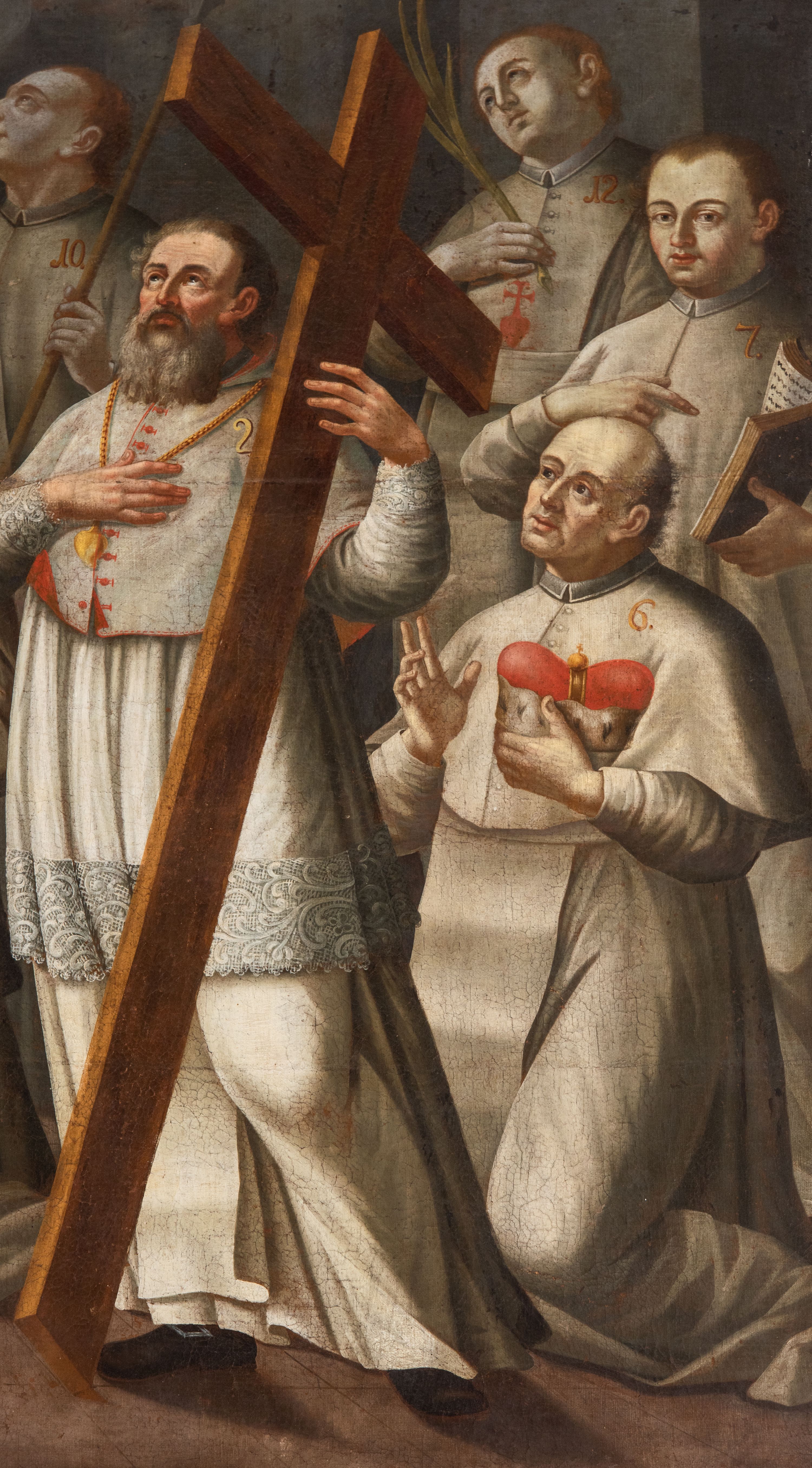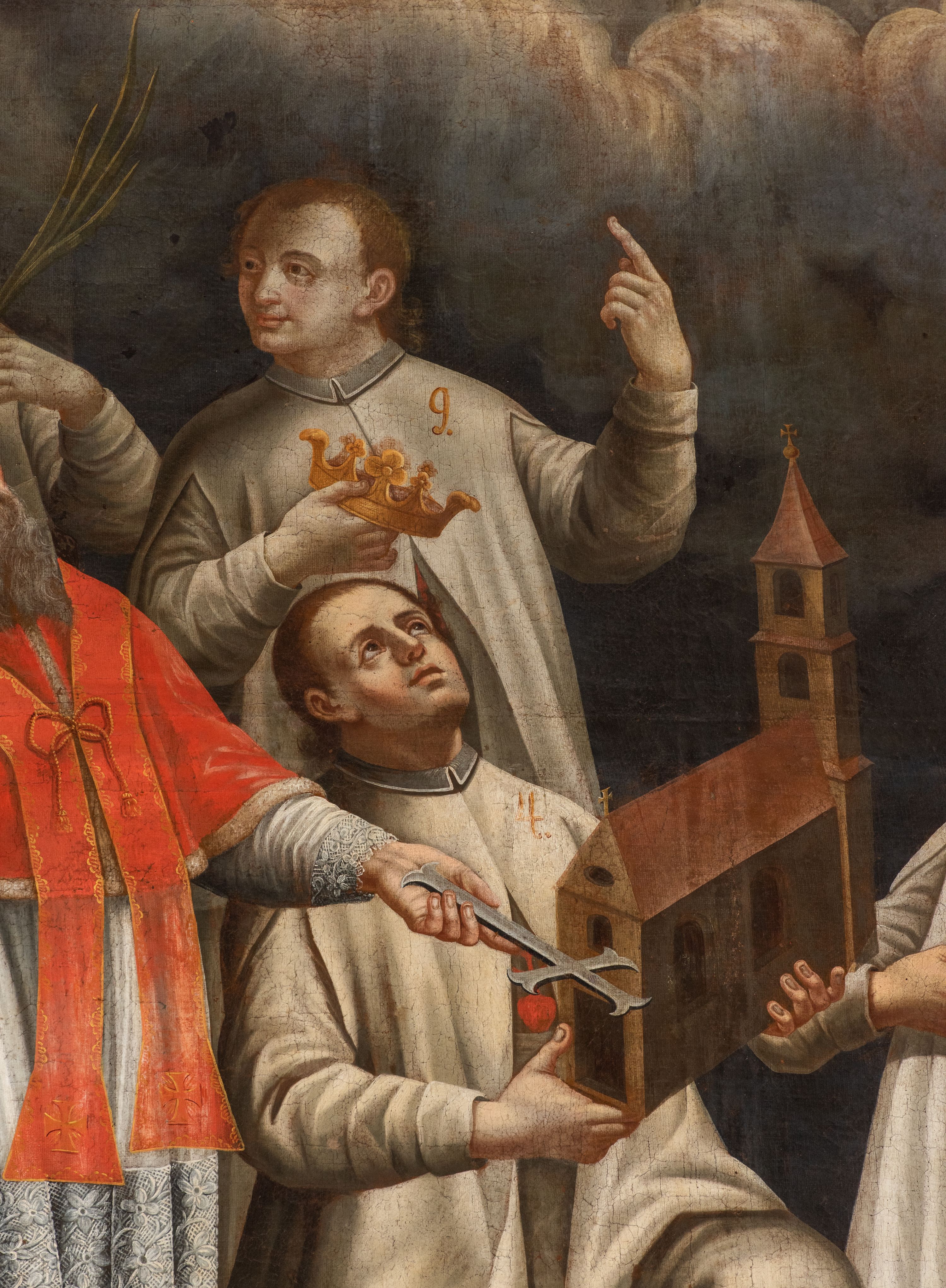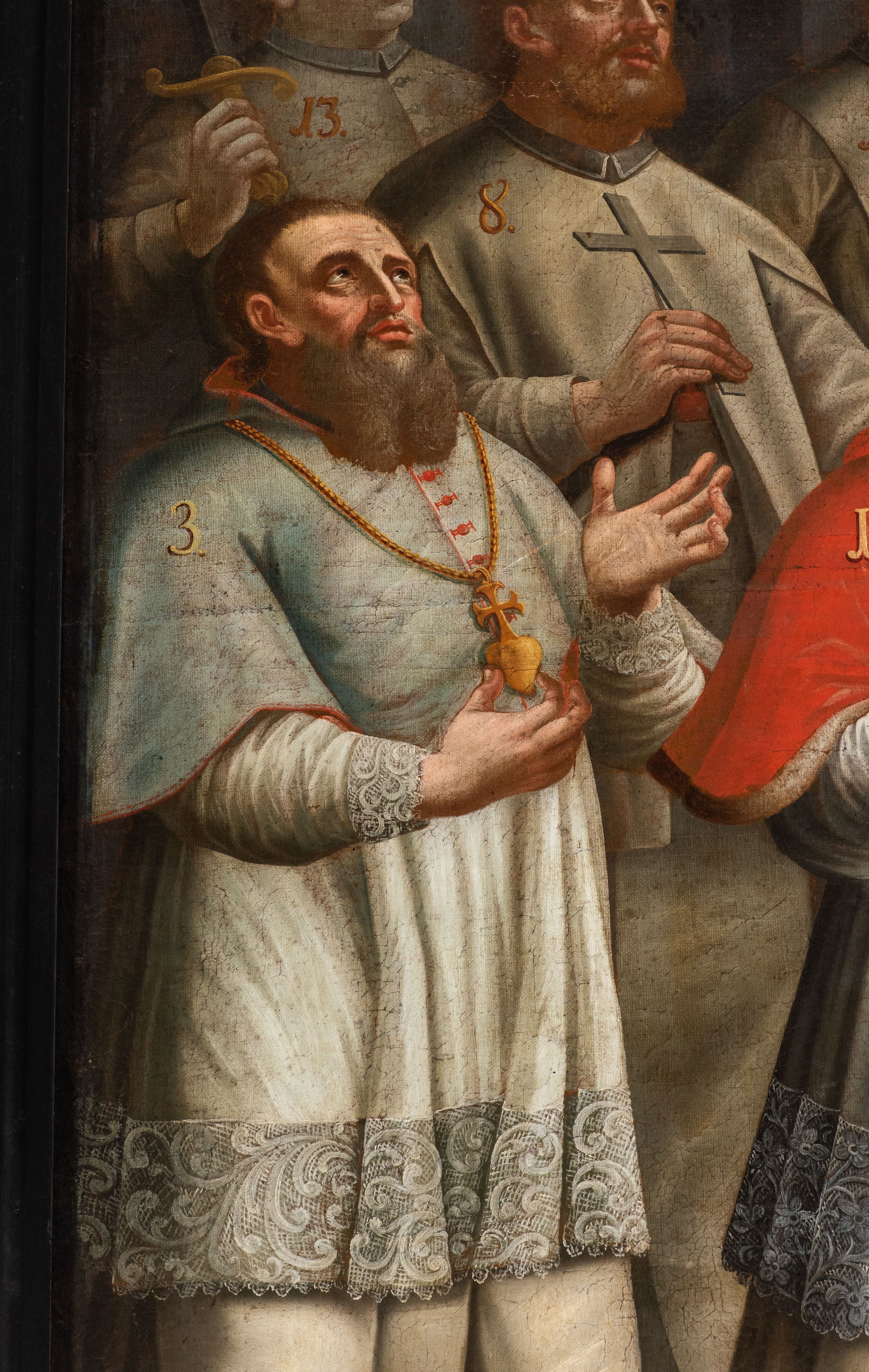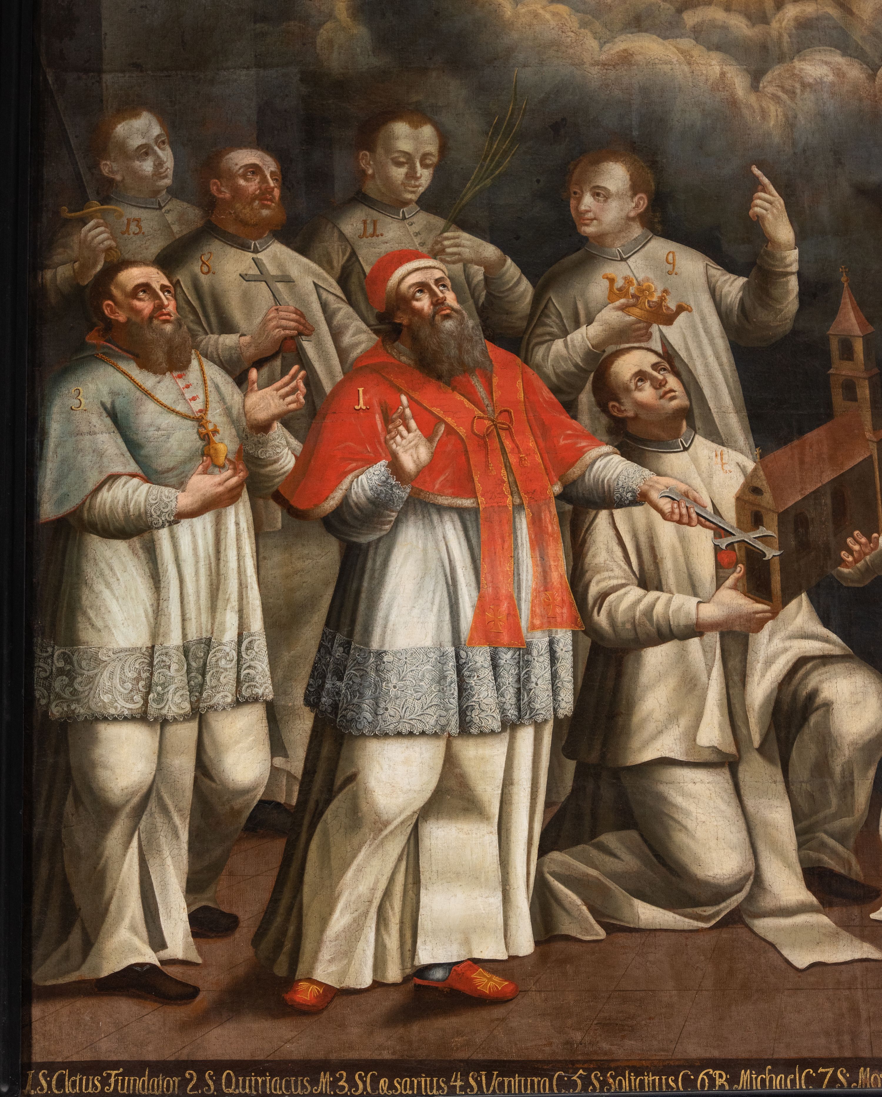 Obraz w kształcie prostokąta przedstawia trzynastu członków zakonu Fratres de Poenitentia (Marków). Po stronie lewej jest ich siedmiu, natomiast po prawej sześciu. Wszyscy zakonnicy posiadają numery do legendy z ich imionami wzdłuż dolnej krawędzi półtna. W centrum kompozycji ukazani są dwaj klęczący zakonnicy. Znajdujący się po lewej stronie, trzyma dwiema rękami brązowy model kościoła opierając go o lewe kolano, a zakonnik po prawej trzyma w lewej ręce księgę. Obok widnieją dwaj starsi mężczyźni o siwych brodach. Stojący po prawej podtrzymuje lewą ręką wysoki drewniany krzyż, a stojący po stronie lewej prawą ręką wykonuje gest błogosławieństwa, a w lewej trzyma krucyfiks. Jest on ubrany w czerwoną: pelerynę, czapkę piuskę oraz buty, a na szyi ma stułę. Pozostali zakonnicy stoją wokół klęczących mężczyzn. Wszyscy ubrani są w białe habity, a ich wzrok zwrócony jest ku świetlistemu niebu , gdzie wśród obłoków widnieje godło zakonu marków. Tło kompozycji stanowi brunatne podłoże oraz ciemne niebo. Rama drewniana na cokole, flankowana kanelowanymi pilastrami, zwieńczona profilowanym gzymsem, polichromowana na czarno, w górnej części profil złocony. Wzdłuż dolnej krawędzi płótna inskrypcja: „I.S: Cletus Fundator 2. S: Quiriacus M: 3. S: Cesarius 4. S: Ventura C: 5 S: Solicitus C: 6. B: Michael C: 7. S: Moricus C: 8. S: Rainaldus C: 9. S: Liberius C: 10. S: Demetrius C: 11. S: Conoesus C: 12. S: Chilarius C: 13. S: Salerius.”