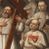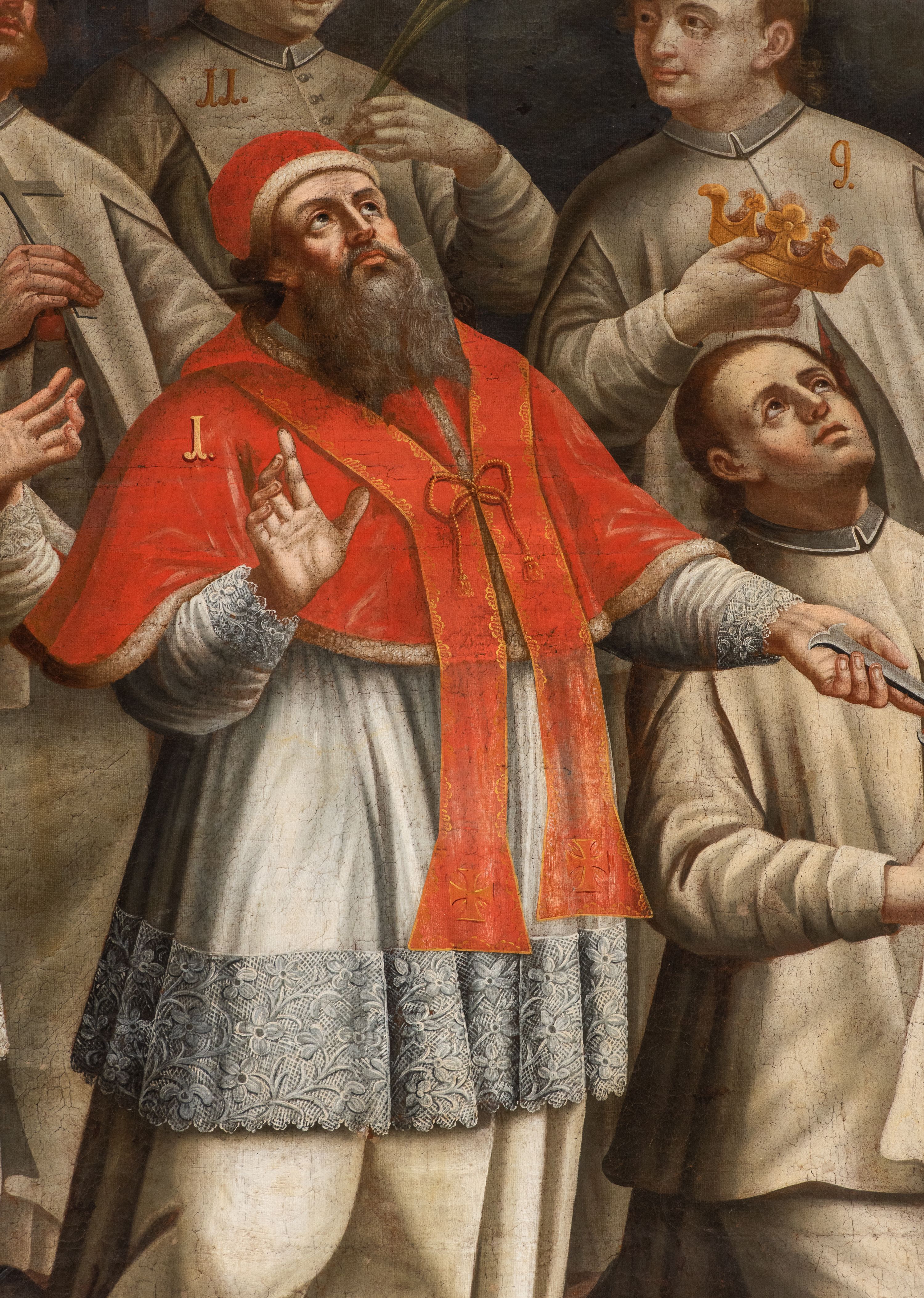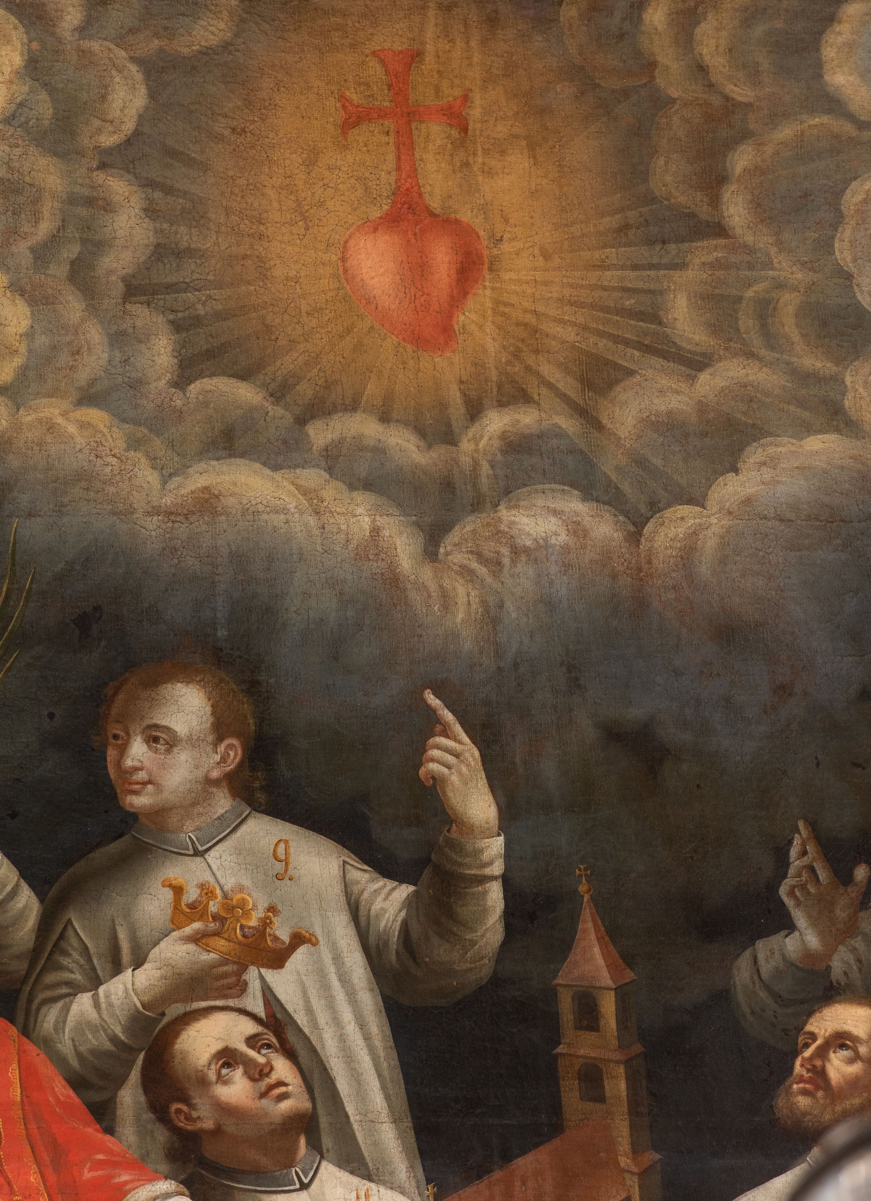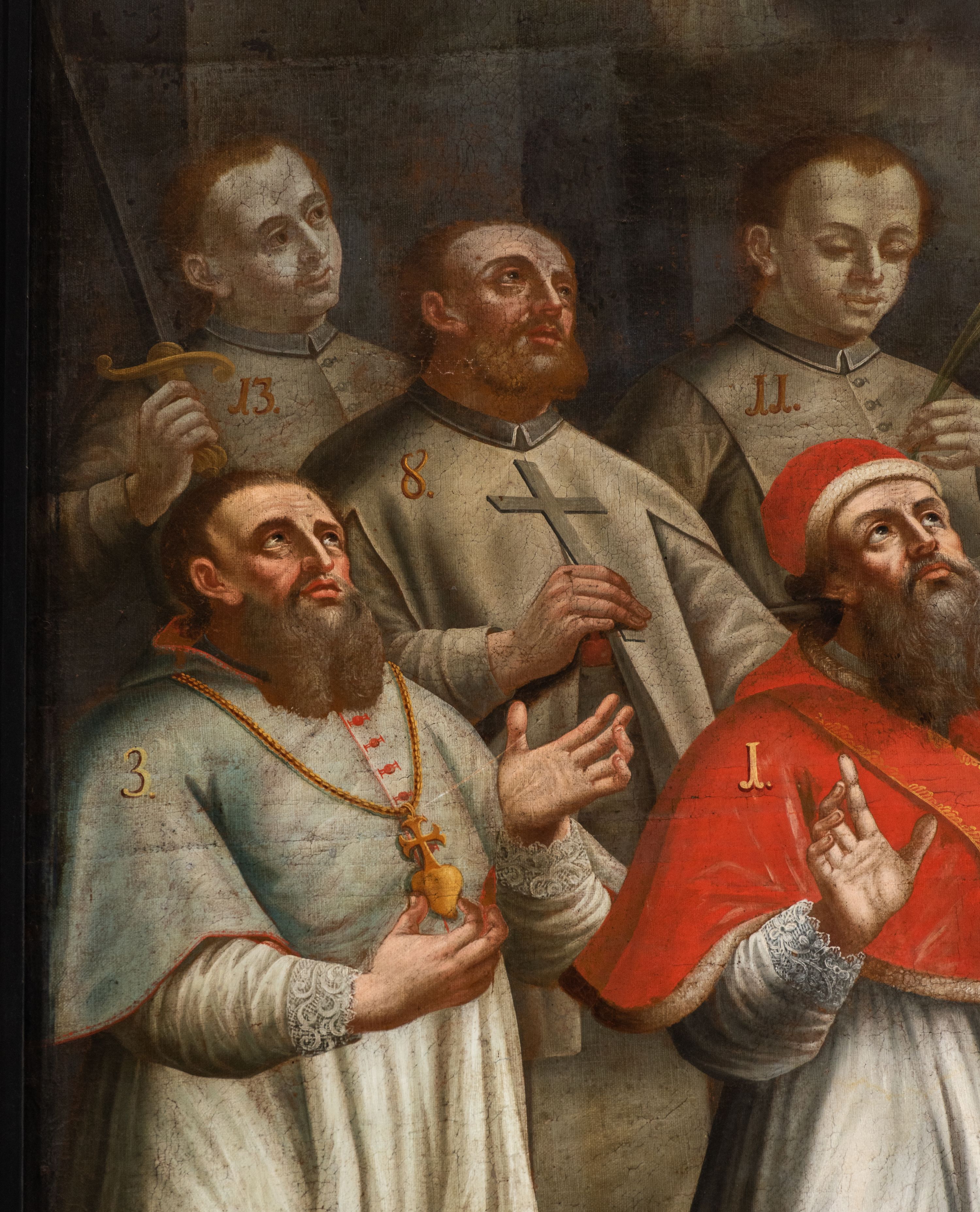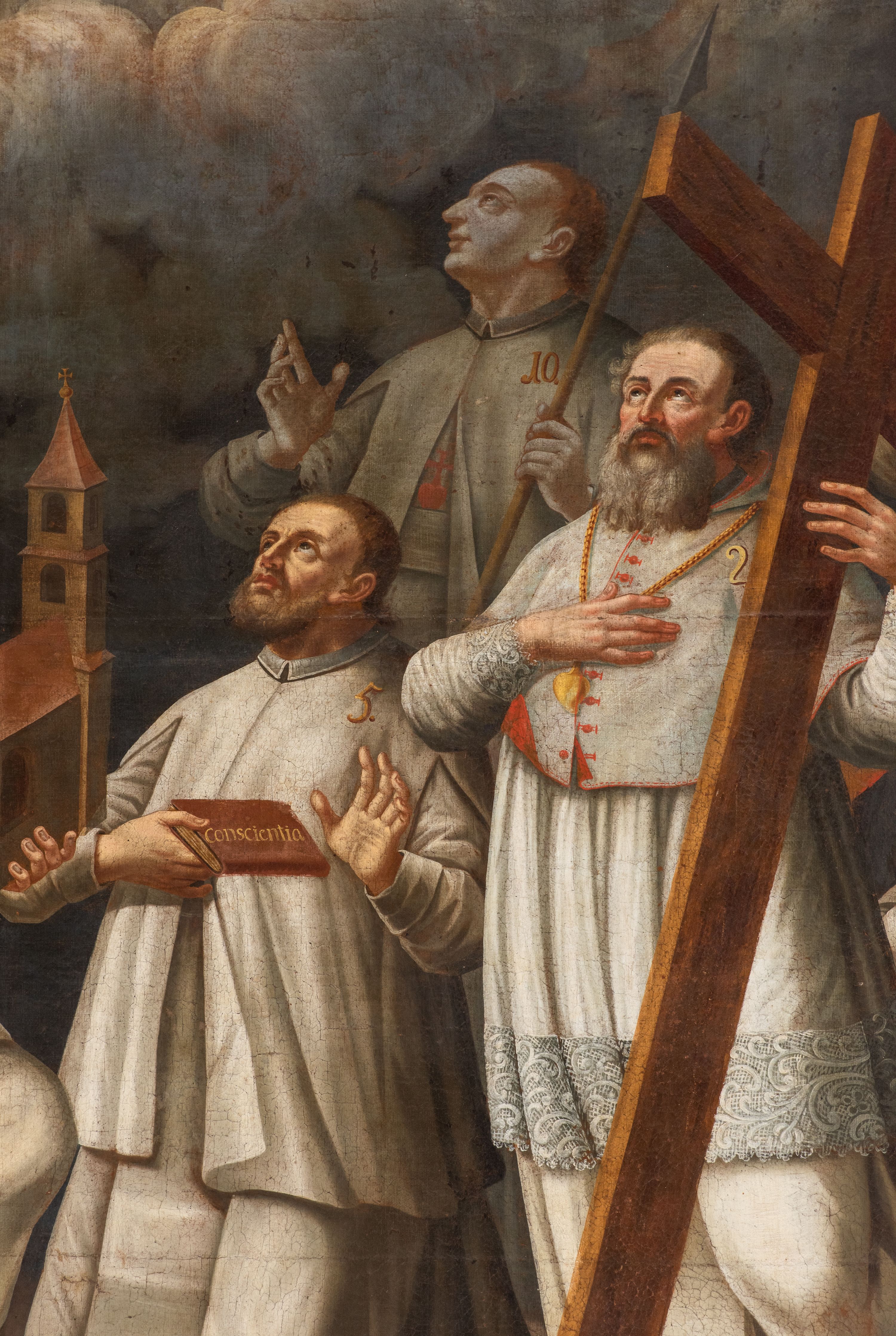 Obraz w kształcie prostokąta przedstawia trzynastu członków zakonu Fratres de Poenitentia (Marków). Po stronie lewej jest ich siedmiu, natomiast po prawej sześciu. Wszyscy zakonnicy posiadają numery do legendy z ich imionami wzdłuż dolnej krawędzi półtna. W centrum kompozycji ukazani są dwaj klęczący zakonnicy. Znajdujący się po lewej stronie, trzyma dwiema rękami brązowy model kościoła opierając go o lewe kolano, a zakonnik po prawej trzyma w lewej ręce księgę. Obok widnieją dwaj starsi mężczyźni o siwych brodach. Stojący po prawej podtrzymuje lewą ręką wysoki drewniany krzyż, a stojący po stronie lewej prawą ręką wykonuje gest błogosławieństwa, a w lewej trzyma krucyfiks. Jest on ubrany w czerwoną: pelerynę, czapkę piuskę oraz buty, a na szyi ma stułę. Pozostali zakonnicy stoją wokół klęczących mężczyzn. Wszyscy ubrani są w białe habity, a ich wzrok zwrócony jest ku świetlistemu niebu , gdzie wśród obłoków widnieje godło zakonu marków. Tło kompozycji stanowi brunatne podłoże oraz ciemne niebo. Rama drewniana na cokole, flankowana kanelowanymi pilastrami, zwieńczona profilowanym gzymsem, polichromowana na czarno, w górnej części profil złocony. Wzdłuż dolnej krawędzi płótna inskrypcja: „I.S: Cletus Fundator 2. S: Quiriacus M: 3. S: Cesarius 4. S: Ventura C: 5 S: Solicitus C: 6. B: Michael C: 7. S: Moricus C: 8. S: Rainaldus C: 9. S: Liberius C: 10. S: Demetrius C: 11. S: Conoesus C: 12. S: Chilarius C: 13. S: Salerius.”