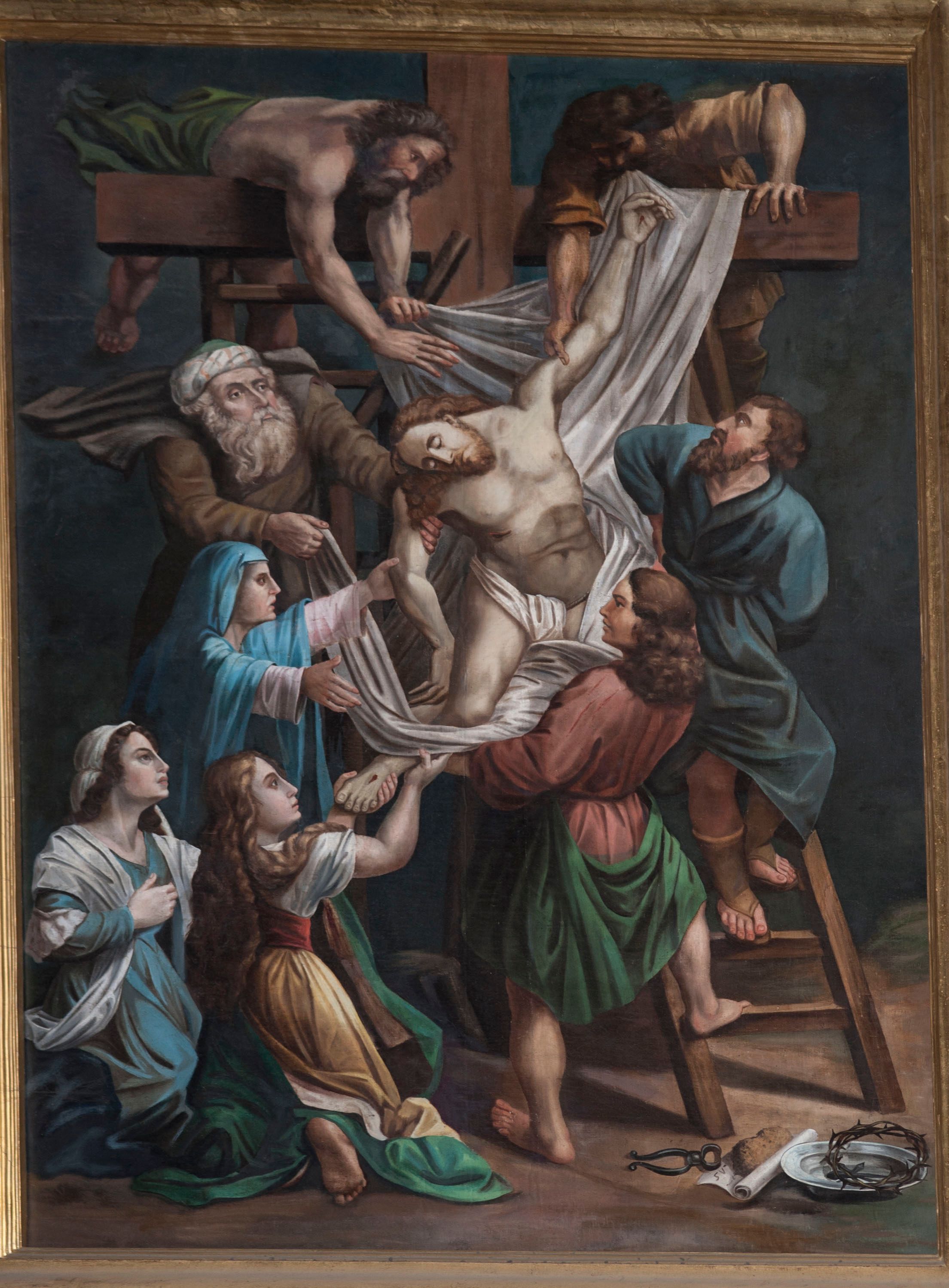 Obraz w formie stojącego prostokąta. W centrum kompozycji znajduje się krzyż, na którego belce poprzecznej opiera się dwóch mężczyzn, zdejmujących bezwładne ciało Chrystusa zsuwające się na białej tkaninie w ramiona postaci św. Jana stojącego tyłem, z lewą nogą opartą na szczeblu drabiny. Obok, w prawej części obrazu, na drabinie stoi dojrzały mężczyzna zwrócony frontalnie, z głową skierowaną w górę. W lewej części kompozycji dwie klęczące kobiety, z których jedna – Maria Magdalena, odwrócona jest tyłem, obiema rękami trzyma stopę Jezusa. Nad nimi Maria ukazana z profilu, z wyciągniętymi do przodu rękami, lewą trzyma Chrystusa za ramię. Ponad nią stoi starzec skierowany w trzech czwartych w lewo, prawą ręką trzyma tkaninę, lewą ramię Jezusa. Chrystus ukazany jest jako nagi, w partii bioder przewiązany perizonium. Oprócz św. Jana, pozostali mężczyźni ukazani są jako dojrzali, z brodami i krótkimi włosami, większość ubrana w tuniki sięgające kolan, przepasane w talii. Kobiety ubrane są w suknie przepasane w talii oraz płaszcze, część z nich z welonami na głowie. W prawym dolnym rogu obrazu leżą narzędzia męki – korona cierniona, metalowa miska z gwoździami, gąbka, obcęgi i rozwinięty zwój z sygnaturą „SV”. Scena ukazana na tle pejzażu z ciemnym, granatowym niebem.