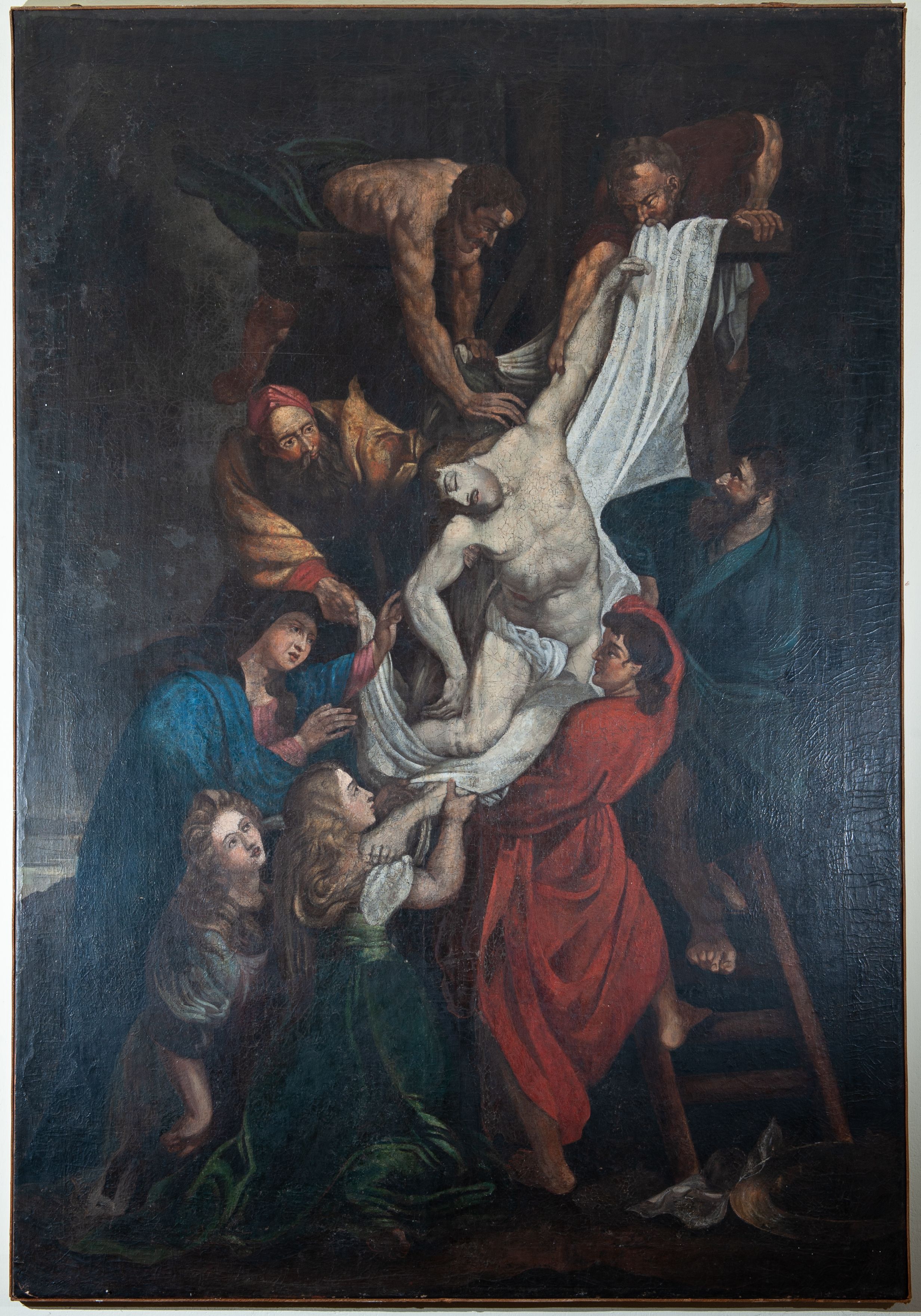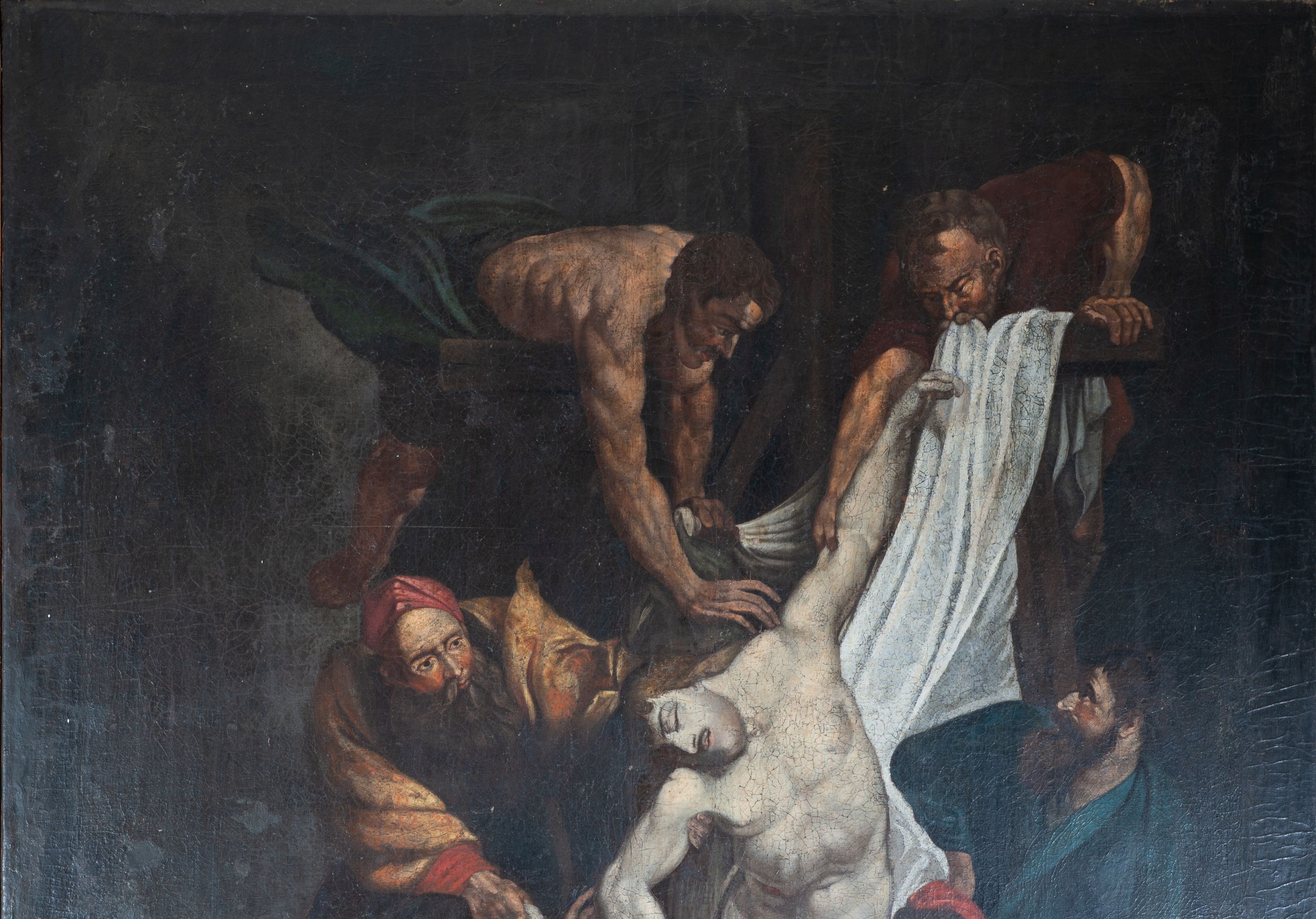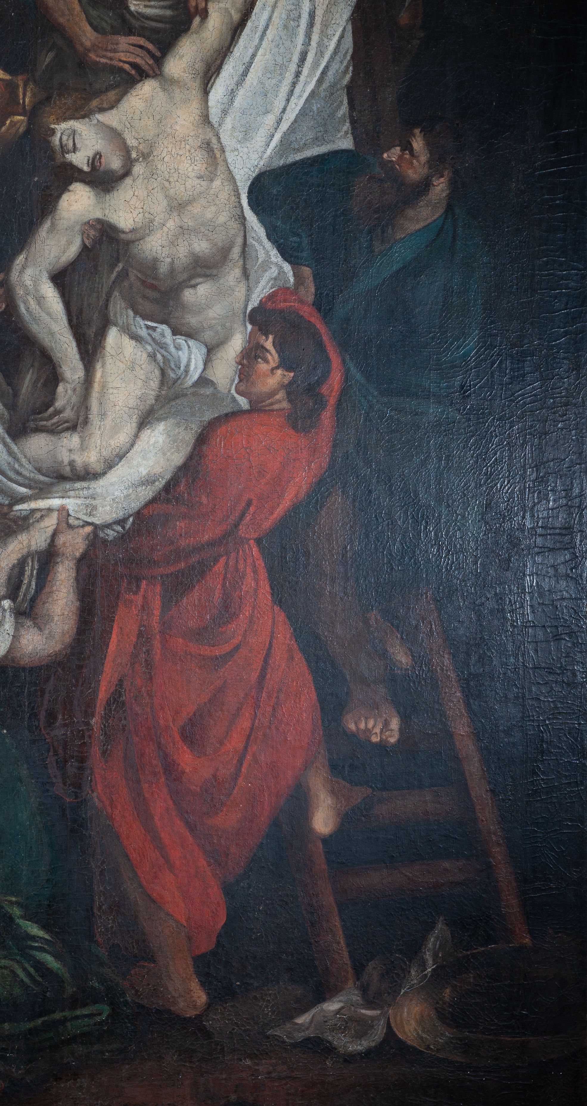 Wielofigurowa dynamiczna scena o kompozycji przekątniowej ukazująca zdjęcie ciała martwego Chrystusa z krzyża. Jest to odtworzenie obrazu środkowego tryptyku przechowywanego w kaplicy arkenbuzerów w katedrze w Antwerpii, namalowanego przez P.P. Rubensa w roku 1614.