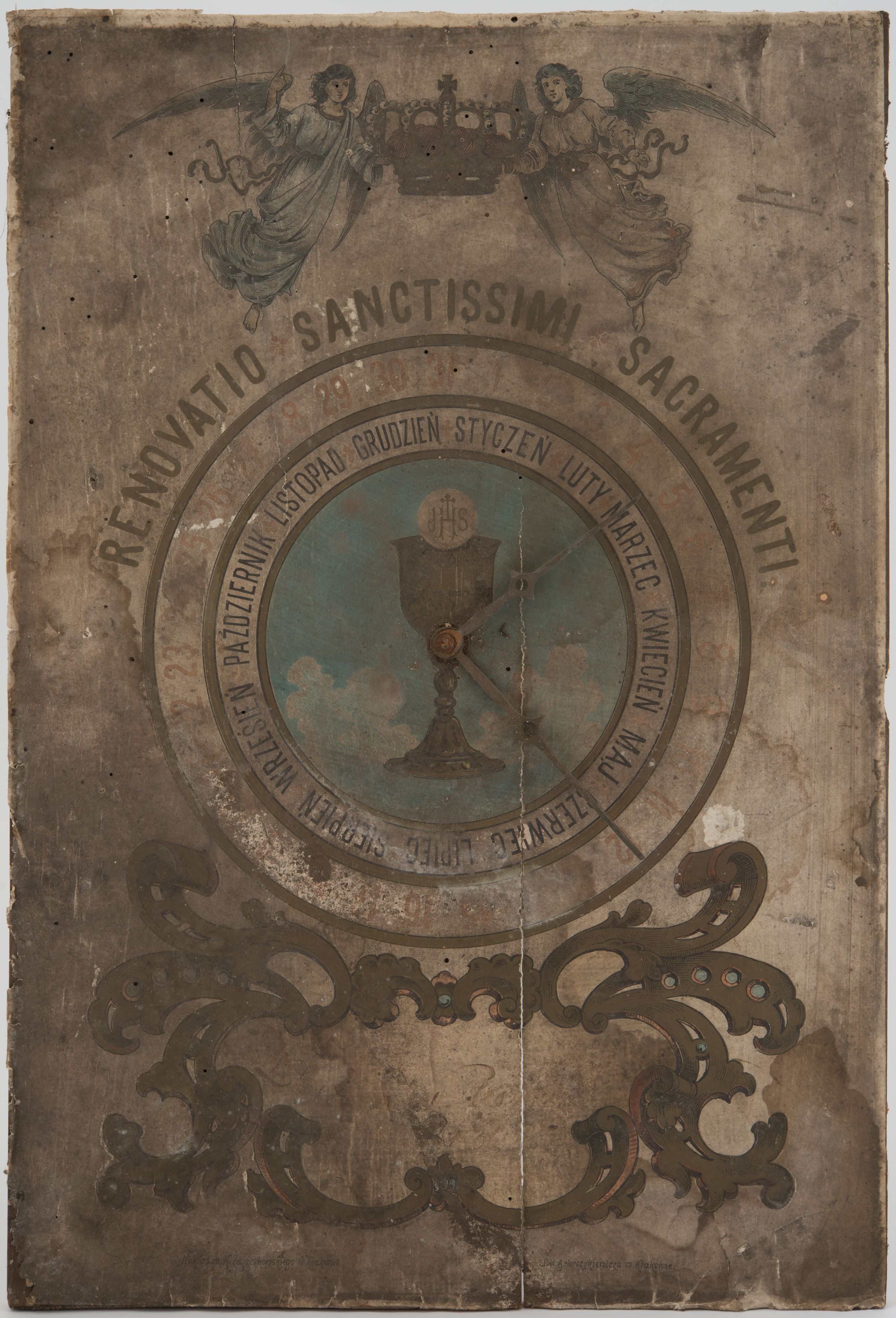 Zegar w kształcie stojącego prostokąta. W części centralnej okrągła tarcza, pośrodku kielich z hostią na tle błękitnego nieba, od którego odchodzą dwie fantazyjnie wycięte wskazówki. Wokół tarczy dwa okręgi, w pierwszym nazwy miesiąców, w drugim cyfry od 1 do 31. Powyżej napis „RENOVATIO * SANCTISSIMI * SACRAMENTI”, a nad nim dwa anioły podtrzymujące zamkniętą koronę. Anioły o owalnych twarzach, młodzieńczych rysach i średniej długości bujnych włosach. Ubrane w długie suknie z długimi rękawami, przewiązane w pasie wstążką. Rysunek oddany sumarycznie. W dolnej części kompozycji stylizowany, ornamentalny kartusz, w polu słaboczytelny napis i data „1906”. Poniżej sygnatury: „Nakładem K(azimierza) Zajączkowskiego w Krakowie.” oraz „Lit(itografia) A(?) S(D?)urczykiewicza w Krakowie.