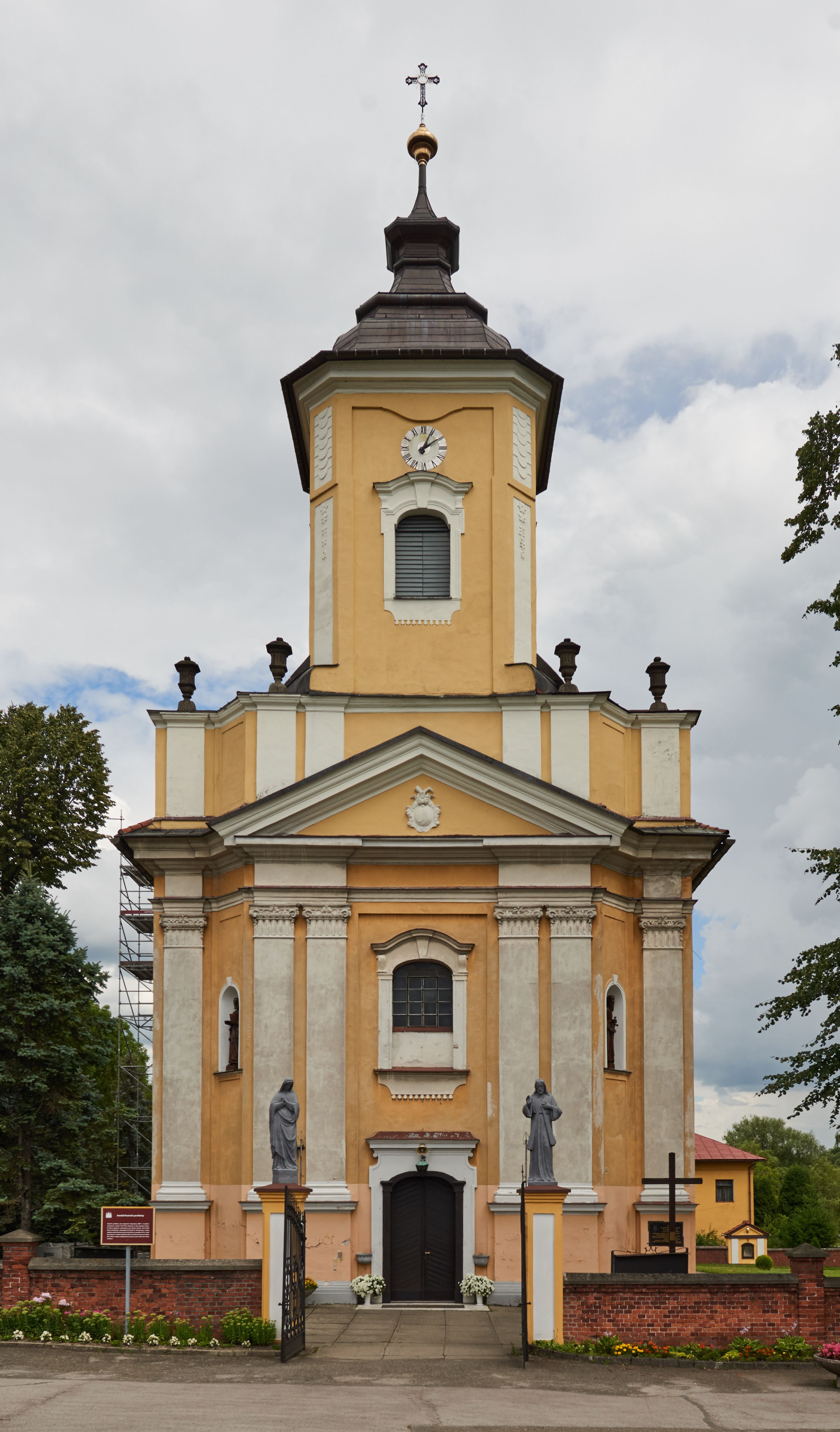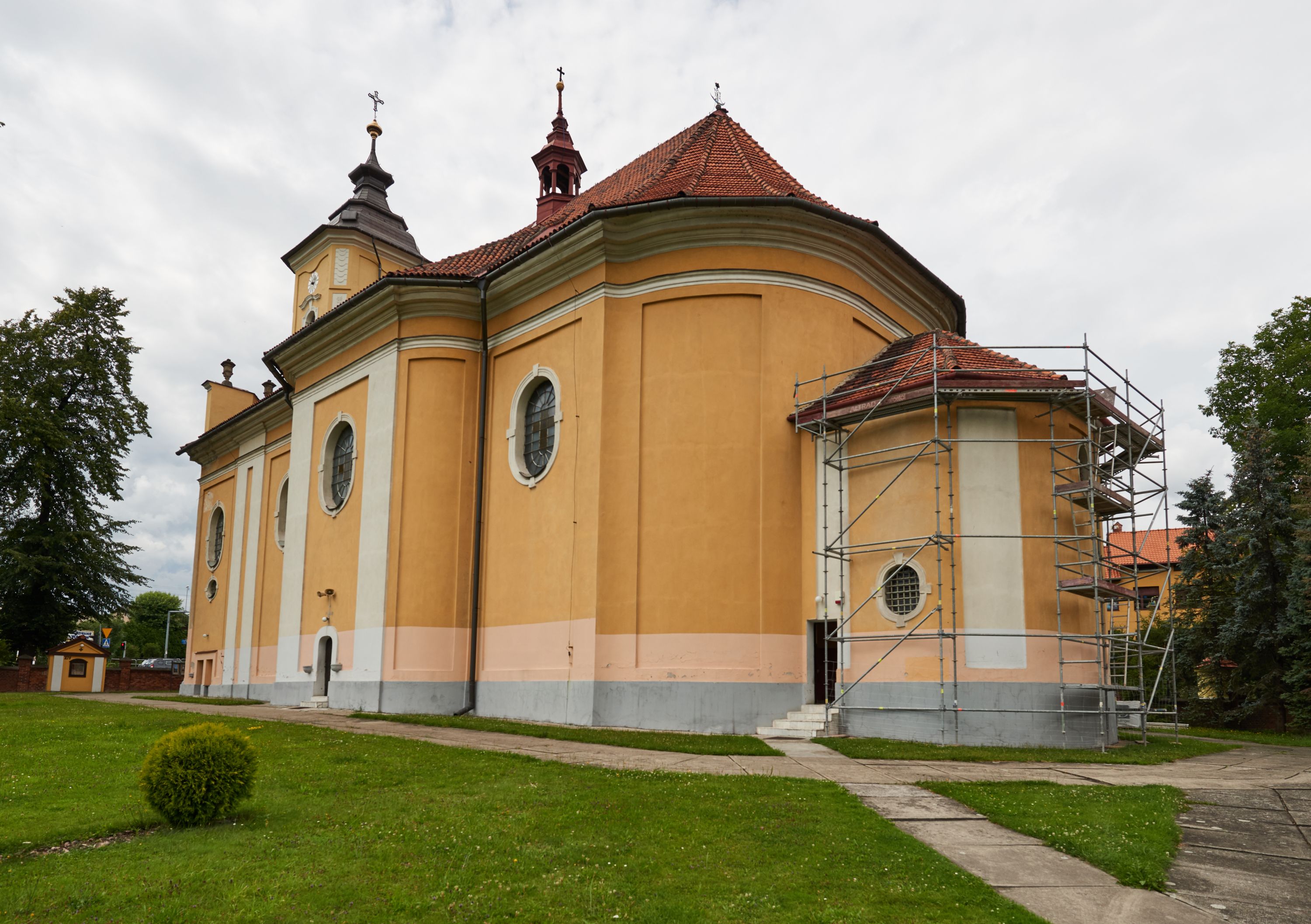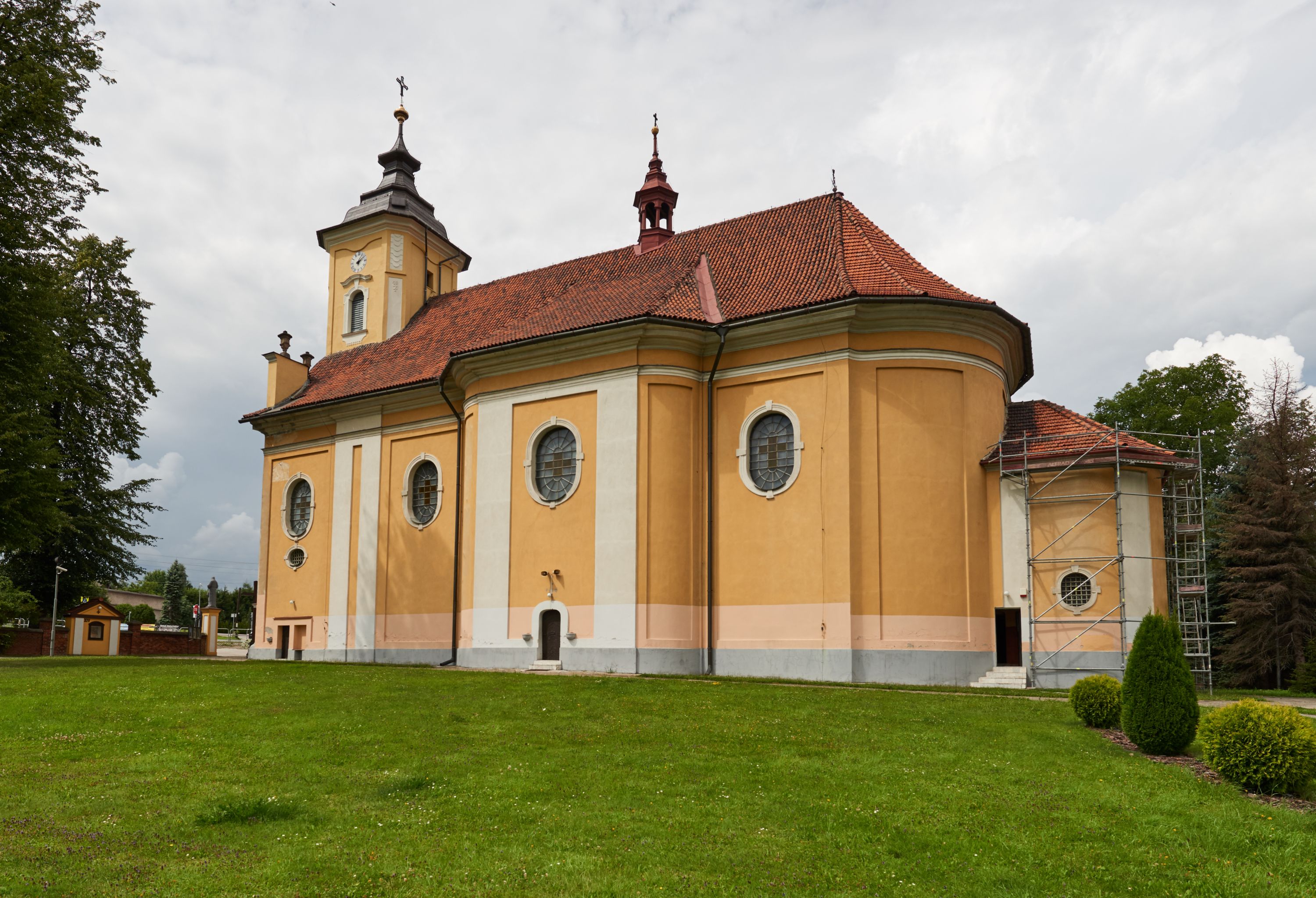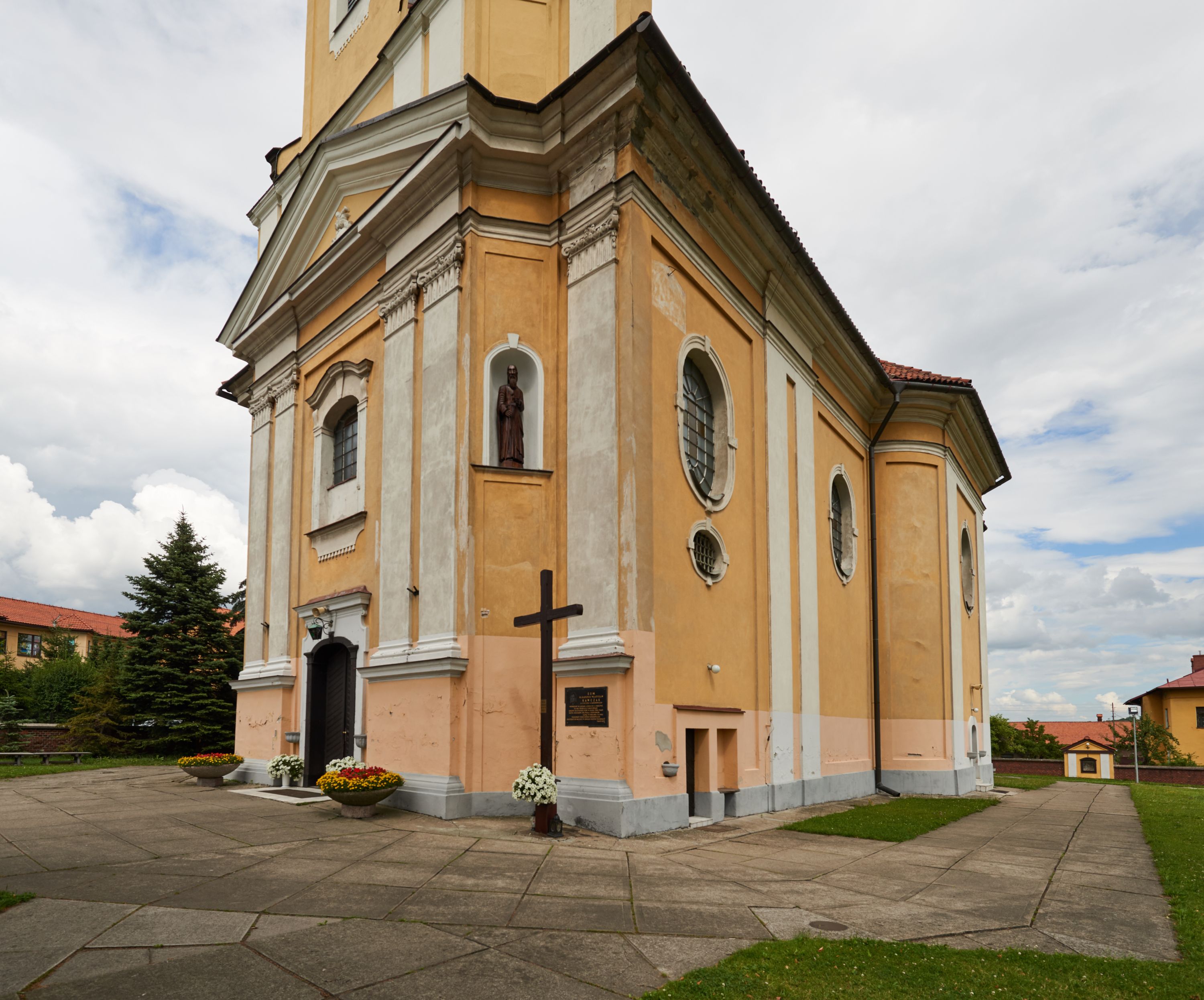 Północna, zachodnia i południowa ściana wieży przeprute są otworami okiennymi w kształcie stojącego prostokąta zamkniętego łukiem odcinkowym. Okna mają obramienia w kształcie stojących prostokątów z uszakami w górnych narożach, zwieńczone są belkowaniem w formie łuku odcinkowego z kluczem pośrodku i parą wolutowych wsporników po bokach fryzu. Podwieszenie ma formę fartucha w kształcie leżącego prostokąta o wklęsłych dolnych narożach i dolnej krawędzi zdobionej motywem lambrekinu. Powyżej otworów okiennych znajdują się okrągłe tarcze zegarowe. Pola ściętych naroży wieży zdobi ornamentyka cekinowa i kampanule. Korpus nawowy przykrywa dwuspadowy dach zakończony pięciopołaciowo nad prezbiterium i trójpołaciowo nad końcami transeptu, kryty dachówką. Na skrzyżowaniu korpusu nawowego i transeptu ulokowano obitą blachą wieżyczkę na sygnaturkę. Kolorystyka tynków kościoła utrzymana jest w odcieniu ugru, w dolnej partii różu, detal architektoniczny i ornamentyka w bieli.