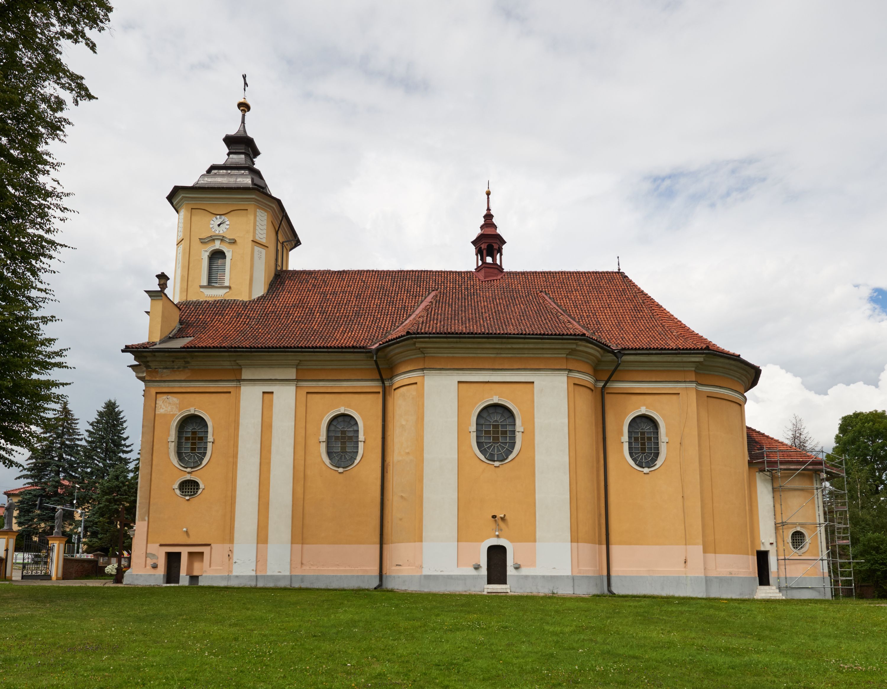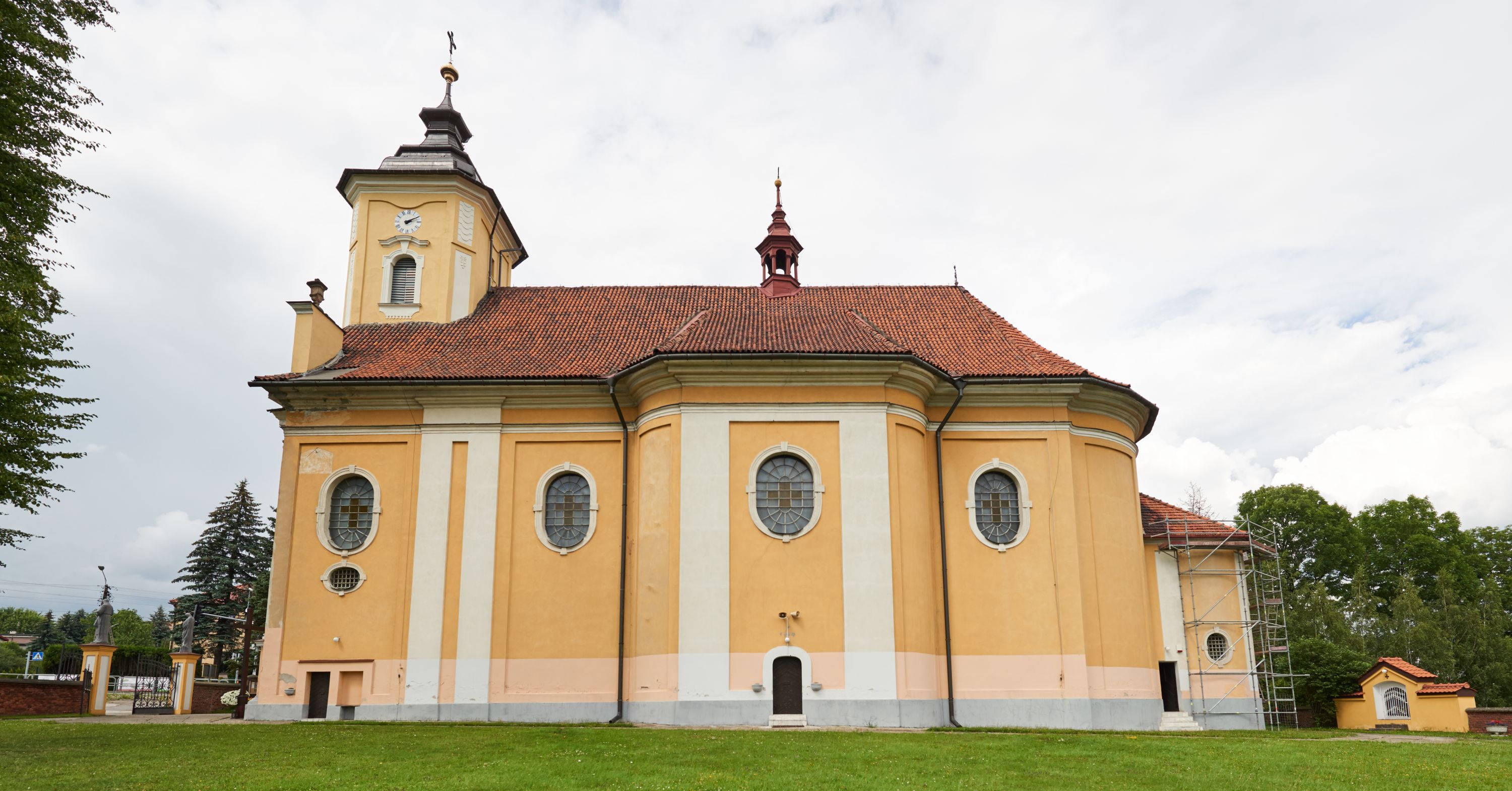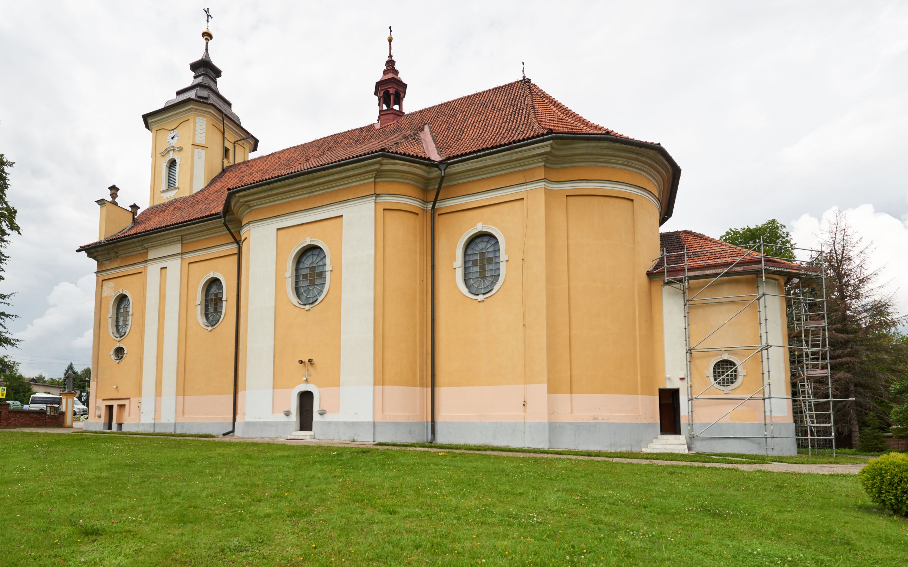 Północna, zachodnia i południowa ściana wieży przeprute są otworami okiennymi w kształcie stojącego prostokąta zamkniętego łukiem odcinkowym. Okna mają obramienia w kształcie stojących prostokątów z uszakami w górnych narożach, zwieńczone są belkowaniem w formie łuku odcinkowego z kluczem pośrodku i parą wolutowych wsporników po bokach fryzu. Podwieszenie ma formę fartucha w kształcie leżącego prostokąta o wklęsłych dolnych narożach i dolnej krawędzi zdobionej motywem lambrekinu. Powyżej otworów okiennych znajdują się okrągłe tarcze zegarowe. Pola ściętych naroży wieży zdobi ornamentyka cekinowa i kampanule. Korpus nawowy przykrywa dwuspadowy dach zakończony pięciopołaciowo nad prezbiterium i trójpołaciowo nad końcami transeptu, kryty dachówką. Na skrzyżowaniu korpusu nawowego i transeptu ulokowano obitą blachą wieżyczkę na sygnaturkę. Kolorystyka tynków kościoła utrzymana jest w odcieniu ugru, w dolnej partii różu, detal architektoniczny i ornamentyka w bieli.