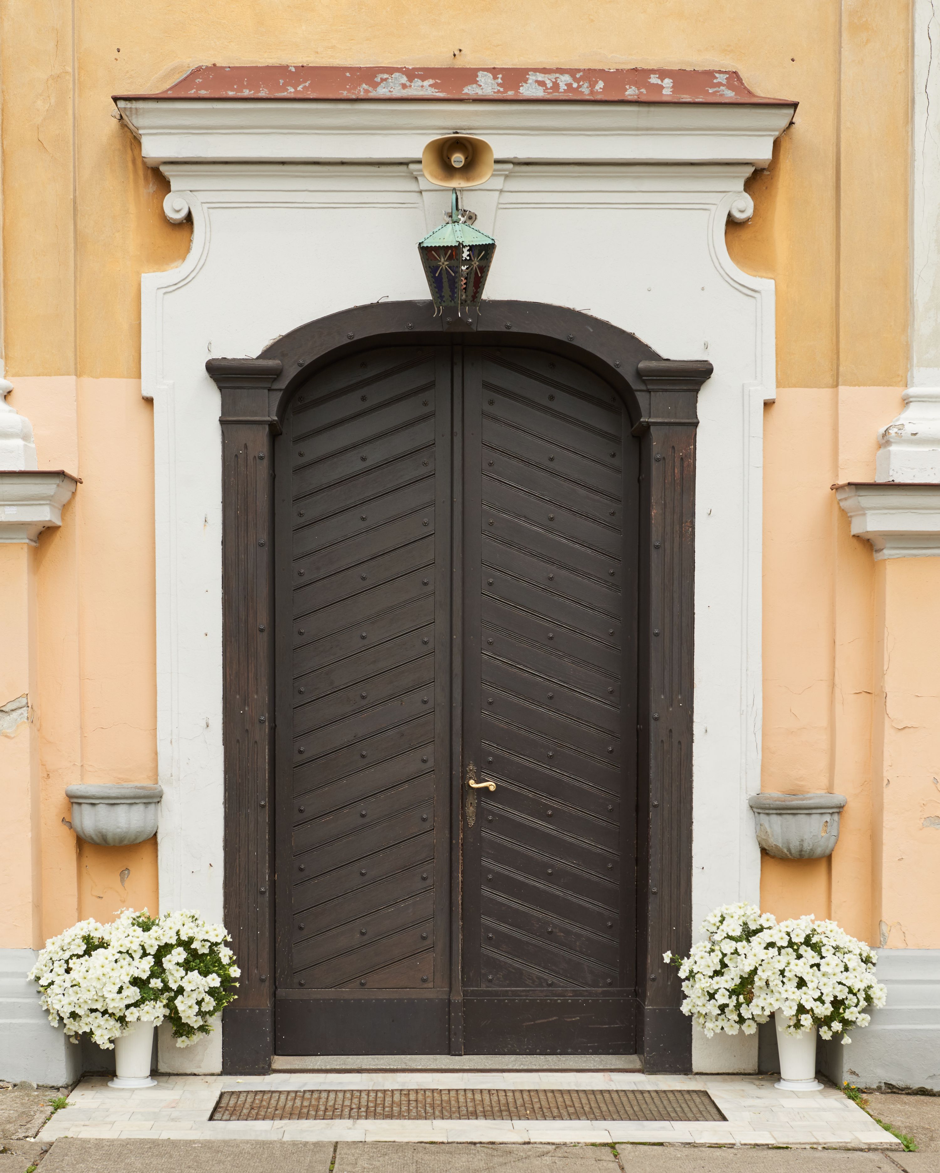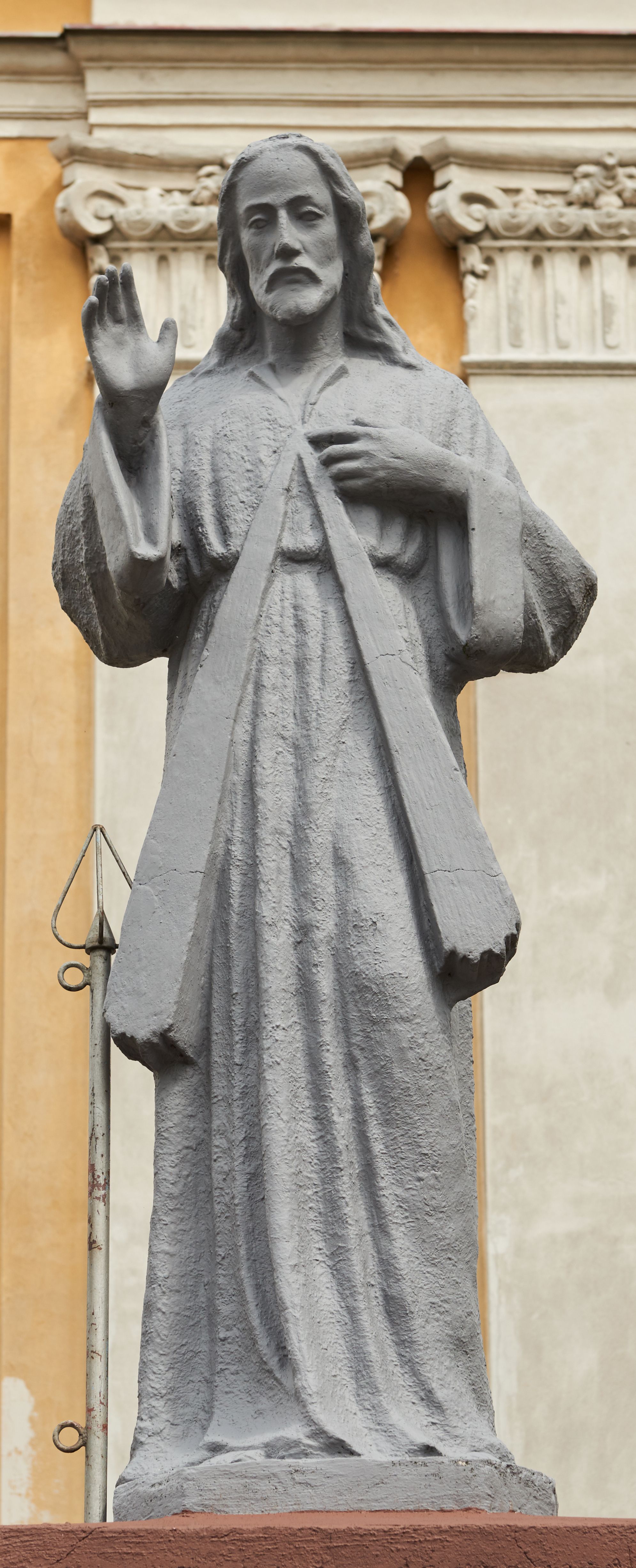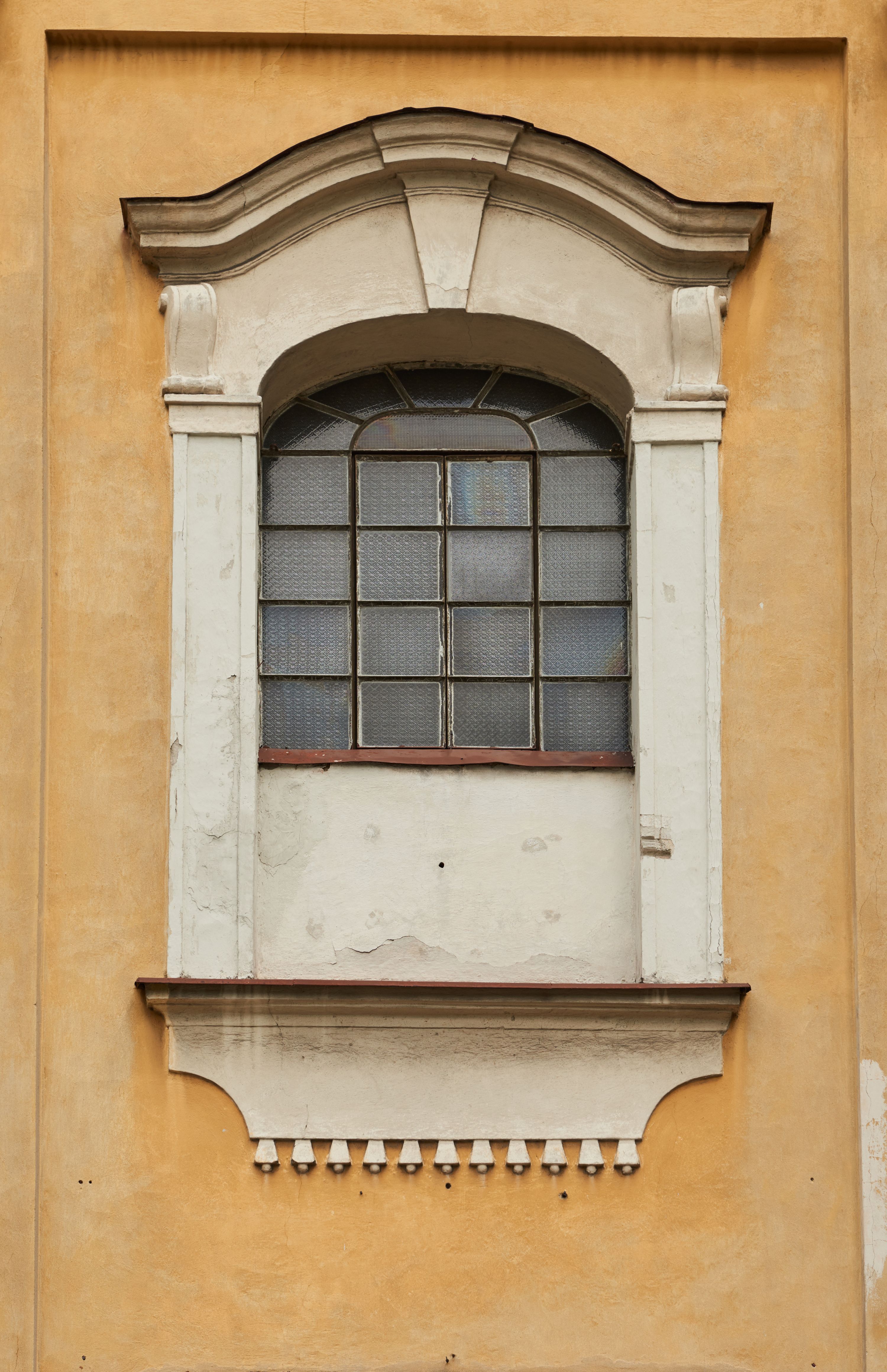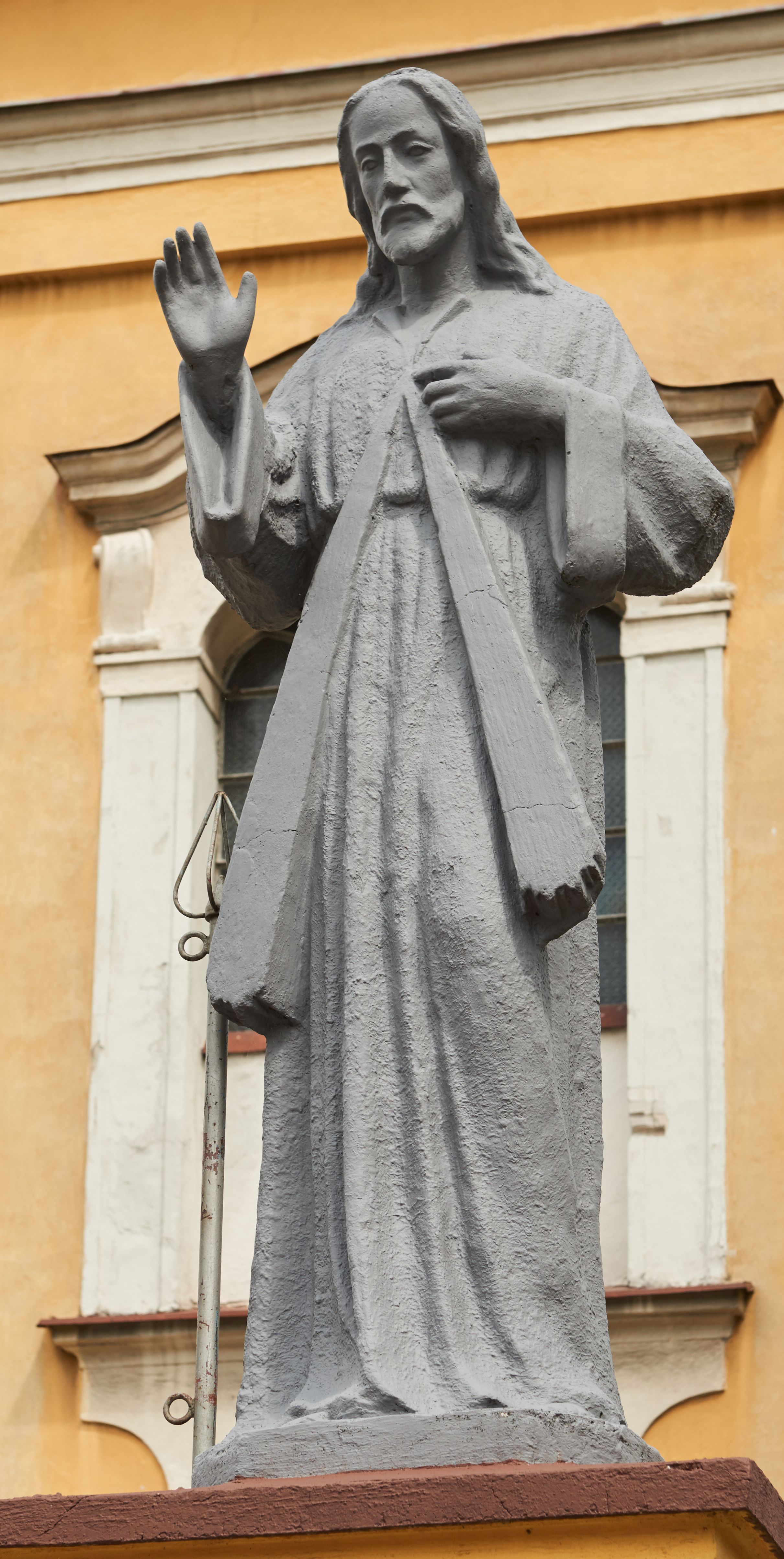 Północna, zachodnia i południowa ściana wieży przeprute są otworami okiennymi w kształcie stojącego prostokąta zamkniętego łukiem odcinkowym. Okna mają obramienia w kształcie stojących prostokątów z uszakami w górnych narożach, zwieńczone są belkowaniem w formie łuku odcinkowego z kluczem pośrodku i parą wolutowych wsporników po bokach fryzu. Podwieszenie ma formę fartucha w kształcie leżącego prostokąta o wklęsłych dolnych narożach i dolnej krawędzi zdobionej motywem lambrekinu. Powyżej otworów okiennych znajdują się okrągłe tarcze zegarowe. Pola ściętych naroży wieży zdobi ornamentyka cekinowa i kampanule. Korpus nawowy przykrywa dwuspadowy dach zakończony pięciopołaciowo nad prezbiterium i trójpołaciowo nad końcami transeptu, kryty dachówką. Na skrzyżowaniu korpusu nawowego i transeptu ulokowano obitą blachą wieżyczkę na sygnaturkę. Kolorystyka tynków kościoła utrzymana jest w odcieniu ugru, w dolnej partii różu, detal architektoniczny i ornamentyka w bieli.