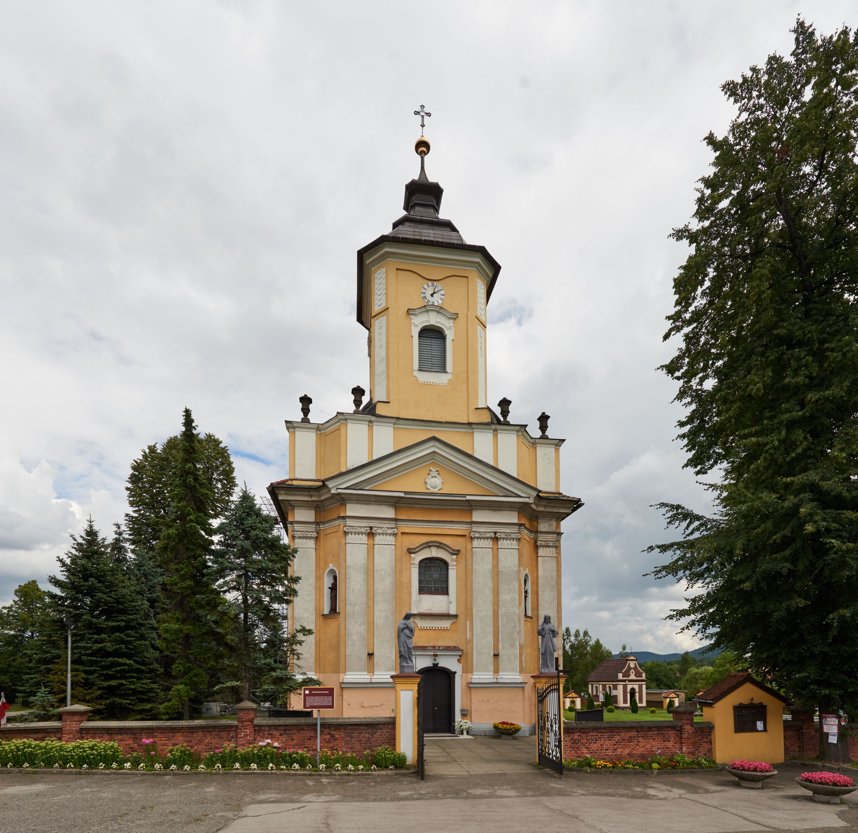 Pierwotnie parkan wokół kościoła był drewniany „za wyjątkiem kapliczek 14 stacji drogi krzyżowej, które zbudował Franciszek Schwarzenberg w r. 1762. X Caputa dał żelazną bramę w r. 1905 i część murowanego frontu. X. Korzonkiewicz dobudował całą resztę murowanego parkanu i przykrył wszystko betonowym daszkiem w r. 1936”. Kaplica grobowa rodziny Romerów, dziewiętnastowiecznych kolatorów kościoła, została wzniesiona w 1888 roku. Kilka razy w roku odprawiane są w niej msze święte.