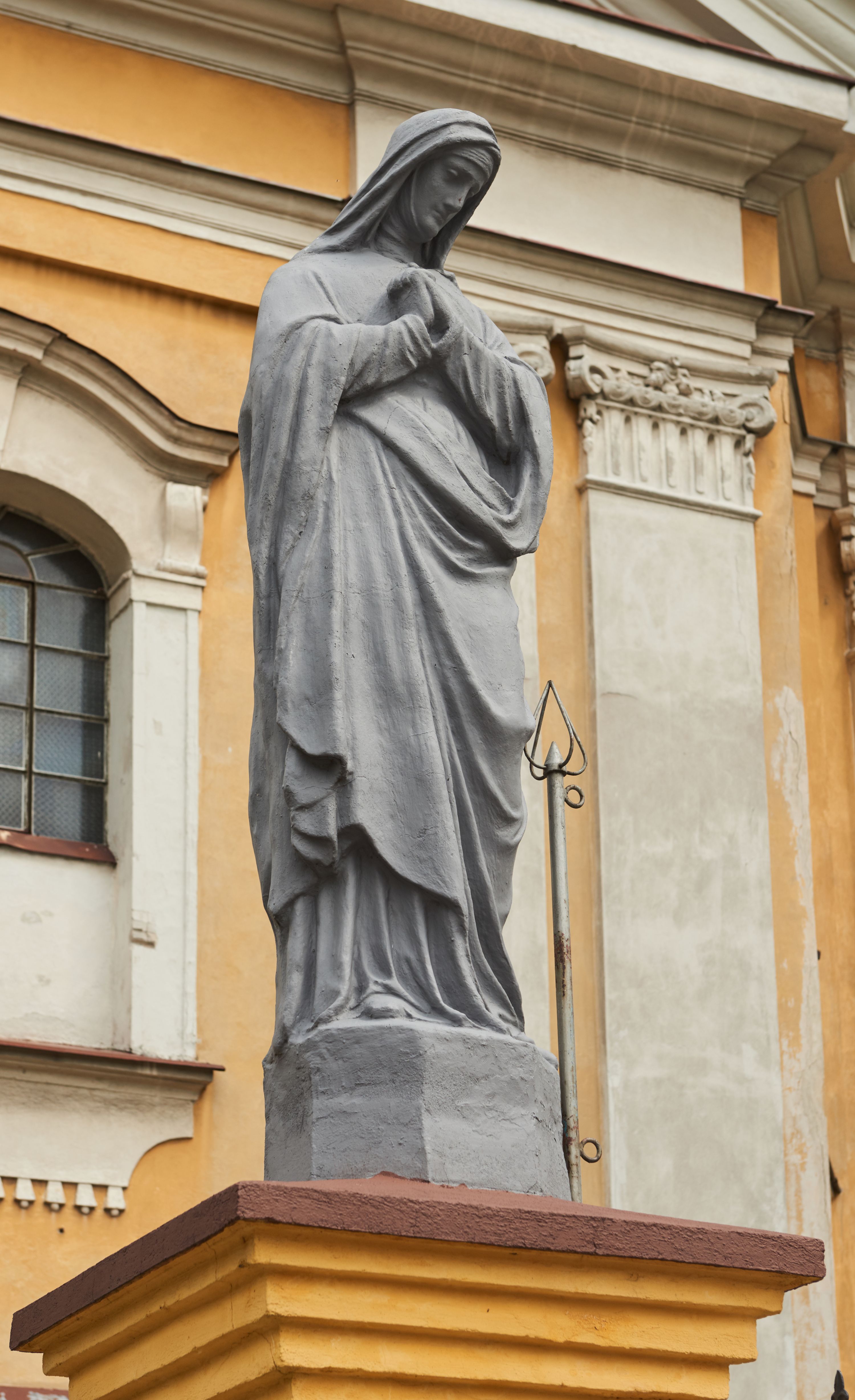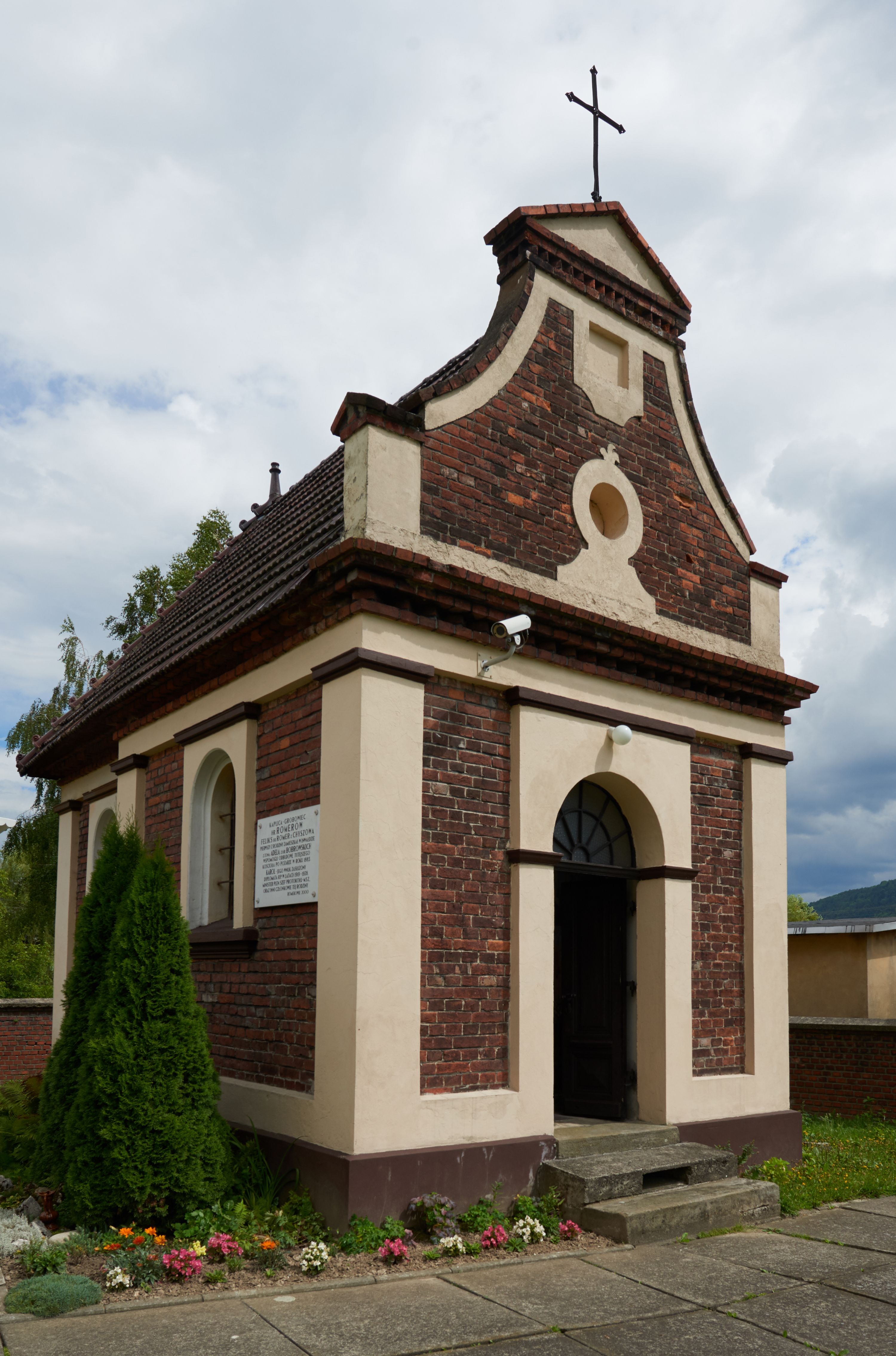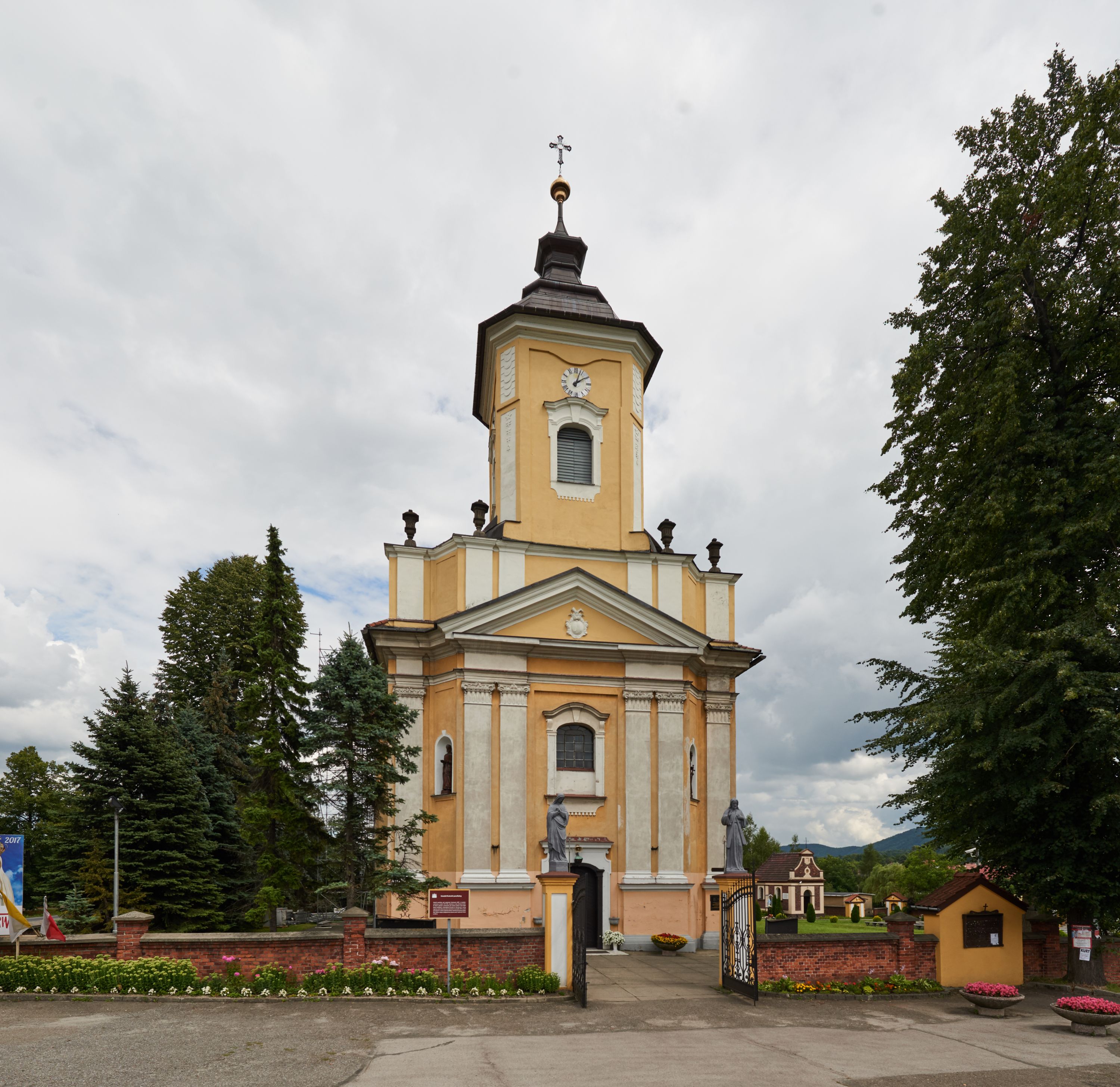 Plac przykościelny otoczony jest murowanym parkanem z usytuowanymi w nim 14 kapliczkami ze stacjami drogi krzyżowej, nakrytymi dwuspadowymi dachami. W jednym z naroży znajduje się niewielka, murowana kaplica grobowa rodziny Romerów o ceglanych ścianach artykułowanych białymi pilastrami i fasadzie ze szczytem ujętym parą spływów i zwieńczonym trójkątnym przyczółkiem.