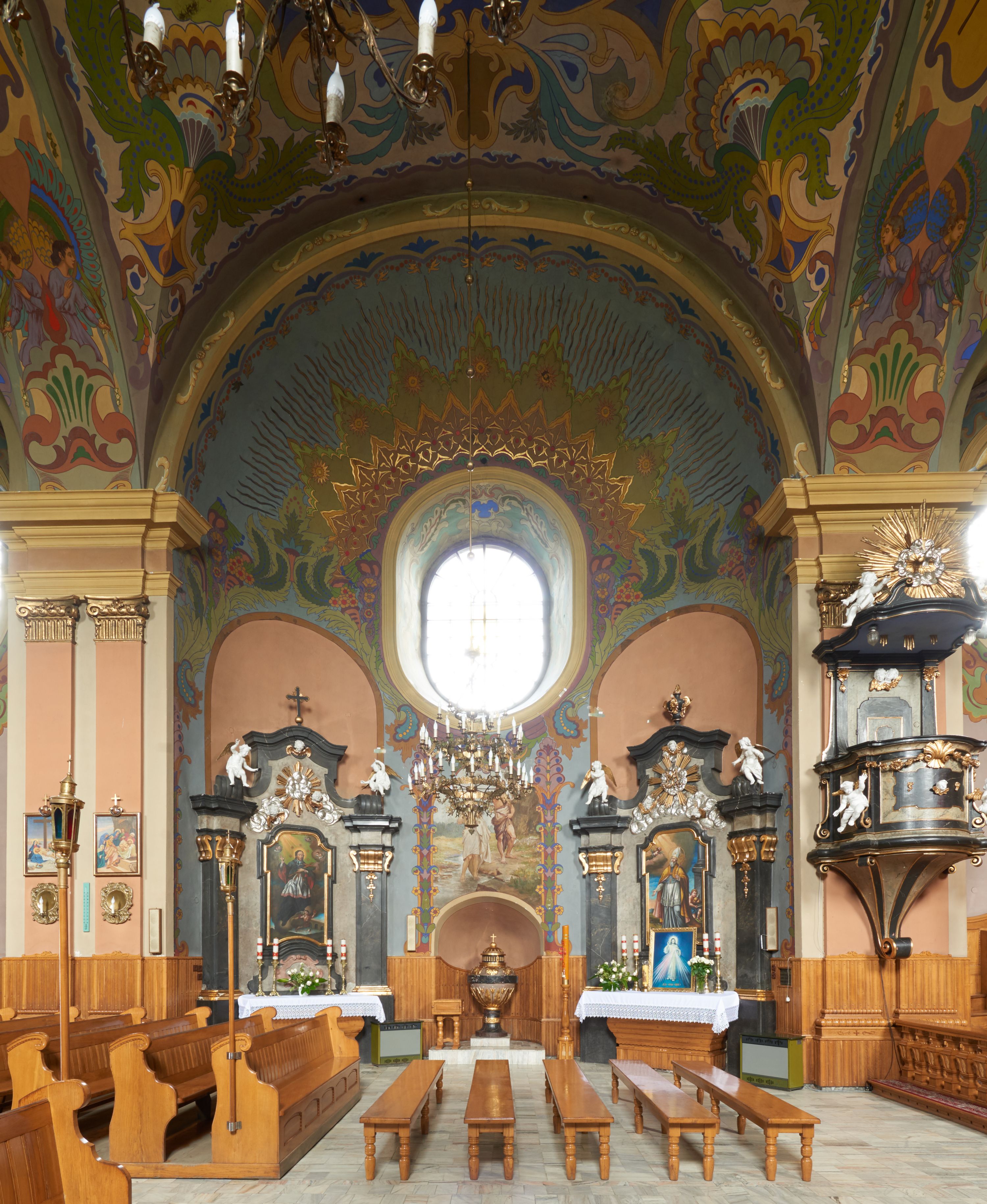 Pierwsze wzmiankowane w archiwaliach parafialnych prace renowacyjne wykonano po pożarze kościoła w 1885 roku i miały one trwać aż do 1938 roku. W 1928 roku, podczas prac nad tworzeniem polichromii wnętrza kościoła dokonano także odczyszczenia i ponownego pozłocenia ołtarzy.