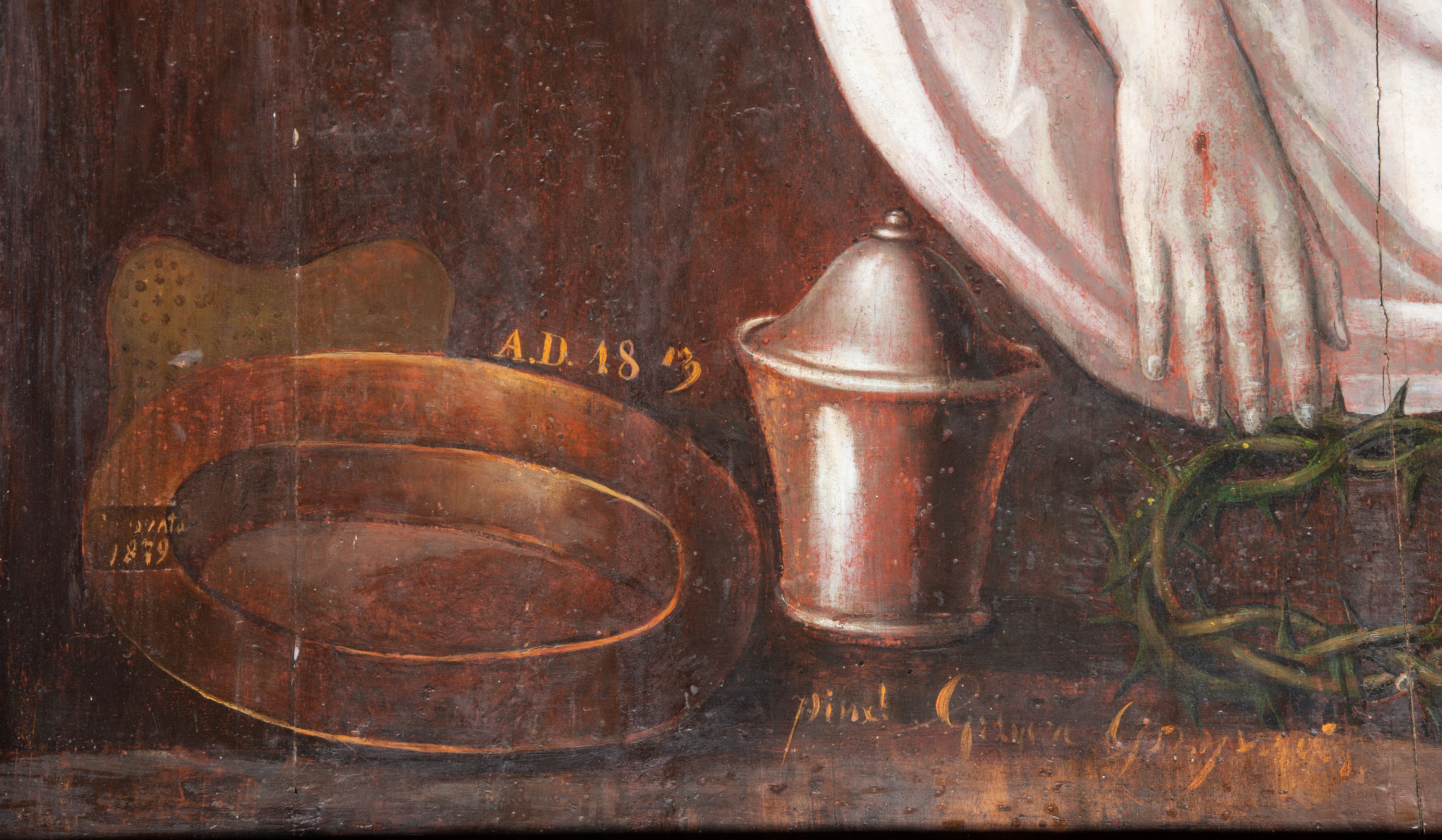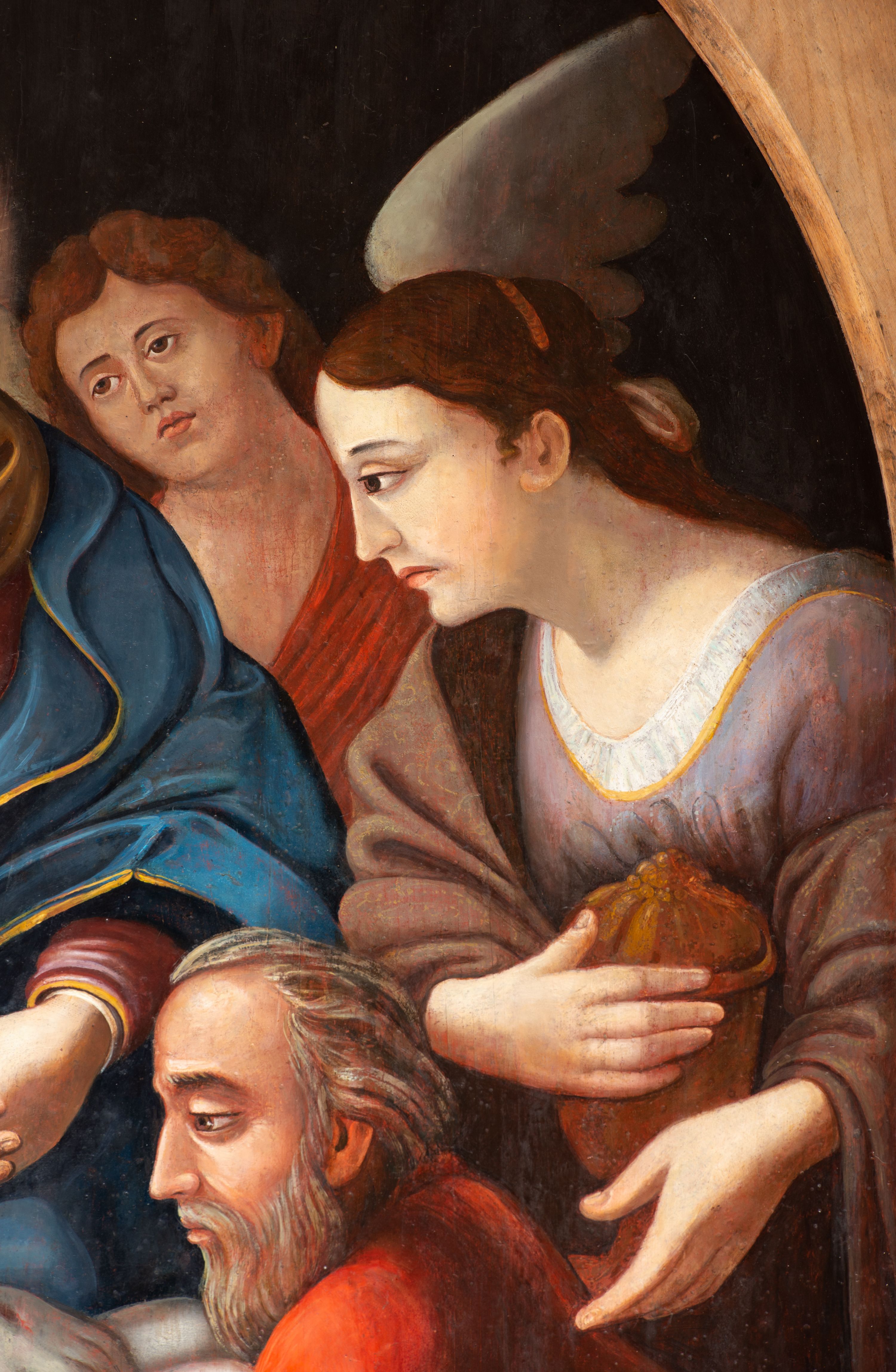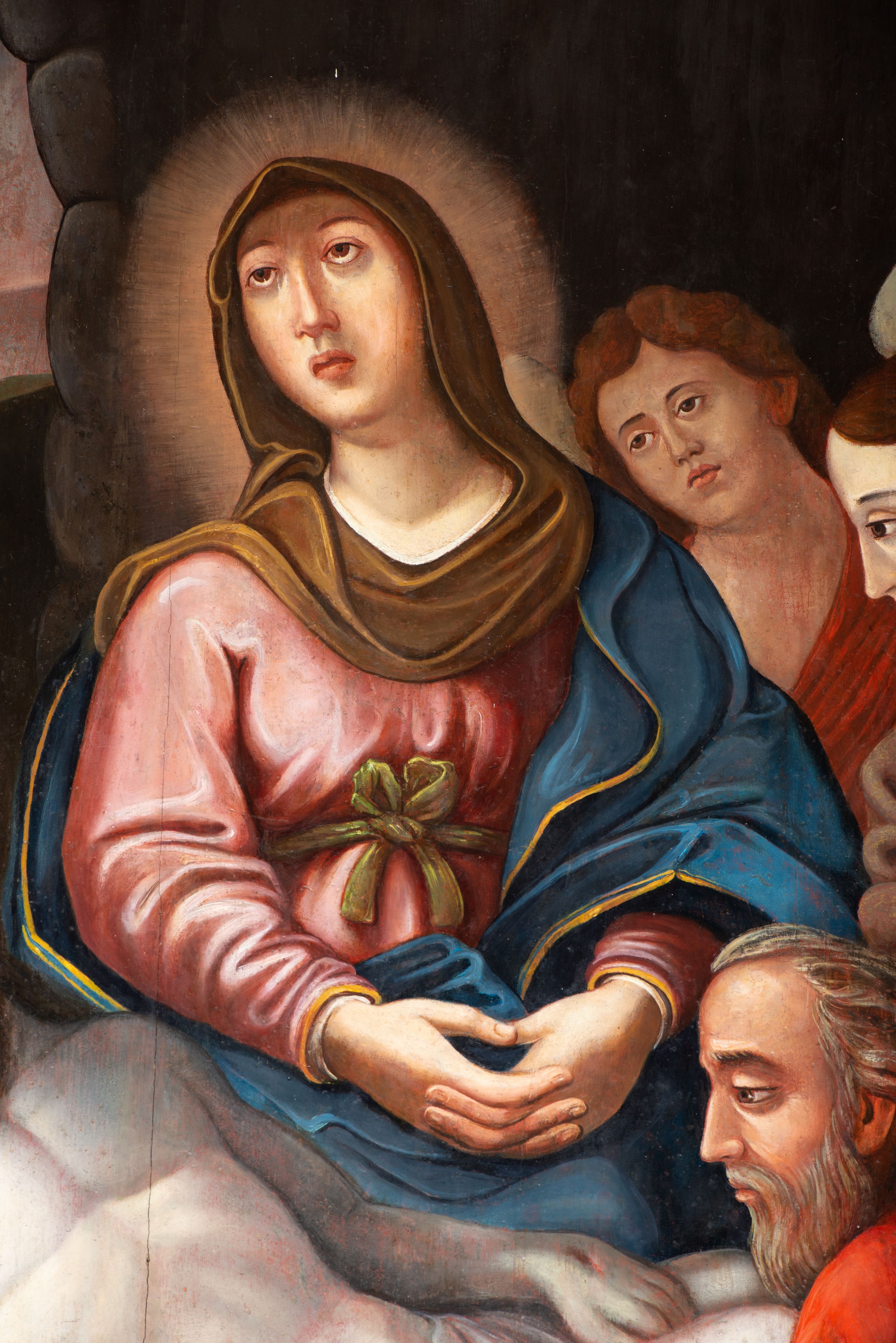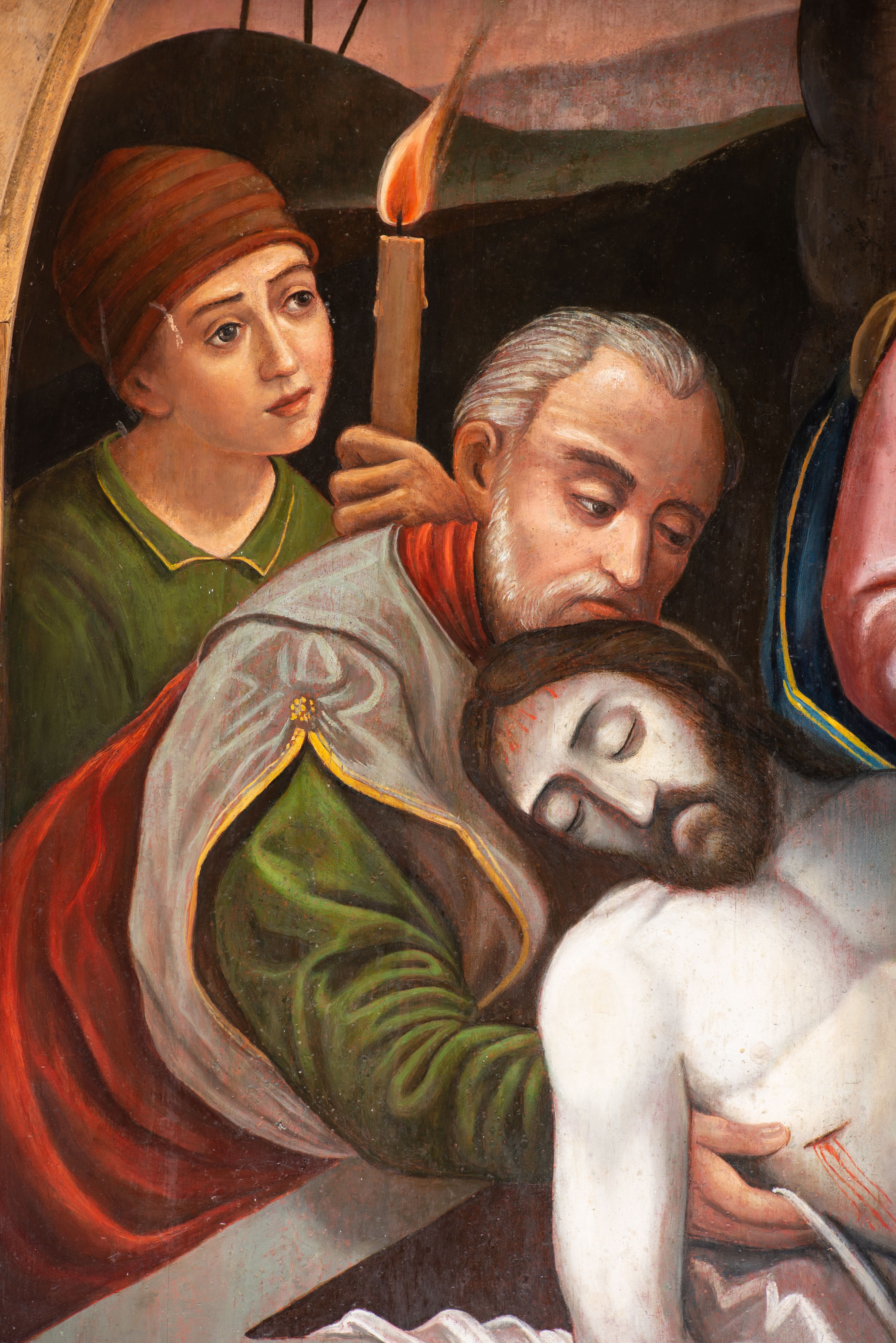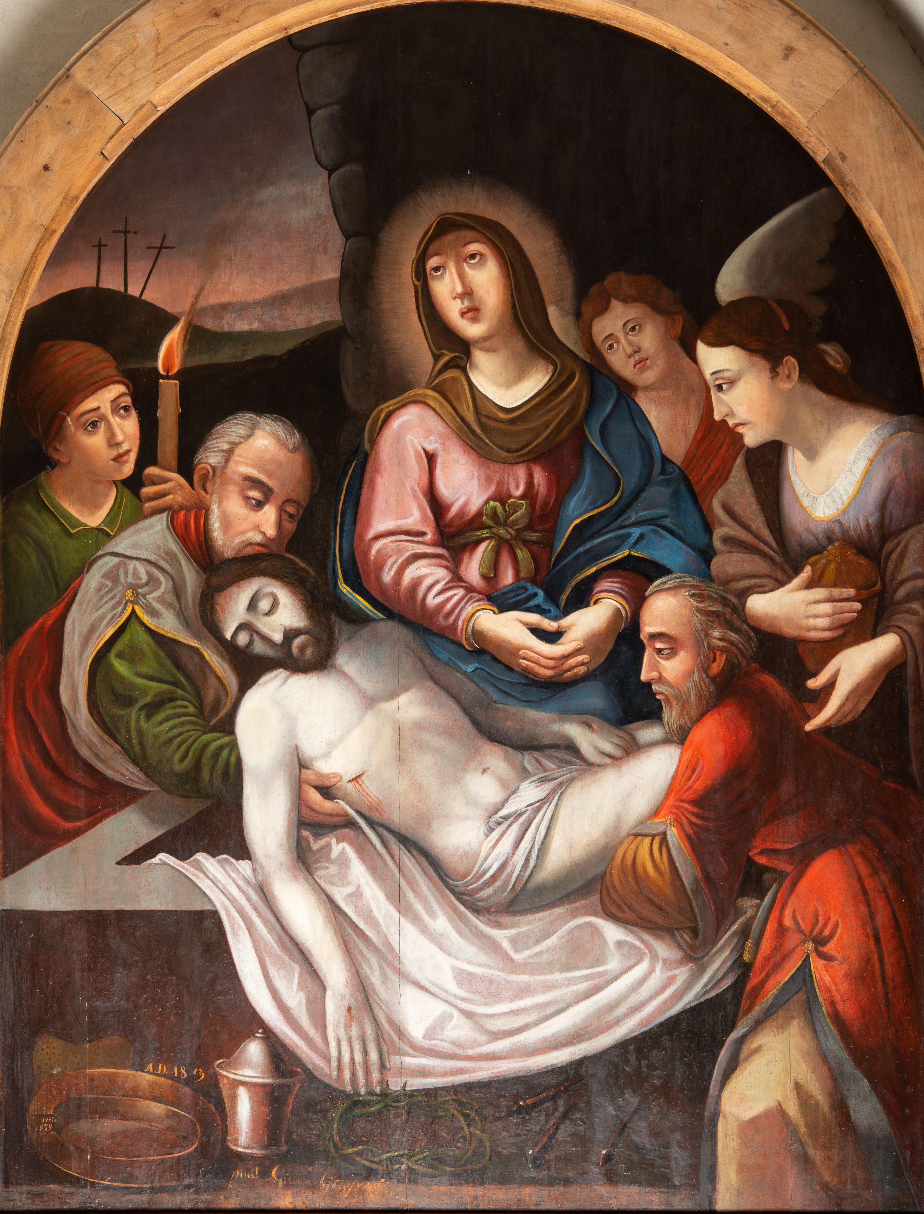 Obraz w kształcie stojącego prostokąta zamkniętego łukiem pełnym w szerokiej, gładkiej, drewnianej ramie. W centrum kompozycji martwe ciało Chrystusa składane do grobu przez dwóch mężczyzn – Józefa z Arymatei i Nikodema. Ciało ma biały kolor, głowa Chrystusa opada na prawy bark, jego ręka zwisa bezwładnie ponad krawędzią kamiennego sarkofagu, do którego opuszczane są zwłoki. Za nim, również centralnie, stoi Maria, która ma złożone ręce i wzrok wzniesiony ku górze. Ma owalną, gładką twarz o głęboko osadzonych oczach, długim wąskim nosie i niewielkich, pełnych ustach. Jest ubrana w różową suknię przewiązaną zieloną szarfą i tego samego koloru chustę na głowie. Na ramionach ma narzucony niebieski, lamowany złotem płaszcz. Ciało Zbawiciela podtrzymuje dwóch starych mężczyzn. Jeden stoi z prawej strony kompozycji, z przodu. Ma na sobie żółtą suknię spodnią i czerwoną wierzchnią rozciętą nad łokciem i na udzie. Drugi, stojący za sarkofagiem, jest ubrany w ciemnozieloną suknię spodnią, szarą wierzchnią i czerwony płaszcz. Za nim stoi chłopiec w zielonej tunice i brązowej czapce trzymający w lewej ręce zapaloną świecę. Z prawej strony obrazu, ponad mężczyzną namalowano kobietę, być może Marię Magdalenę, trzymającą w rękach zawinięte w tkaninę naczynie (?). Za nią stoi anioł w brązowej sukni. Na pierwszym planie, przed sarkofagiem widoczne od lewej strony: misa, naczynie z przykrywką, korona cierniowa i trzy gwoździe. Ponad misą napis „A(nno) D(omini) 18[4]3”, na jej brzegu „[Ren]ovata 1879”, a przed naczyniem i koroną „pinx! Grzywa [?] Grzywiński”. W lewym górnym roku widok na Golgotę z trzema krzyżami.