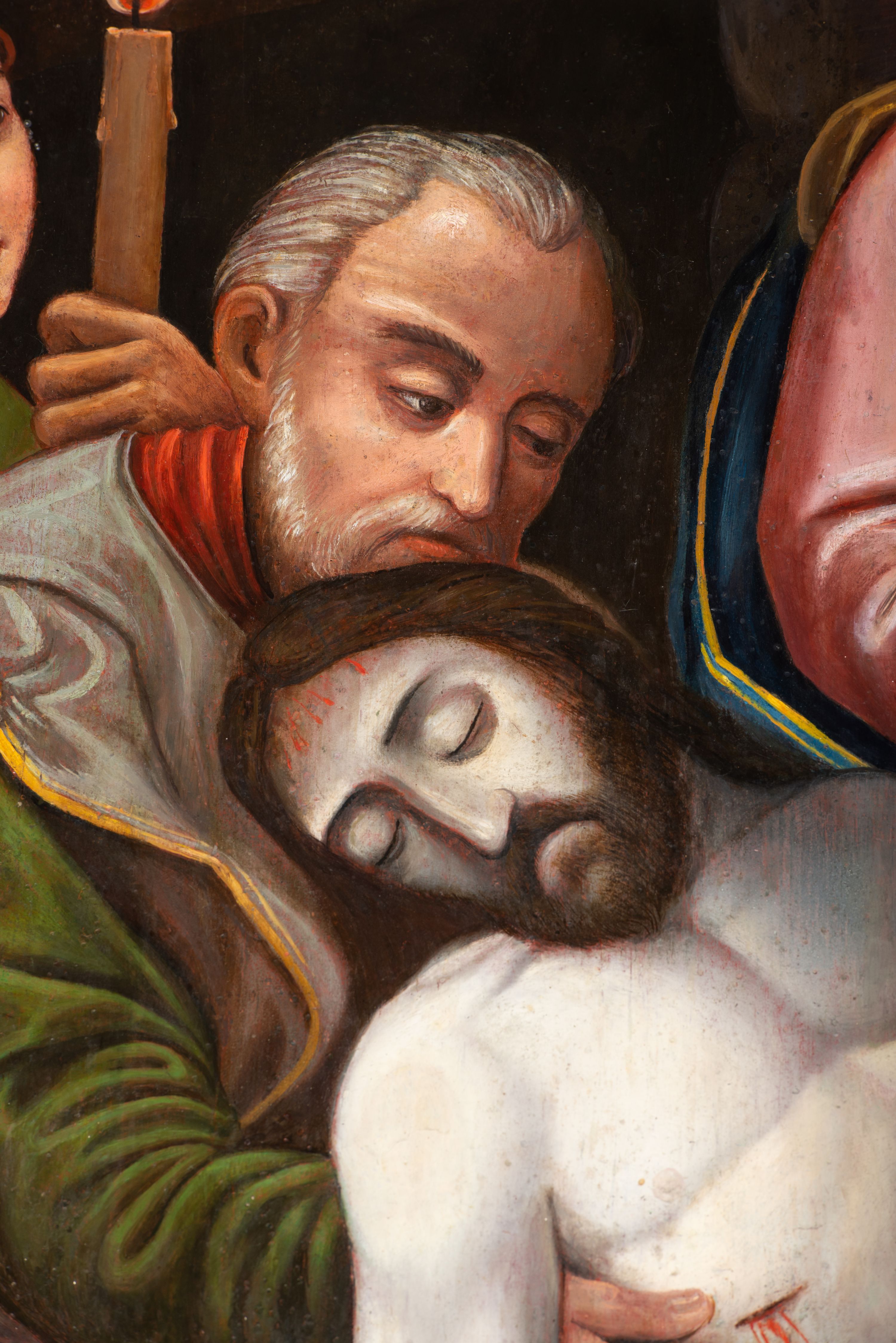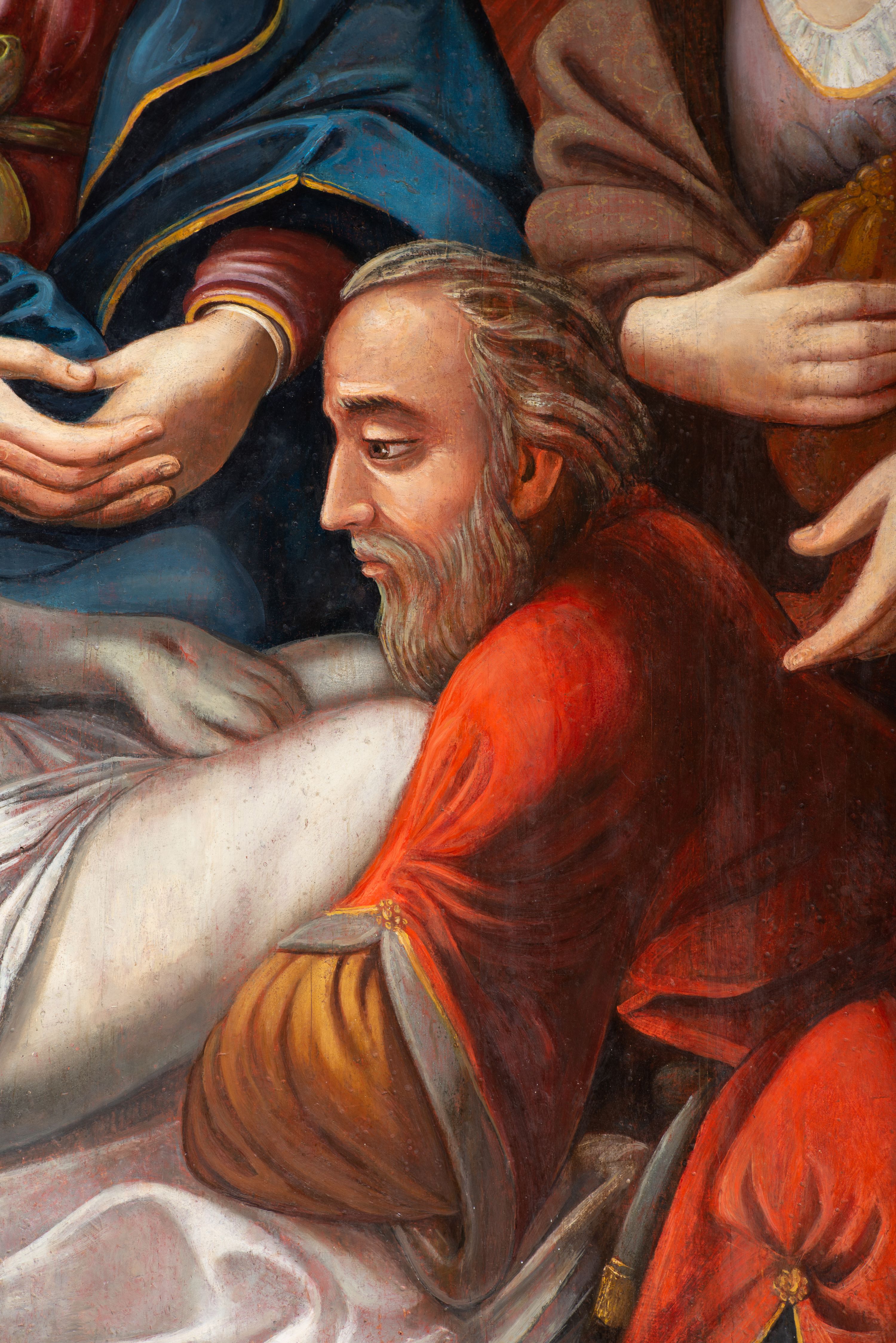 Temat złożenia do grobu ukształtował się w sztuce Zachodu, w Bizancjum ukazywano moment niesienia do grobu wykutego w skale. Zgodnie z opisem Ewangelii w scenie uczestniczyli Józef z Arymatei i Nikodem, od około 1000 roku przedstawiano z nimi również Marię oraz inne kobiety, później liczba uczestników sceny wciąż rosła – w XIII wieku pojawiły się anioły. Od XIV wieku okryte jedynie perizonium ciało Chrystusa składane jest do niskiego, kamiennego sarkofagu. Wiele przedstawień opiera się na wzorze wykształconym przez Rafaela w płótnie pod tym tytułem przechowywanym w Galerii Borghese w Rzymie i wykorzystanym przez Barocciego w kompozycji wiszącej w kościele Santa Croce w Senigallii. W obu w centrum znajduje się ciało Chrystusa niesione przez mężczyzn w całunie, w tle widać górę Kalwarię z trzema krzyżami. Suski obraz jest kopią siedemnastowiecznego dzieła wykonaną najpewniej w 1843 roku. Obraz ten w literaturze występuje często pod tytułem „Zdjęcie z krzyża”.