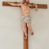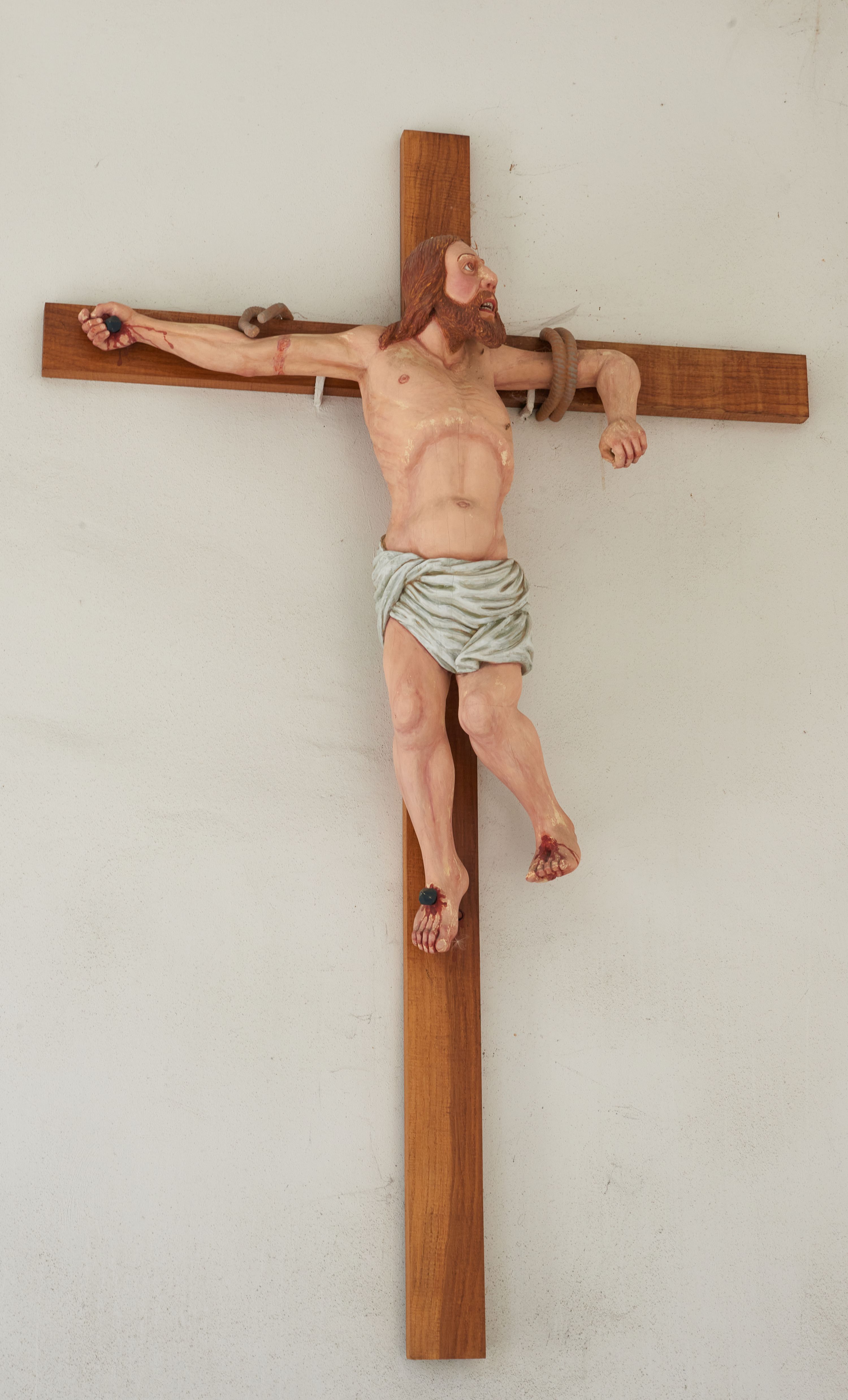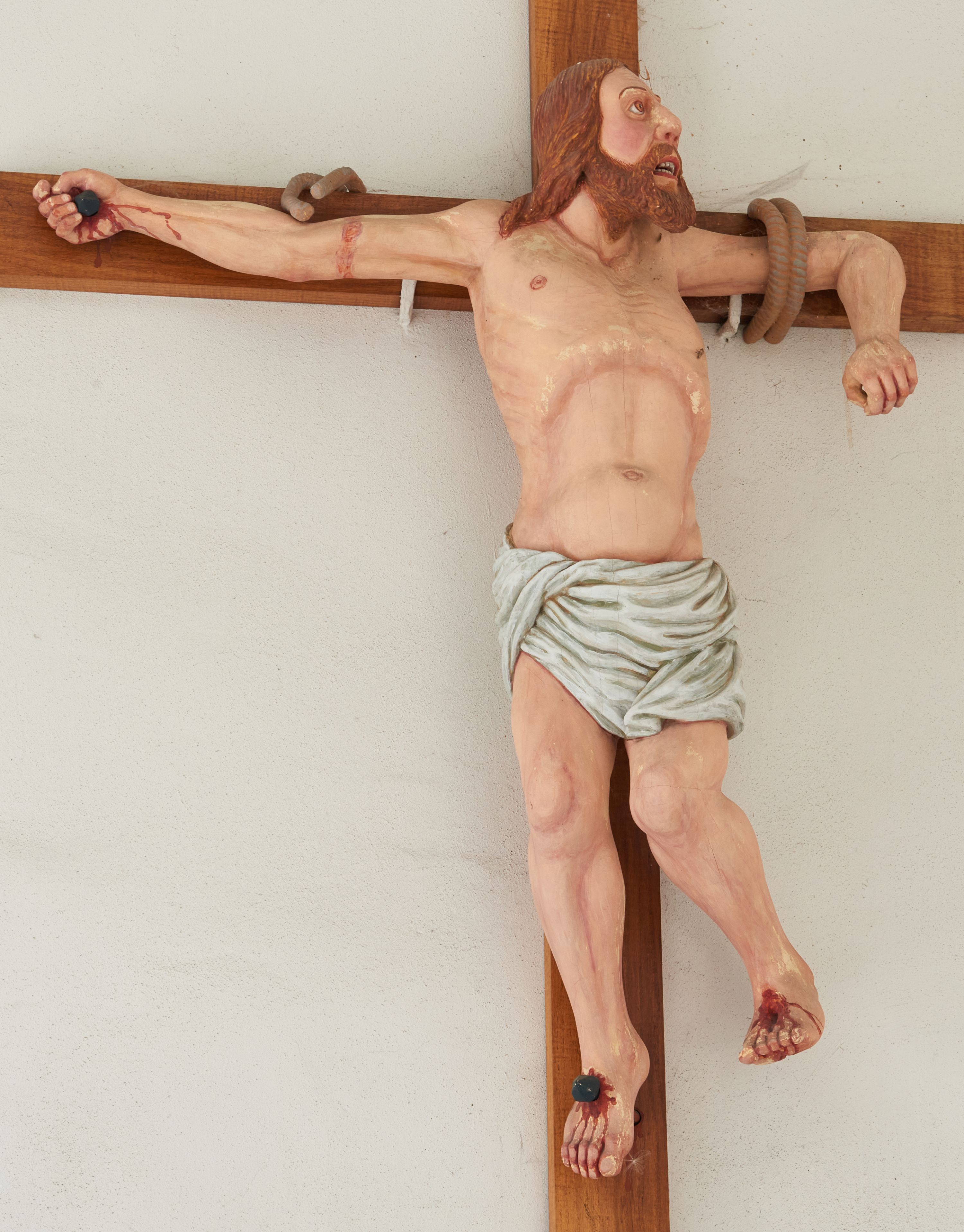 Rzeźba Złego Łotra na krzyżu ukazana w ekspresyjnej pozie o esowato wygiętej sylwetce z głową zwróconą w lewo. Ramiona ułożone wzdłuż patibulum, przywiązane do niego podwójnym sznurem (na prawej ręce urwanym). Prawa ręka wyprostowana i przybita gwoździem do krzyża, a lewa zgięta w łokciu z przedramieniem zwróconym w dół; dłonie zaciśnięte. Klatka piersiowa szeroka o wyraźnie podkreślonej linii żeber i mostka z głęboko zaznaczonym wcięciem w talii. Prawa noga przybita do krzyża jednym gwoździem, lewa ugięta w kolanie i uniesiona bok z raną po gwoździu w stopie. Twarz podłużna, okolona brodą; usta otwarte i ukazujące rzędy białych zębów; duże, szeroko otwarte oczy; szeroki nos; długie i jasnobrązowe włosy. Łotr przewiązany jest w biodrach białą, drapowaną, ciasno opinającą biodra przepaską. Na stopach i prawej dłoni widoczne są ślady krwi. Polichromia rzeźby jest naturalistyczna; krzyż drewniany, gładki.