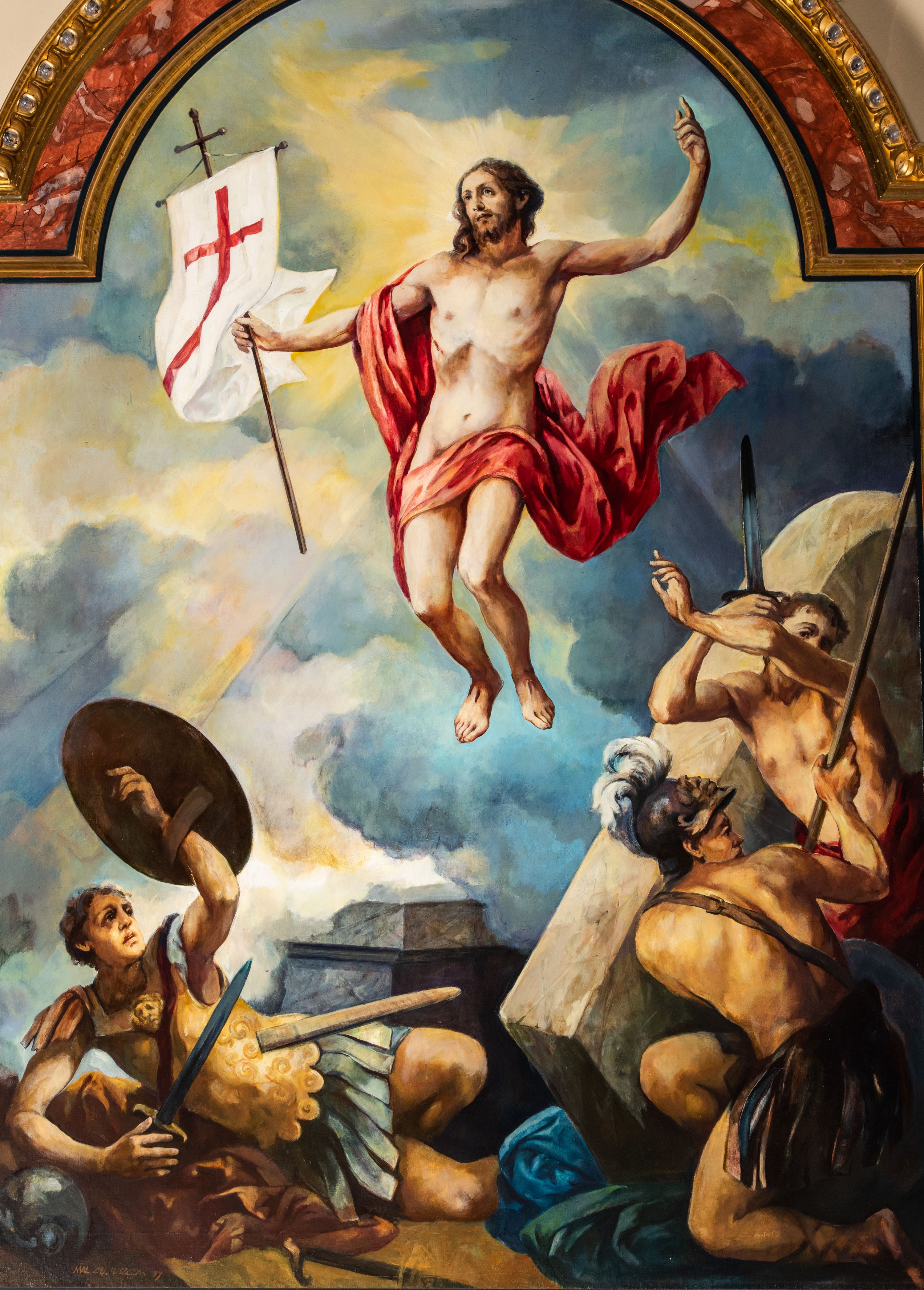 Obraz w kształcie zbliżonym do kwadratu zamkniętego półkolistym łukiem nadwieszonym, ujęty profilowaną, marmoryzowaną, złoconą i srebrzoną ramą z motywem astragalu, przedstawia scenę Zmartwychwstania Jezusa. Pośrodku kompozycji ukazana jest sylwetka unoszącego się Chrystusa zwróconego na wprost, z głową skierowaną w trzech czwartych w prawo. Pociągłą twarz charakteryzują subtelne rysy i krótki zarost. Długie, falowane włosy opadają na plecy i prawe ramię. Nagą, smukłą sylwetkę przesłania w partii bioder czerwony rozwiany płaszcz przewieszony przez prawe ramię. Ręce są rozłożone na boki, lewa uniesiona w geście błogosławieństwa, w prawej Jezus trzyma białą chorągiew z czerwonym krzyżem. Chrystus ukazany jest na tle pokrytego obłokami nieba. Na wysokości jego głowy rozsuwają się, odsłaniając słońce, którego promienie tworzą rodzaj nimbu. Dolną partię kompozycji zajmują sylwetki trzech żołnierzy w zbrojach rzymskich legionistów. Znajdujący się po lewej stronie ukazany jest w pozycji półleżącej. Trzymaną w prawej ręce tarczą osłania się od blasku bijącego od Jezusa. W lewej dłoni ma miecz. W głębi widać fragment kamiennego sarkofagu, którego wieko w postaci dużej, prostopadłościennej płyty zakończonej półkoliście, znajduje się po prawej stronie kompozycji w układzie diagonalnym. Za nim są sylwetki pozostałych dwóch żołnierzy. Pierwszy, skierowany profilem w prawo, przyklękając odwraca się do tyłu. Na głowie ma hełm z pióropuszem, biodra przesłania mu fartuch. W rękach trzyma włócznię. Dalej stoi drugi zwrócony na wprost podnosi do góry zgięte w łokciach ręce, w prawej trzymając miecz. U stóp żołnierzy leżą porzucone płaszcze i elementy uzbrojenia.