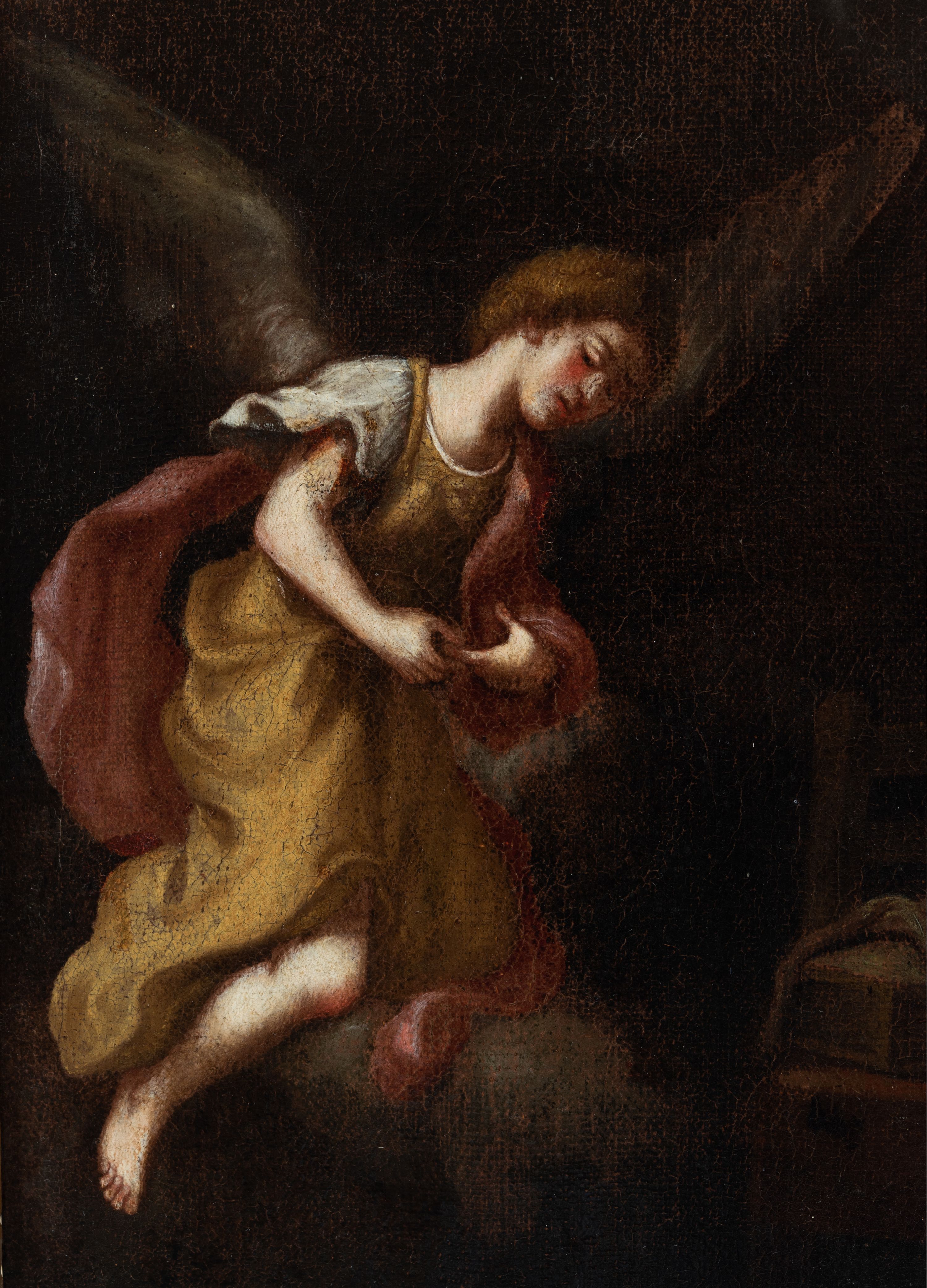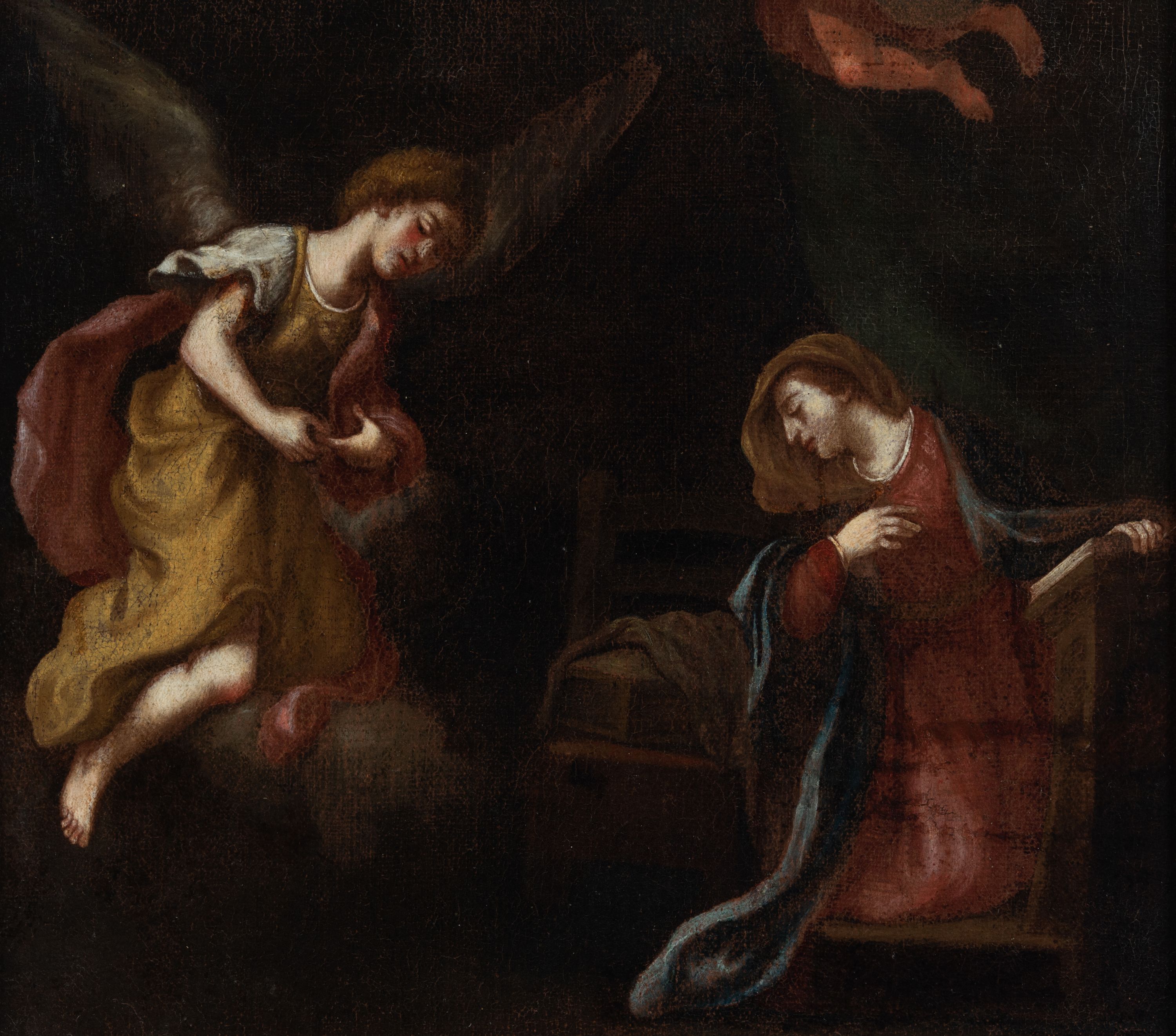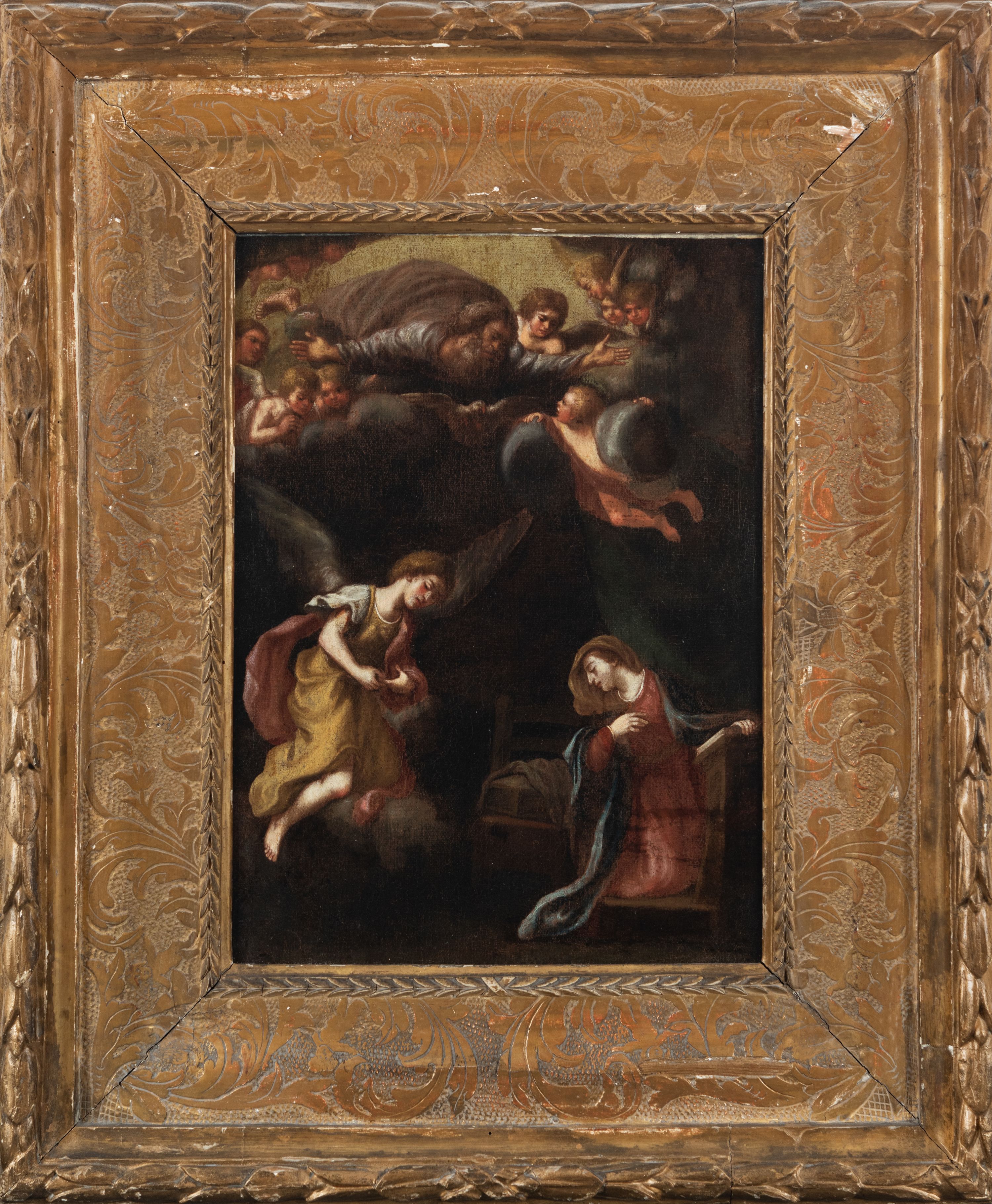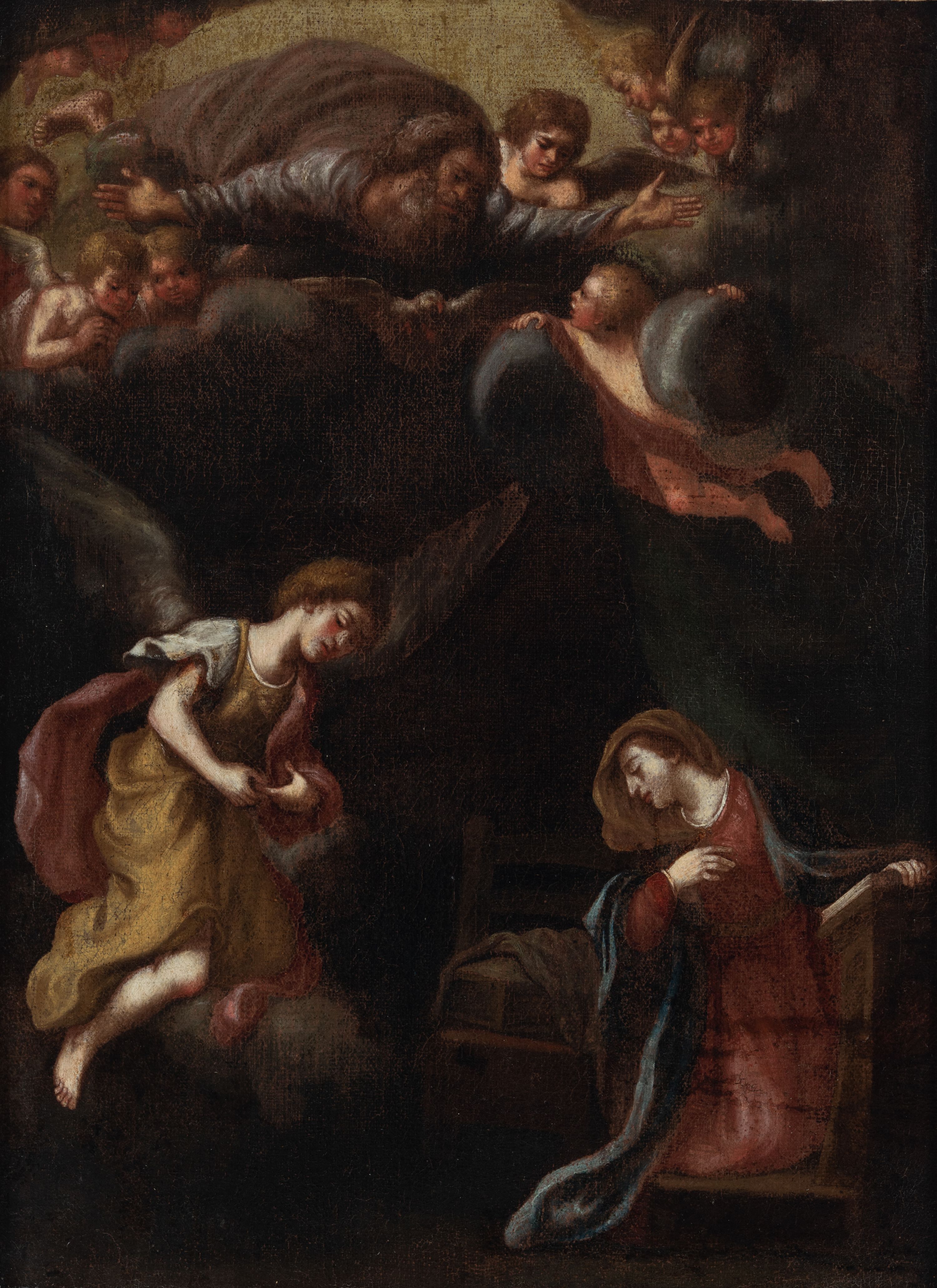 Obraz w kształcie stojącego prostokąta. Kompozycja dwustrefowa, w dolnej części z prawej strony ukazana jest Maria klęcząca na klęczniku, odwrócona do tyłu w stronę nadlatującego anioła. Maria lewą ręką opiera się o klęcznik, a prawą przyciska do piersi. Głowa ukazana z lewego profilu, skłoniona delikatnie w dół. Twarz o wyraźnie zaznaczonym podbródku z wydatnymi ustami, długim nosem i przymkniętymi oczami; włosy jasnobrązowe schowane pod welonem. Maria ubrana jest w czerwoną suknię oraz zarzucony na ramiona jasnoniebieski płaszcz, na głowie ma brązowy welon. Z lewej strony obrazu przedstawiony jest nadlatujący archanioł Gabriel, klęczący na obłokach i zwrócony trzy czwarte w lewo, pochylony w ukłonie przed Matką Boską. Ubrany jest w długą i żółtą tunikę oraz czerwony płaszcz. Pomiędzy Matką Boską, a archaniołem ustawione jest siedzisko, na którym leży skrzyneczka, przykryta białą tkaniną. W górnej strefie obrazu wyłania się z obłoków Bóg Ojciec z rozłożonymi szeroko na boki rękami, otoczony przez grupy aniołków. Twarz o rysach starszego mężczyzny, okolona bujną i siwą brodą. Ubrany jest w szarą suknię i ciemnoszary płaszcz. Tło obrazu ciemne, po prawej stronie zielona kotara. Rama szeroka, złocona, od wewnątrz fakturowana i zdobiona liśćmi stylizowanego akantu, od zewnątrz dekorowana liśćmi wawrzynu. Na odwrociu przyklejona karteczka z nadrukiem „Ze zbiorów księdza Jana kniazia z Kozielska Puzyny księcia biskupa krakowskiego, no 153”.