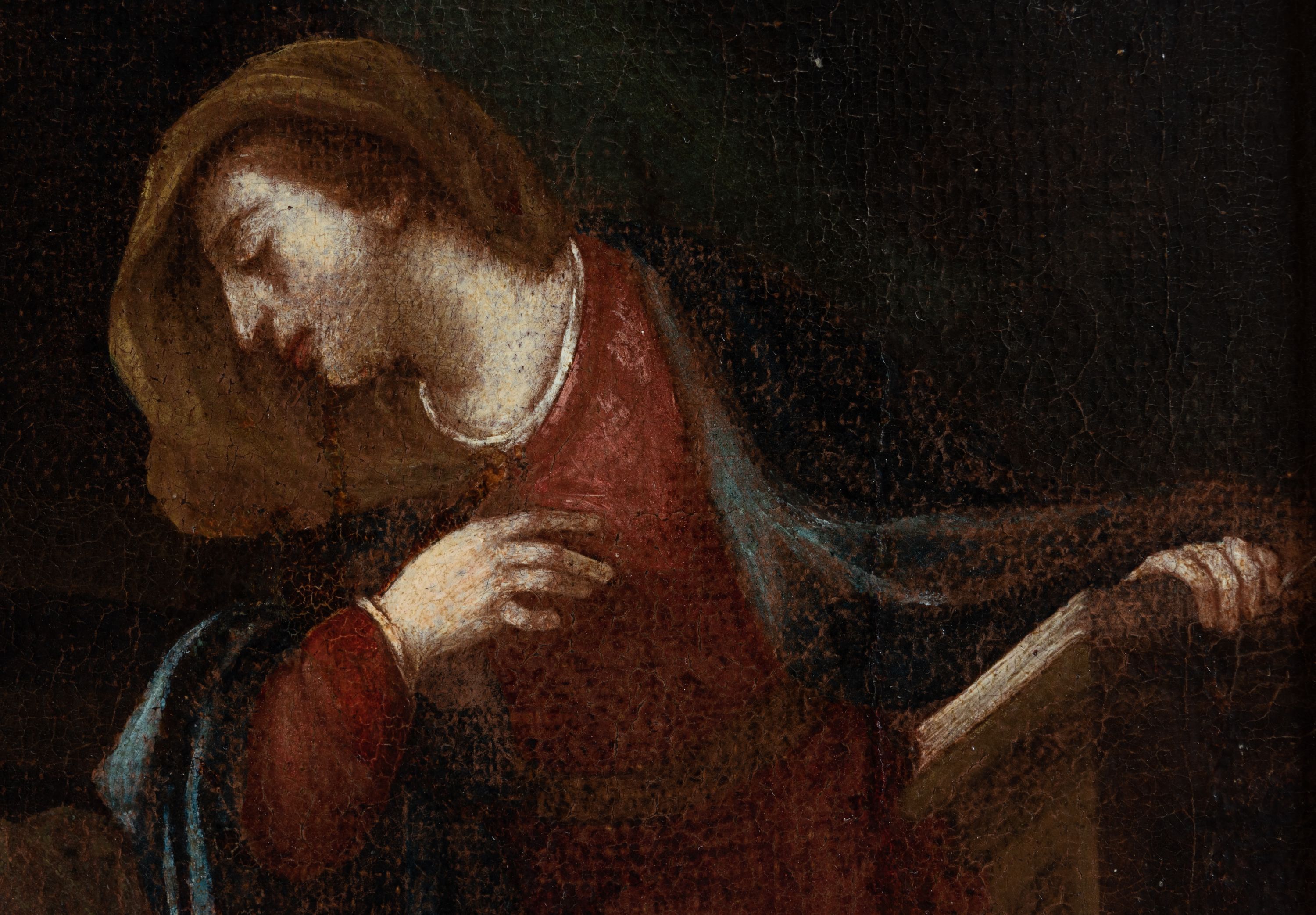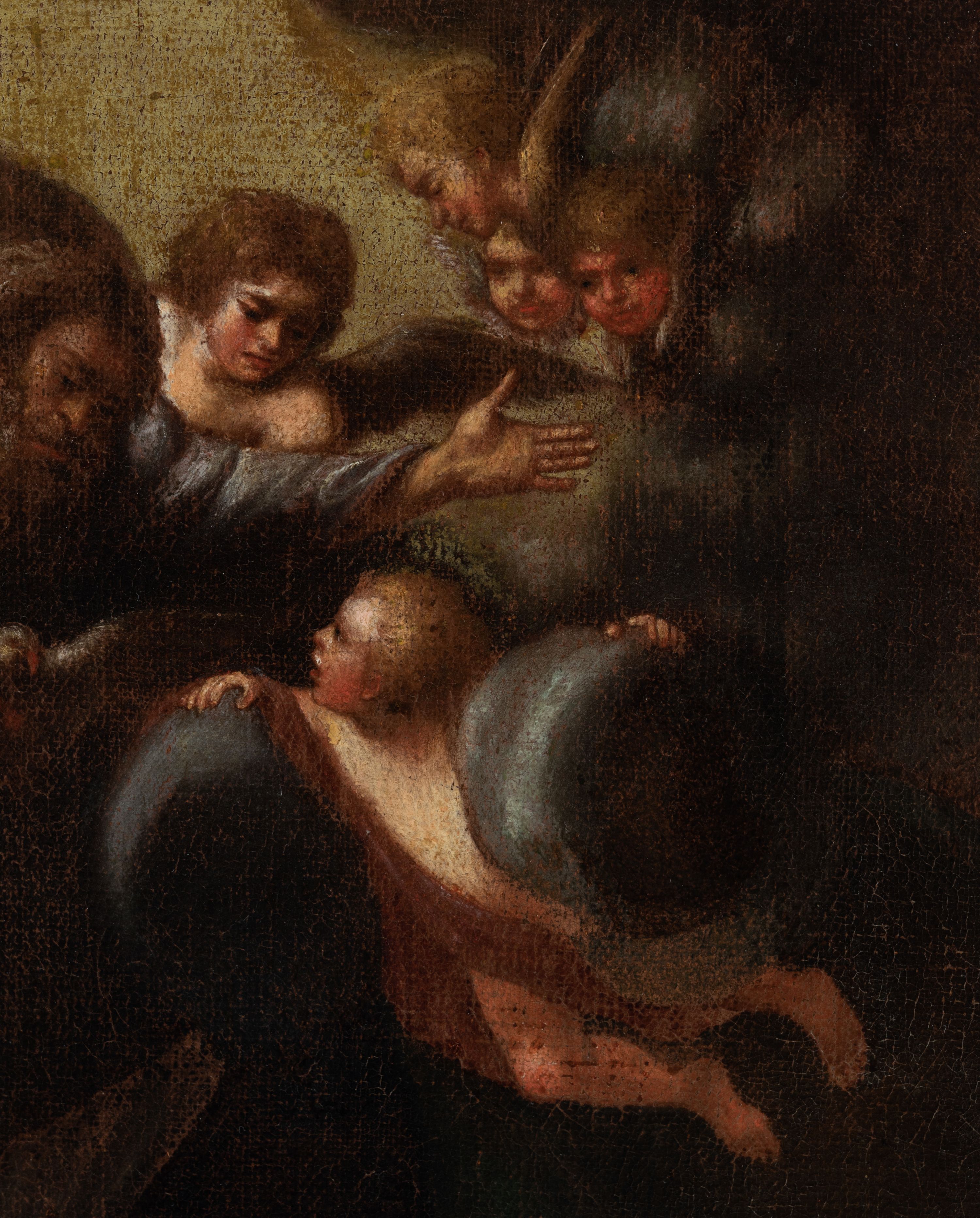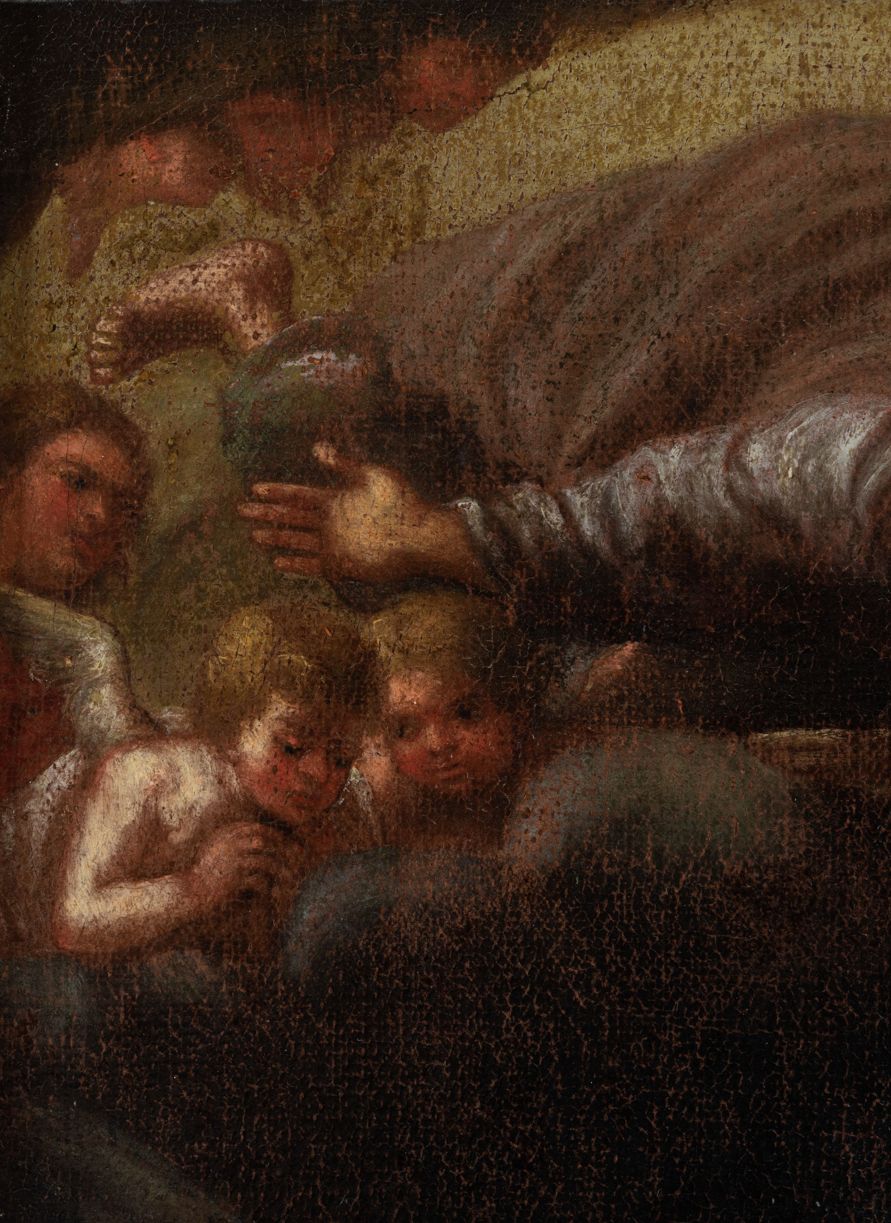 Rama pęknięta w górnej części, przetarcia warstwy malarskiej, ściemnienie powierzchni.