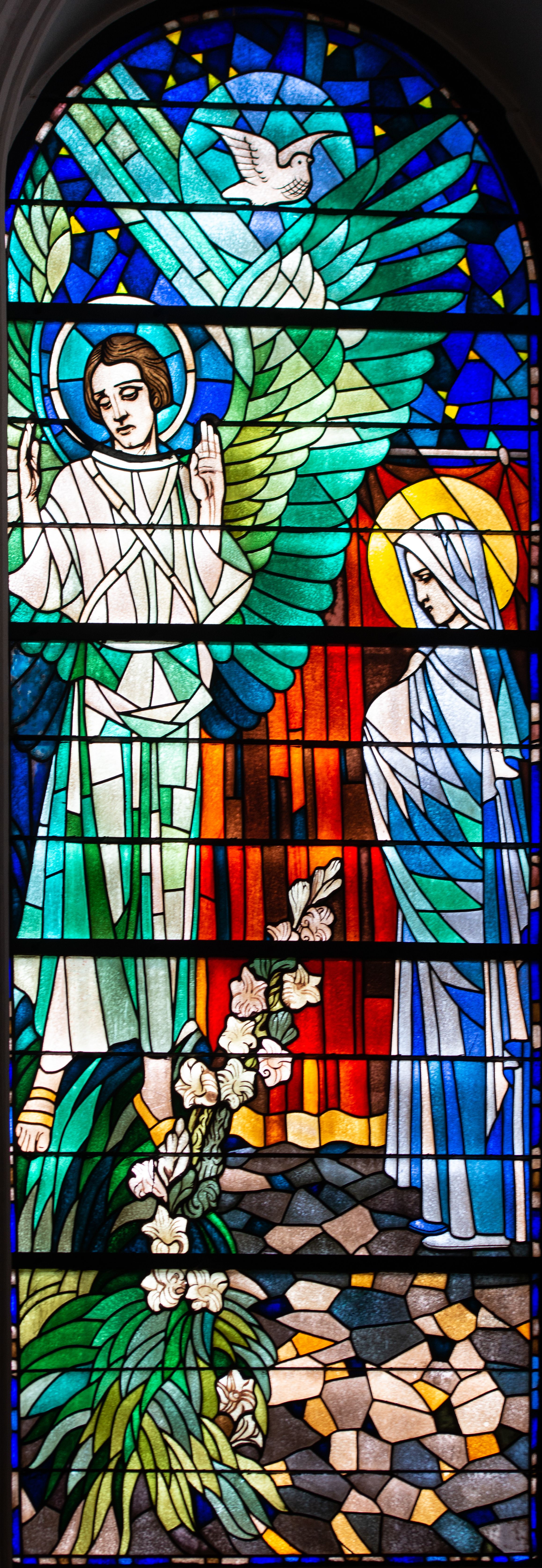 Witraż w kształcie stojącego prostokąta zamkniętego łukiem półkolistym. W centrum kompozycji, na tle czerwonej kotary ukazana scena Zwiastowania. Z prawej strony znajduje się przedstawiona z profilu, w pozycji stojącej Maria ubrana w niebiesko-białe szaty. Ukazana jest jako młoda kobieta z pochyloną głową. Ręce schowane pod połami szat, złożone na piersi. Na głowie Marii jasnoniebieska chusta, wokół niej świetlisty nimb. Z prawej strony kompozycji przedstawiono archanioła Gabriela ukazanego frontalnie, w pozycji stojącej. Głowa pochylona w trzech czwartych w prawo. Archanioł ma pozbawioną zarostu twarz młodego mężczyzny i brązowe, sięgające uszu włosy. Ubrany jest w biało-zielone szaty i żółte sandały. Obie ręce, ugięte w łokciach, uniesione w geście pozdrowienia. Szeroko rozpostarte skrzydła archanioła mają pióra w odcieniach zieleni i niebieskiego. Wokół głowy postaci znajduje się niebiesko-zielony nimb. W górnej części kompozycji ukazana gołębica Ducha Świętego na tle promienia skierowanego na głowię Marii. Na drugim planie granatowe niebo. W dolnej części kompozycji, na pierwszym planie ukazane są białe lilie.