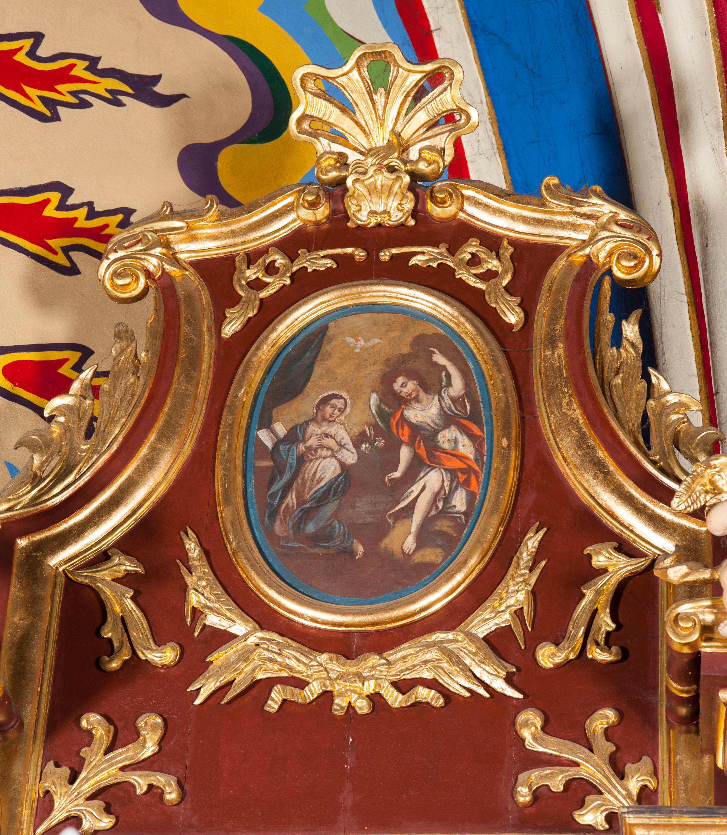 Obraz przedstawiający Zwiastowanie powstał zapewne w drugiej połowie XVIII wieku. W późniejszym czasie został wtórnie zamontowany do zwieńczenia ołtarza wykonanego w 1899 roku.