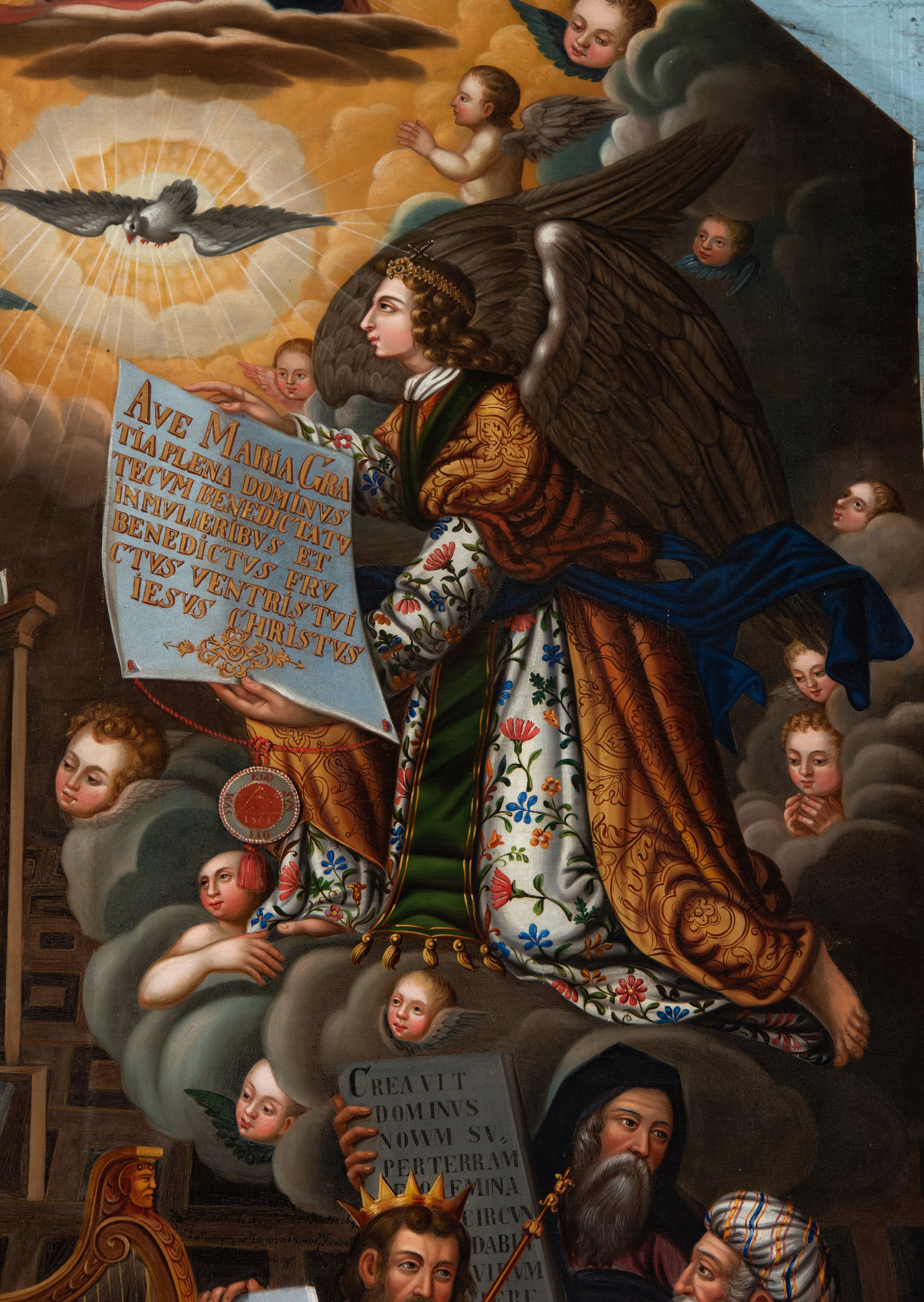 Marię ujętą w trzech czwartych w prawo wyobrażono klęczącą na klęczniku z lewej strony kompozycji. Lewą rękę przycisk do piersi, a prawą nieznacznie odsuwa od siebie. Jest to młoda dziewczyna po owalnej twarzy z jasną karnacją, wydatnym nosem i ustami z mocno drapowaną białą chusta na głowie zakrywającą jest włosy. Głowę Marii okala nimb. Madonna ubrań jest w bladofioletową suknię oraz ciemnozielony płaszcz nieznacznie zsuwający się z jej prawego ramienia, którego poła okrywa jej kolana. Na drewnianym klęczniku leży otwarta księga. Klęczący przed nią uskrzydlony Archanioł Gabriel ujęty w trzech czwartych w lewo klęczy na szarobiałych obłokach. Obiema rękami prezentuje Marii pergaminowy list zakończony u dołu zawieszoną na przytwierdzonych do jego rogów sznurku okrągłą, woskową pieczęcią zdobioną symbolem Trójcy Świętej. Na liście umieszczono kaligraficzne wypisane pozdrowienie anielskie: „AVE MARIA GRA/TIA PLENA DOMINVS / TECVM BENEDICTA TV / IN MVLIERIBVS ET / BENEDICTVS TRV/CTVS [FRVCTVS] VENTRIS TVI / JESVS CHRISTVS”. Jego młodzieńcza twarz o jasnej karnacji z wydatnym nosem i ustami widoczna jest z profilu. Otaczają ją falujące brązowe włosy, spływające na jego plecy spod złotego diademu dekorowanego na przędzie klejnotem z krzyżykiem. Gabriel ubrany jest w jasną tunikę dekorowaną drobnymi kwiatuszkami oraz złocistą szatę z podwiniętymi rękawami opadającą na jego plecy i przewiązaną skrzyżowaną na piersi ciemnozieloną stułą o końcach zdobionych złotymi chwostami. Pomiędzy obłokami na których klęczy archanioł widoczne są uskrzydlone główki anielskie. W górnej części kompozycji widać otwarte niebiosa okolone po zewnętrznej niebieskoszarymi obłokami z igrającymi w nich aniołkami adorującymi widocznego w połowie na obłoku Boga Ojca. Stworzyciel został ukazany na jasnym tle utworzonym z niezliczonej liczby ułożonych koncentrycznie uskrzydlonych główek anielskich. Bóg Ojciec został ujęty frontalnie z uniesioną prawą ręką oraz niebieskim globem podtrzymywanym lewą na szaroniebieskim obłoku. Jest to starzec z obfitą siwą brodą i włosami oraz zamkniętymi oczami. Ubrany jest w ciemnoniebieską tunikę oraz przerzucony prze lewe ramię bladoszkarłatny płaszcz. Poniże ponad głowami Marii i Archanioła w świetlanym otoku przedstawiono gołębicę Ducha Świętego, od której snop świtała pada na Marię. W dolnej części kompozycji wyobrażono siedzących sześciu proroków i królów starotestamentalnych trzymających prostokątne tablice z napisami. Widoczny w centrum król Dawid gra na złocistej harfie. Są to starsi mężczyźni w orientalnych strojach. Dwóch z nich ma złote korony, dwóch wzorzyste turbany, a dwaj pozostali mają głowy okryte tkaninami. Ich twarze okalają siwe brody, bądź też krótkie brody brązowe. W prawym dolnym rogu widoczna jest sygnatura „B. Weiss 1896.”