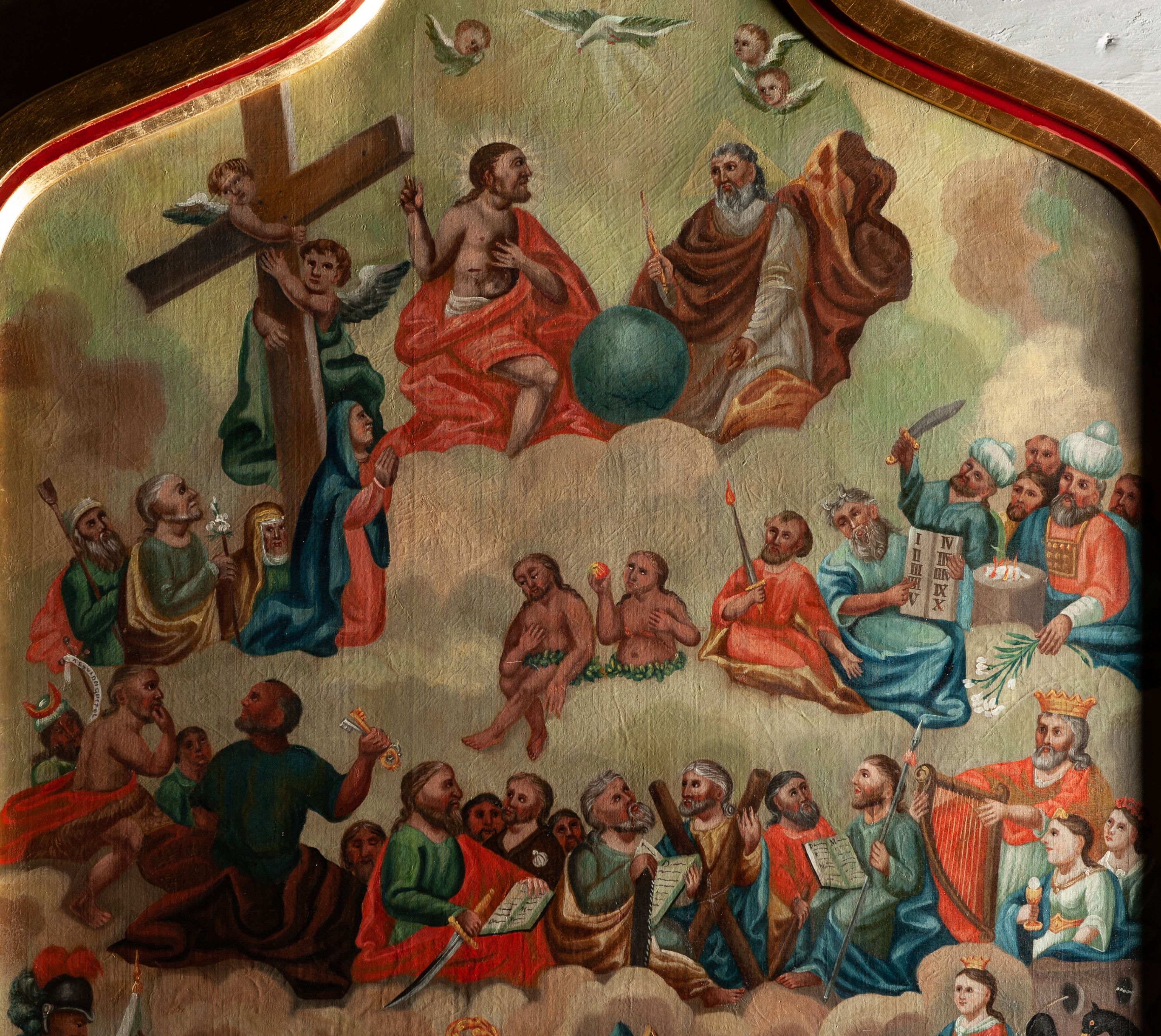 The eighteenth-century image originates from the former high altar, demolished in 1935, and depicts the Holy Trinity being adored by all the saints.