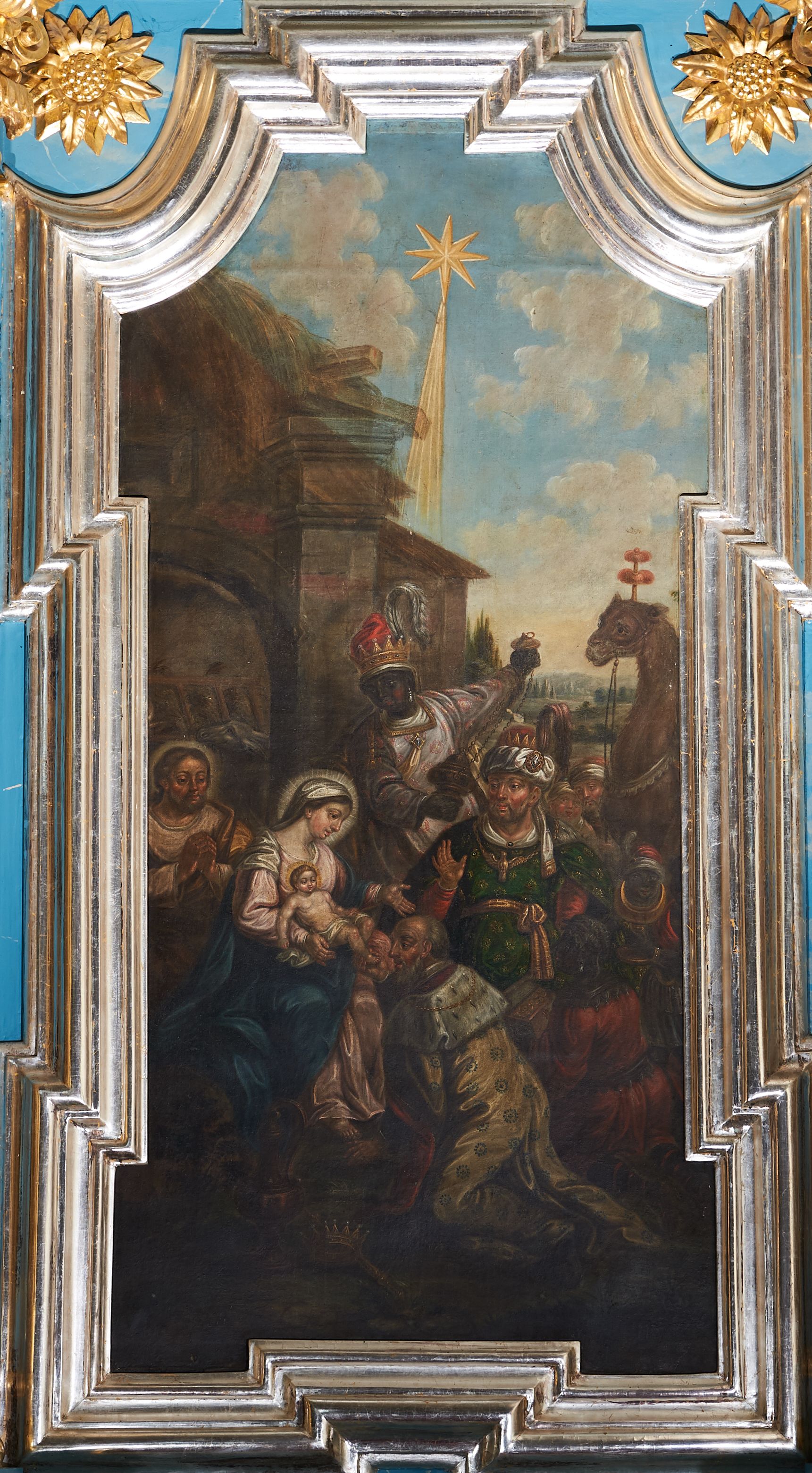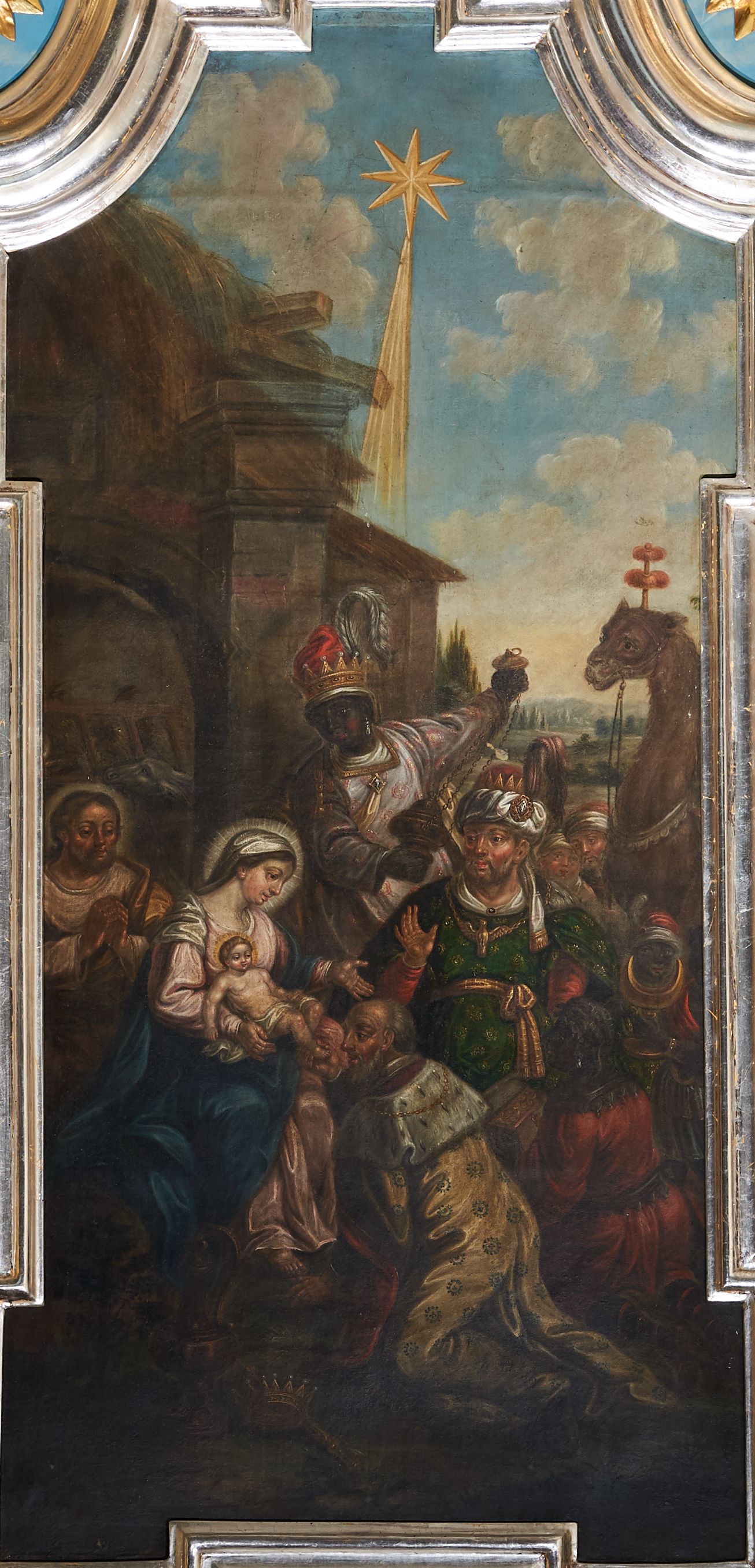 The painting depicts the Adoration of the Magi. It was painted in the 17th century and then placed in a small side altar in the church in Brody.