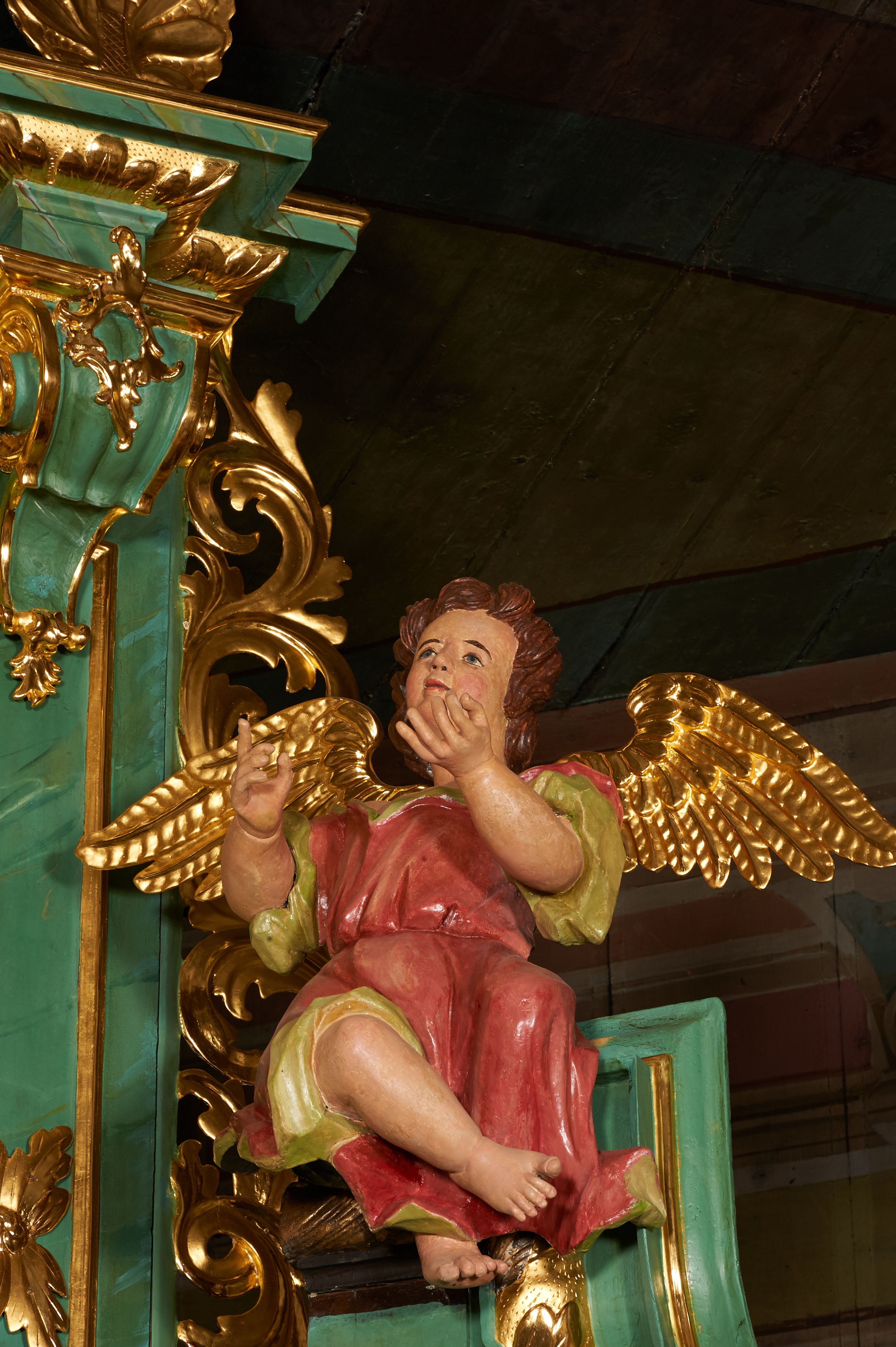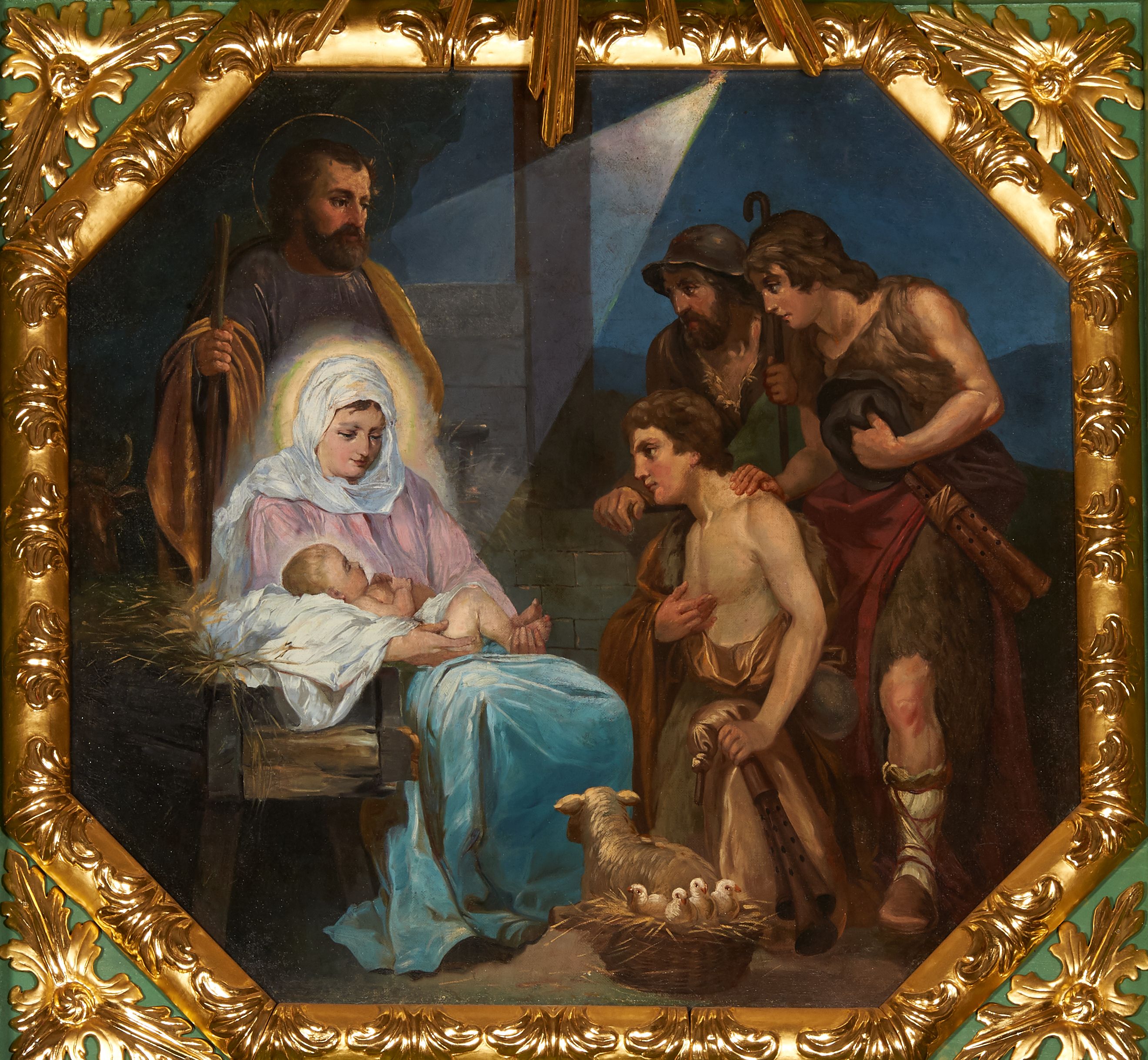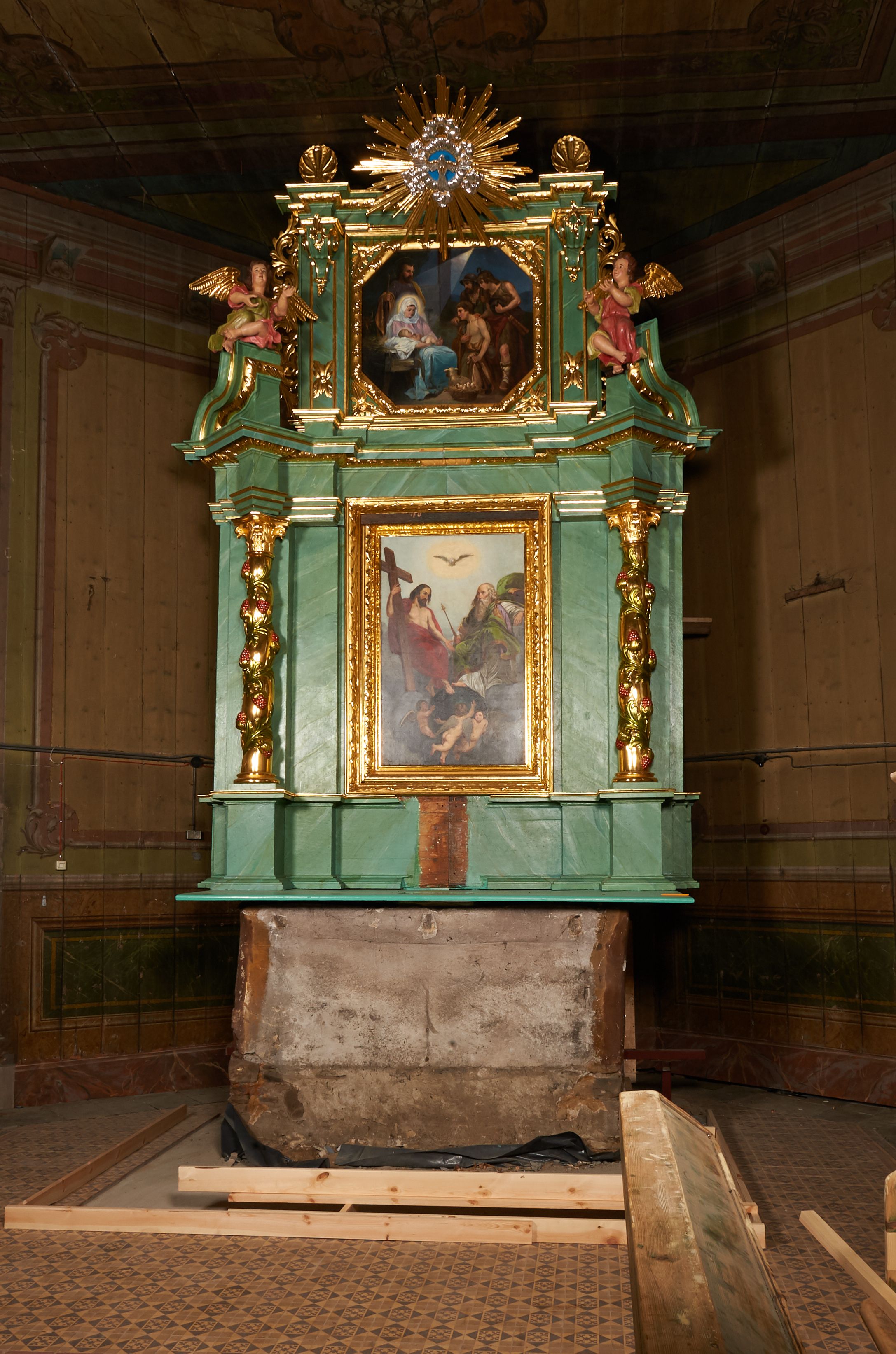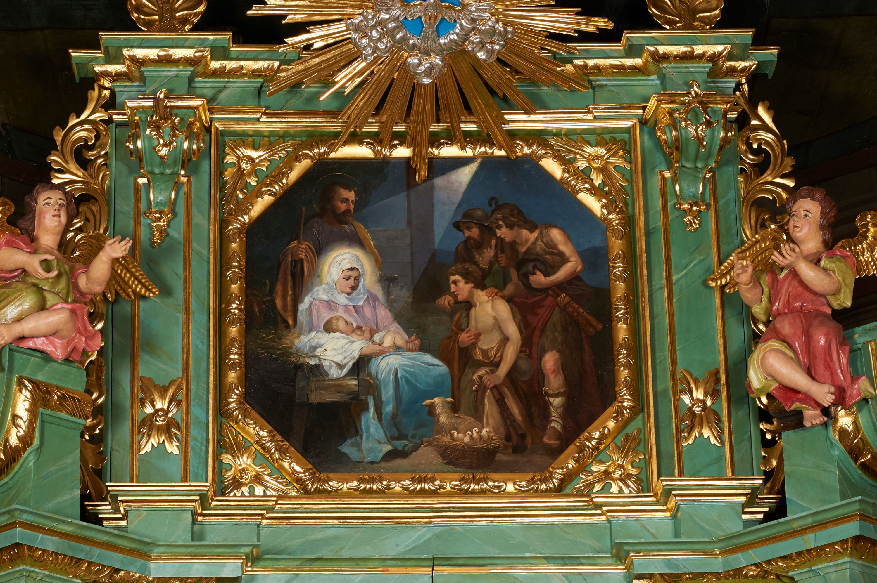 Painting depicting the Adoration of the Shepherds was probably painted in the fourth quarter of the 19th century or in the first quarter of the 20th century. It was re-mounted in the finial of the side altar. Events constituting the theme of the performance are described exclusively in the Gospel of St. Luke (Lk 2:8-20). The introduction of the figures of the shepherds and the three wise men into the scenes of the nativity play was intended to make the performance more laical and comprehensible to the worshippers.