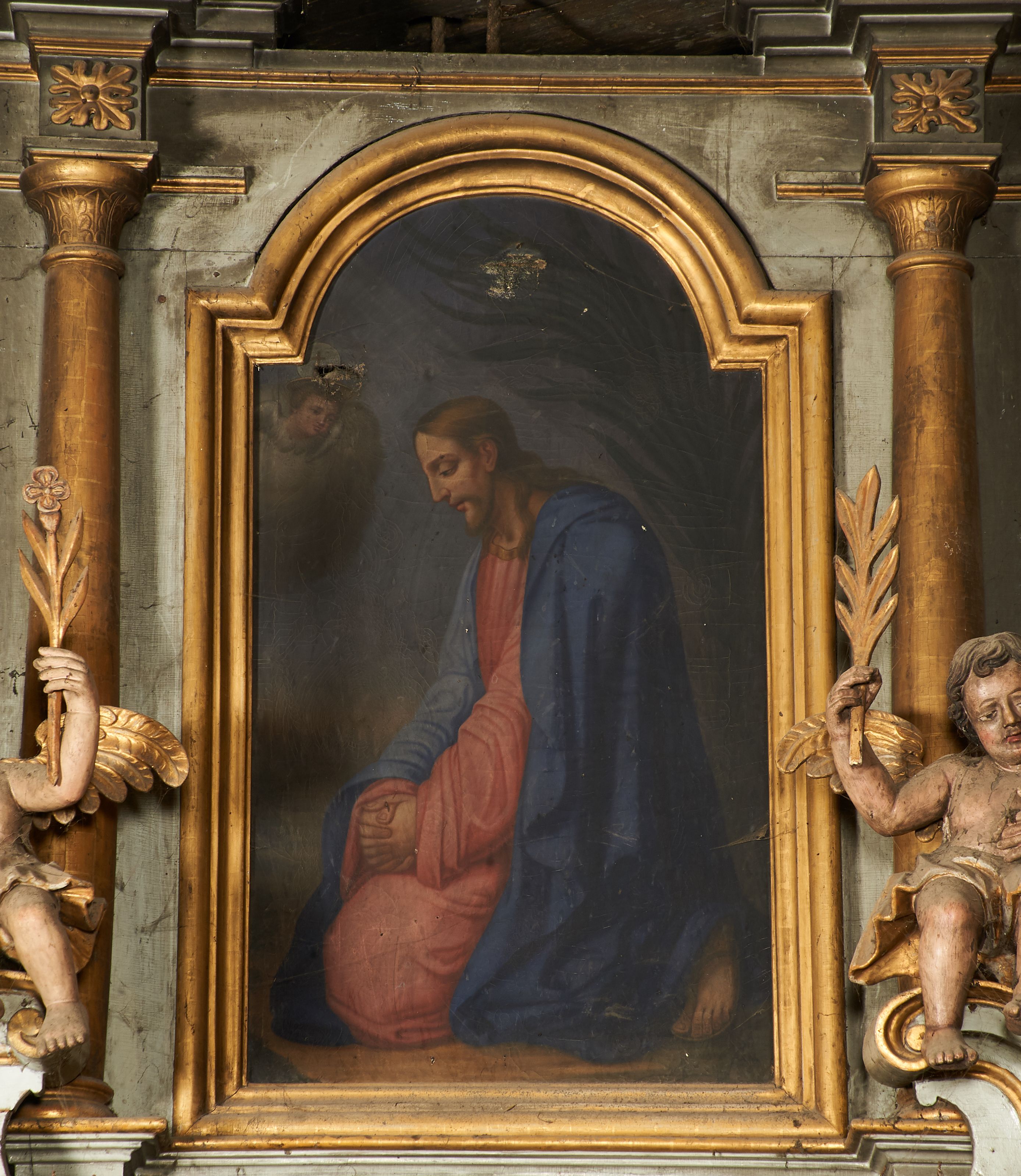 The painting "Agony in the Garden of Gethsemane" was most probably created in the second half of the 19th century. It was re-installed in the finial of the side altar. Agony in the Garden of Gethsemane is one of Passion's themes. It is described in the Gospels of: Matthew, Mark and Luke (Mt 26:36-46; Mk 14:32-42; Lk 22:39-46).