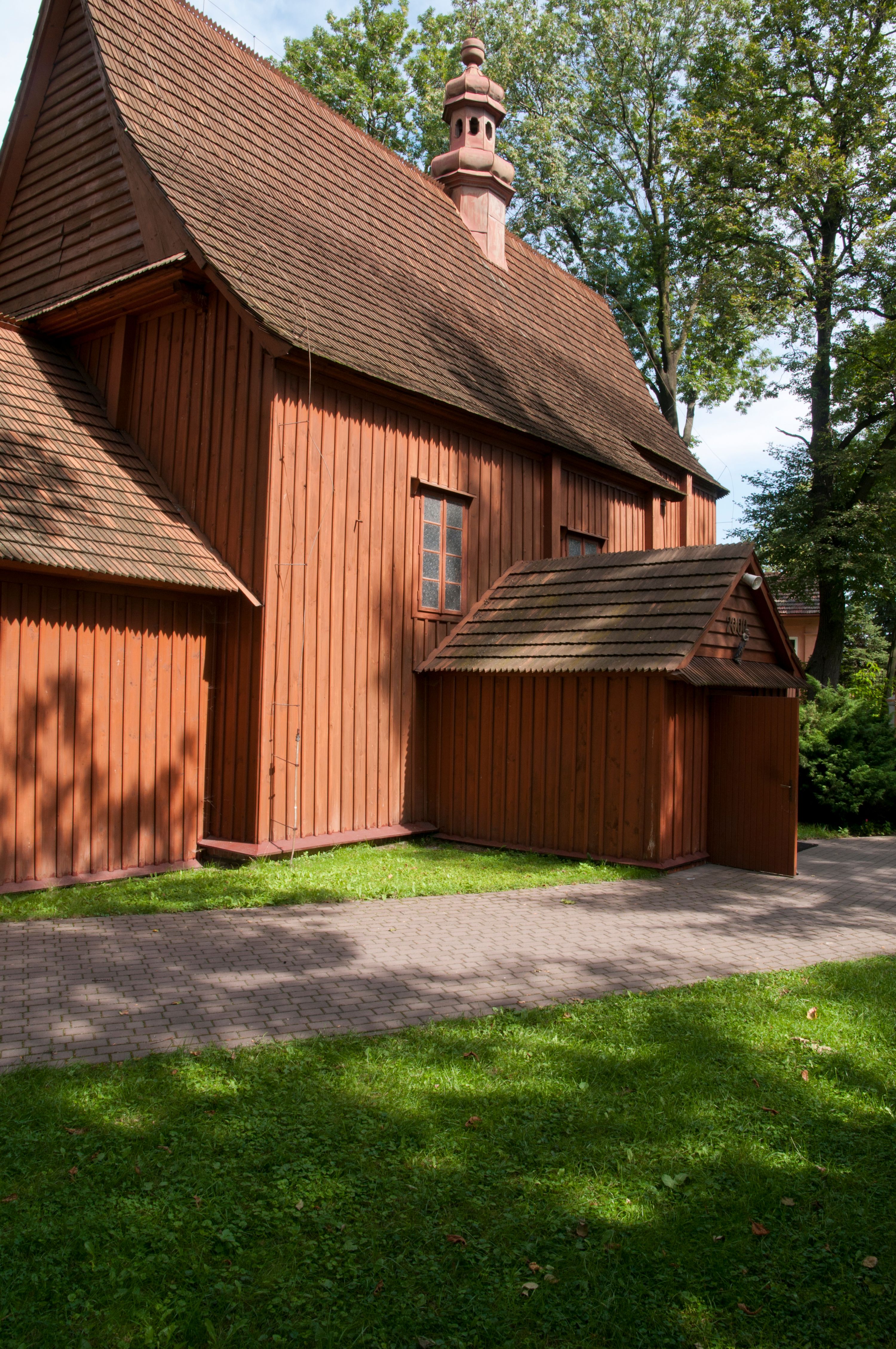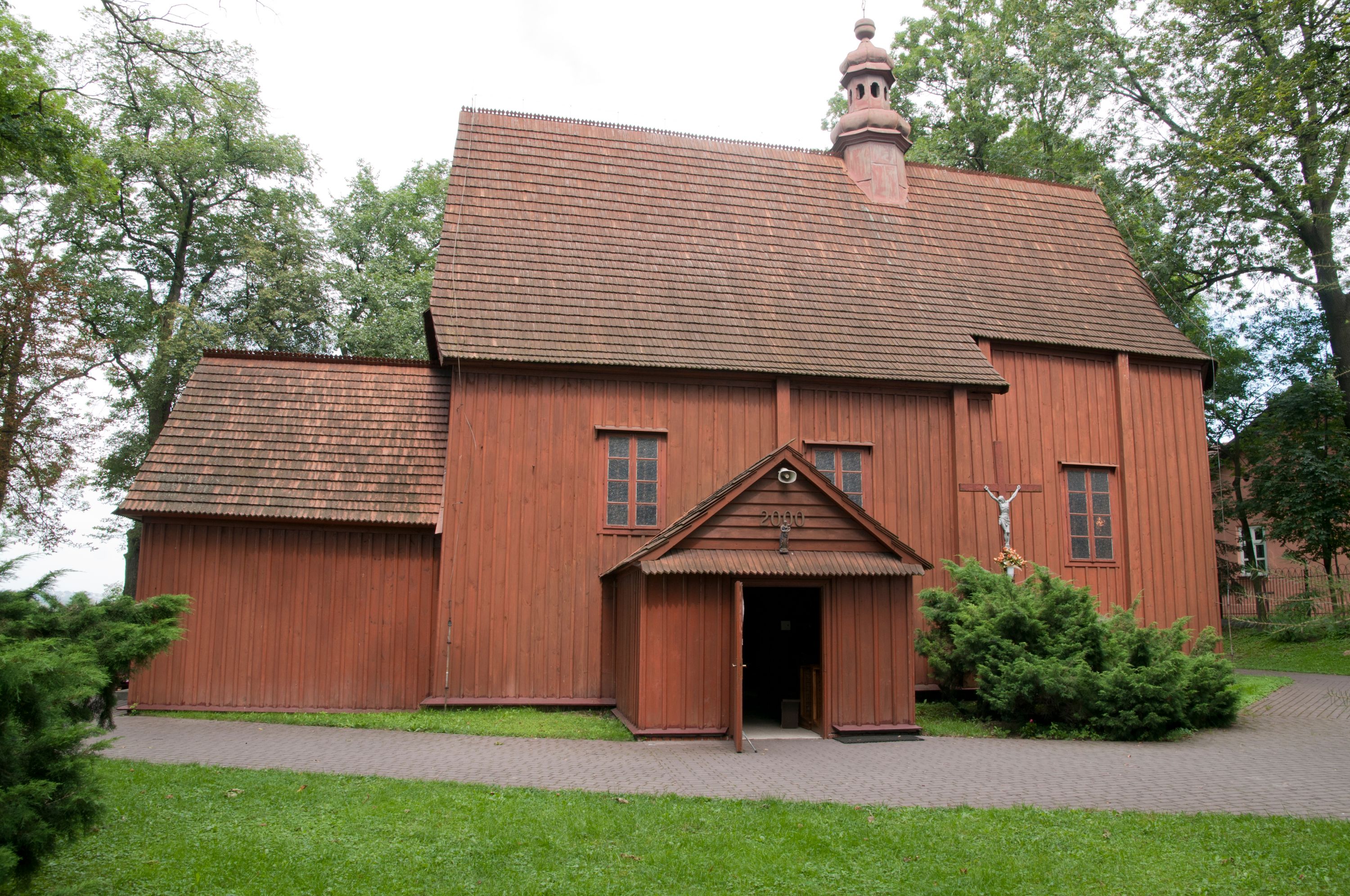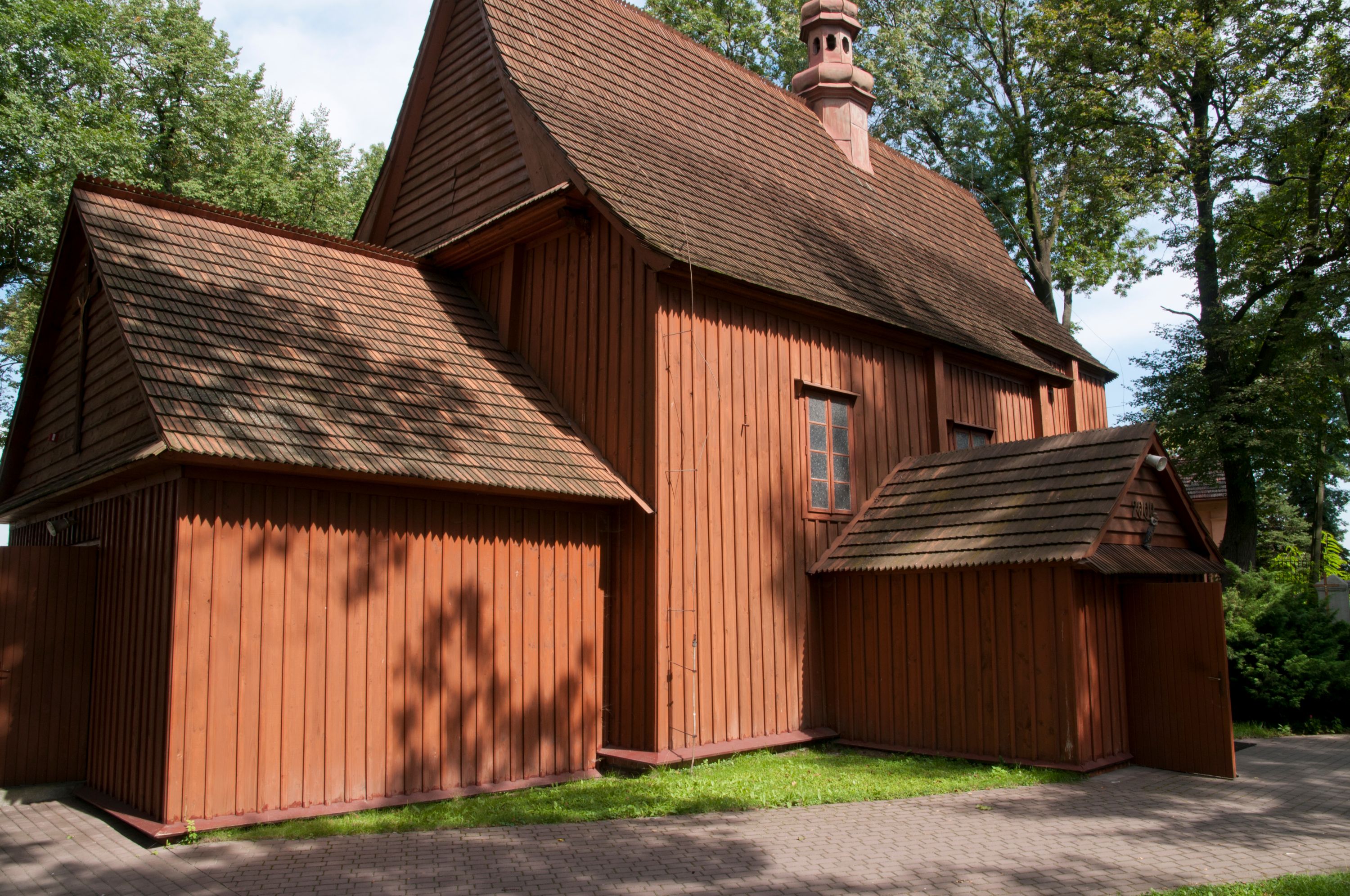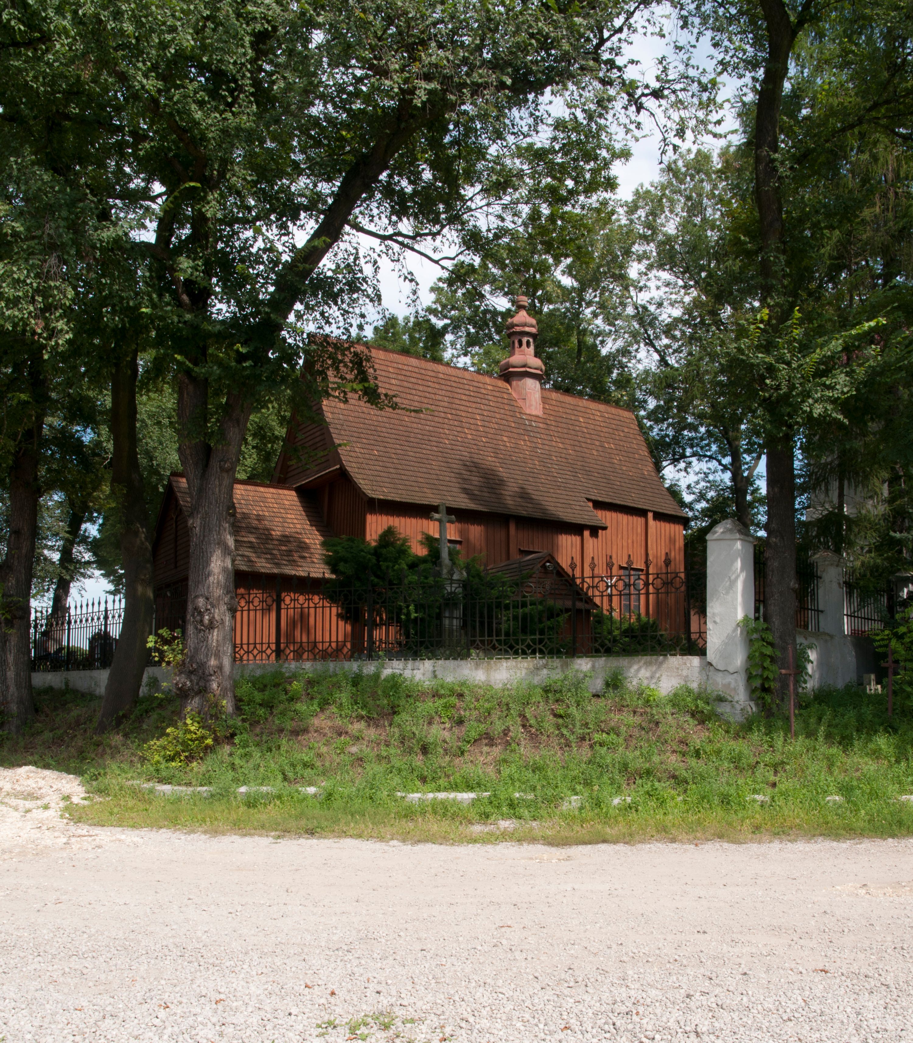 The first church in this place was mentioned as soon as in the 15th century. The present church, funded by Barbara Morsztynowa, was built in 1646 and consecrated in 1698. In 1774 it was described that: "the church has a shingled roof, which needs fixing, the walls are rotting. New one has to be built!". - In 1777, the building was thoroughly renovated thanks to Konstancja Wodzicka of Dębiński family, Castellan of Sandomierz. At the same time, parish priest Kajetan Kulpiński took care of the decor and polychrome, built a new sacristy and furnished it. The church was renovated in 1855, 1860 and 1885. In 1921 and 1943 church organs were renovated and in 1968 new organs were purchased. In 1953, the shingle roofing was replaced and the artist Jadwiga Rymarówna made a polychrome of the interior. In 1954, a chapel with a porcelain relief of Madonna and the Child by M. Piotrowski was built on the eastern external wall of the church. In 1955 electricity was installed. In 1970 the rotten planks in the walls of the church were replaced, also the shingles on the porch were replaced with sheet metal. Five years later, shingles, part of the wooden formwork and windows were replaced. In 1983 and 1993 shingles, windows, annexes, and formwork were replaced and concrete continuous footing and insulation were made. In 1998, the interior of the church, paintings, baptismal font, and altars were renovated and the four times repainted interior was restored to its original state. Further renovation works were carried out in the years 1997-2000. In 2002 the annexes were renovated.