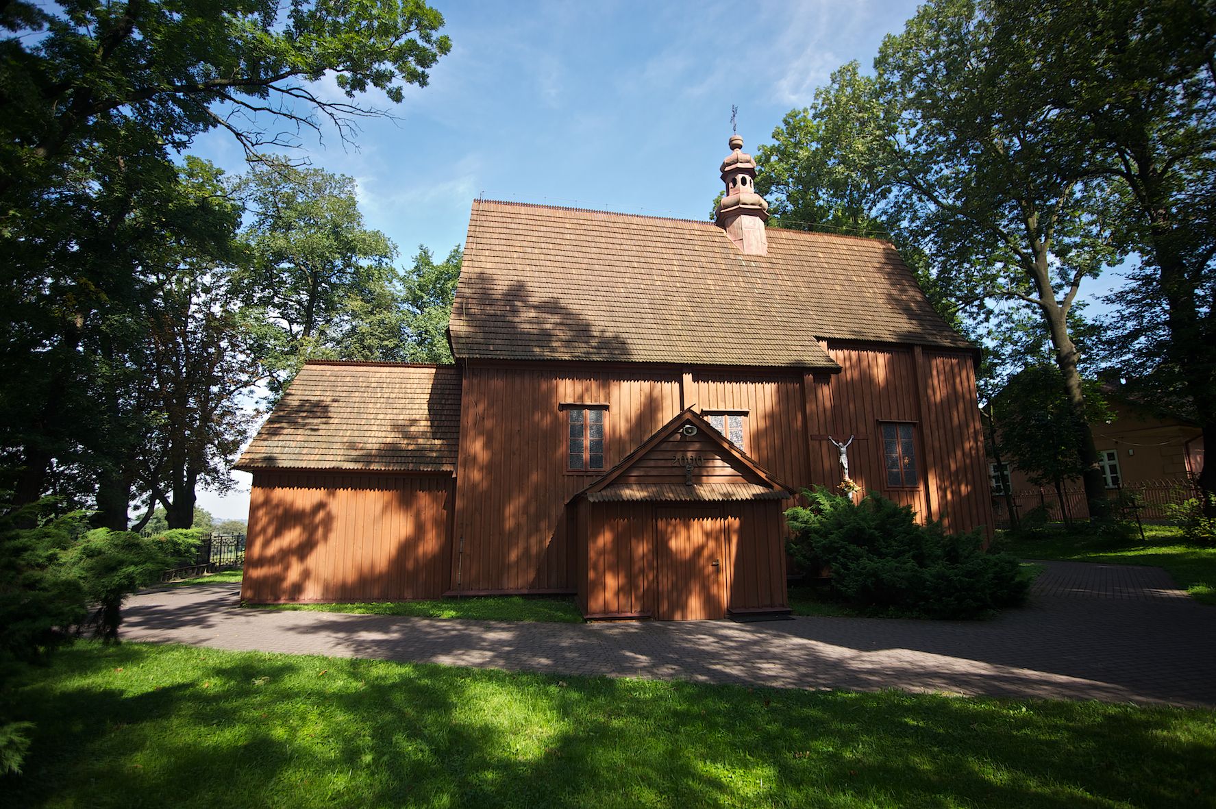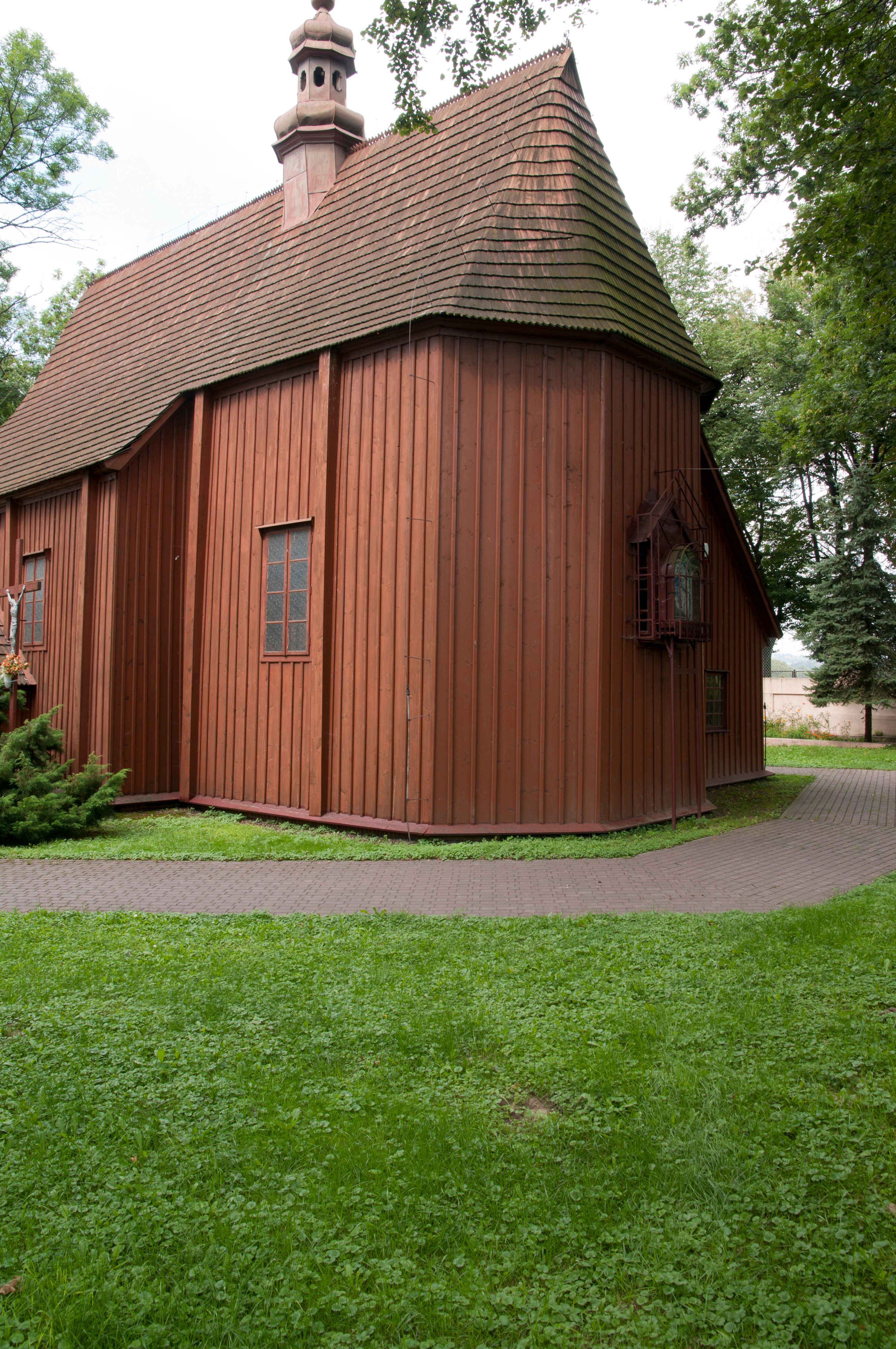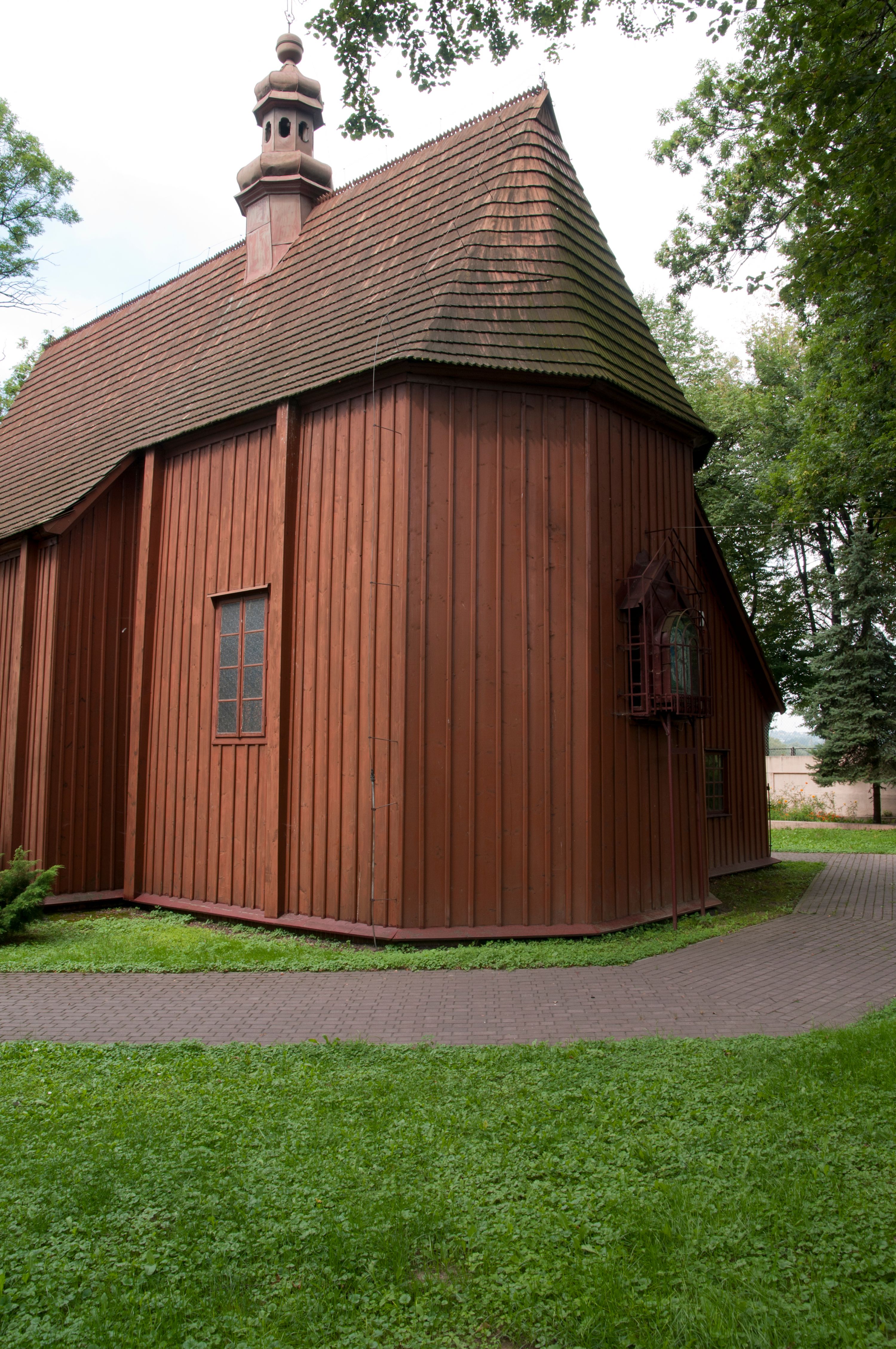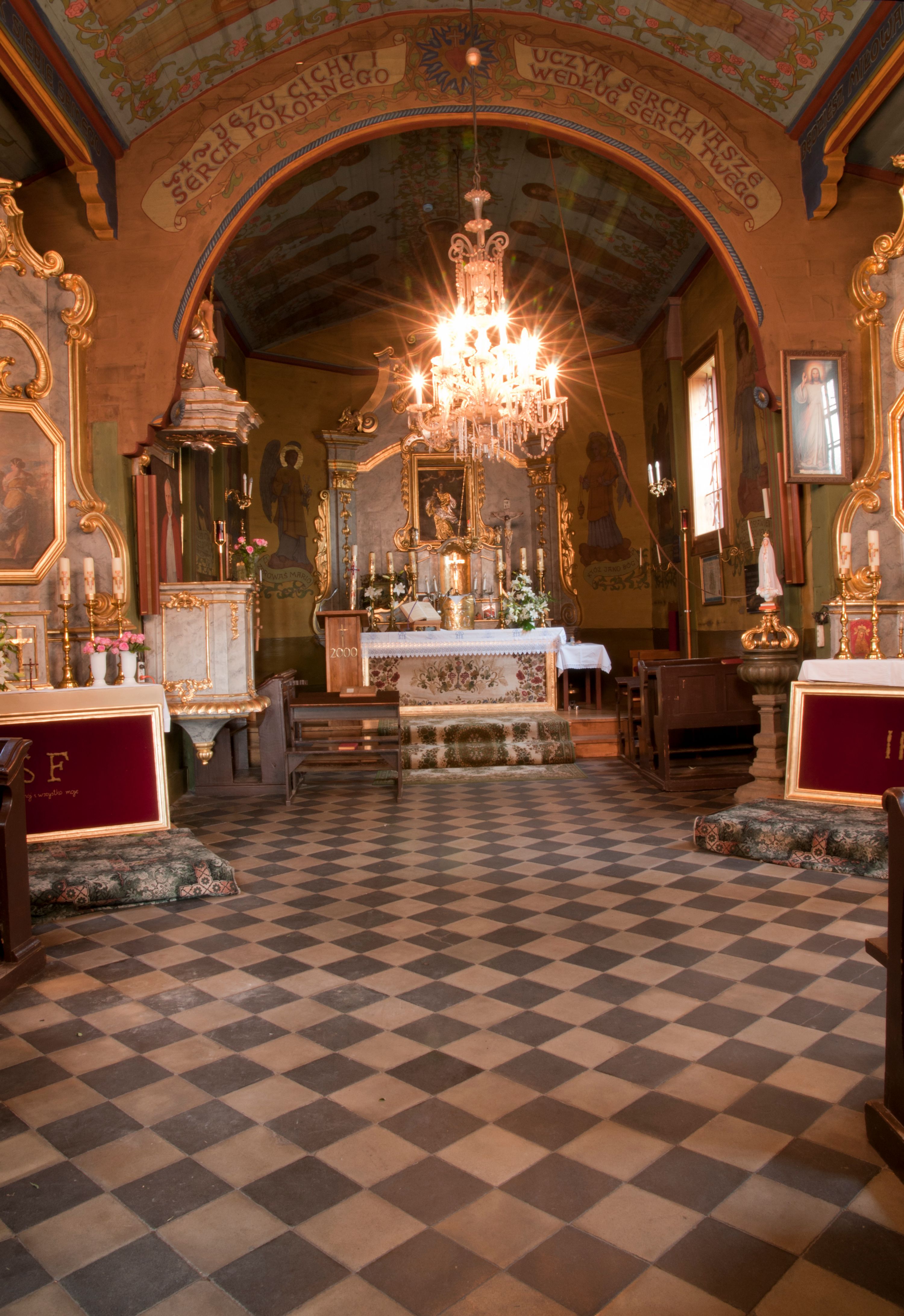 The first church in this place was mentioned as soon as in the 15th century. The present church, funded by Barbara Morsztynowa, was built in 1646 and consecrated in 1698. In 1774 it was described that: "the church has a shingled roof, which needs fixing, the walls are rotting. New one has to be built!". - In 1777, the building was thoroughly renovated thanks to Konstancja Wodzicka of Dębiński family, Castellan of Sandomierz. At the same time, parish priest Kajetan Kulpiński took care of the decor and polychrome, built a new sacristy and furnished it. The church was renovated in 1855, 1860 and 1885. In 1921 and 1943 church organs were renovated and in 1968 new organs were purchased. In 1953, the shingle roofing was replaced and the artist Jadwiga Rymarówna made a polychrome of the interior. In 1954, a chapel with a porcelain relief of Madonna and the Child by M. Piotrowski was built on the eastern external wall of the church. In 1955 electricity was installed. In 1970 the rotten planks in the walls of the church were replaced, also the shingles on the porch were replaced with sheet metal. Five years later, shingles, part of the wooden formwork and windows were replaced. In 1983 and 1993 shingles, windows, annexes, and formwork were replaced and concrete continuous footing and insulation were made. In 1998, the interior of the church, paintings, baptismal font, and altars were renovated and the four times repainted interior was restored to its original state. Further renovation works were carried out in the years 1997-2000. In 2002 the annexes were renovated.