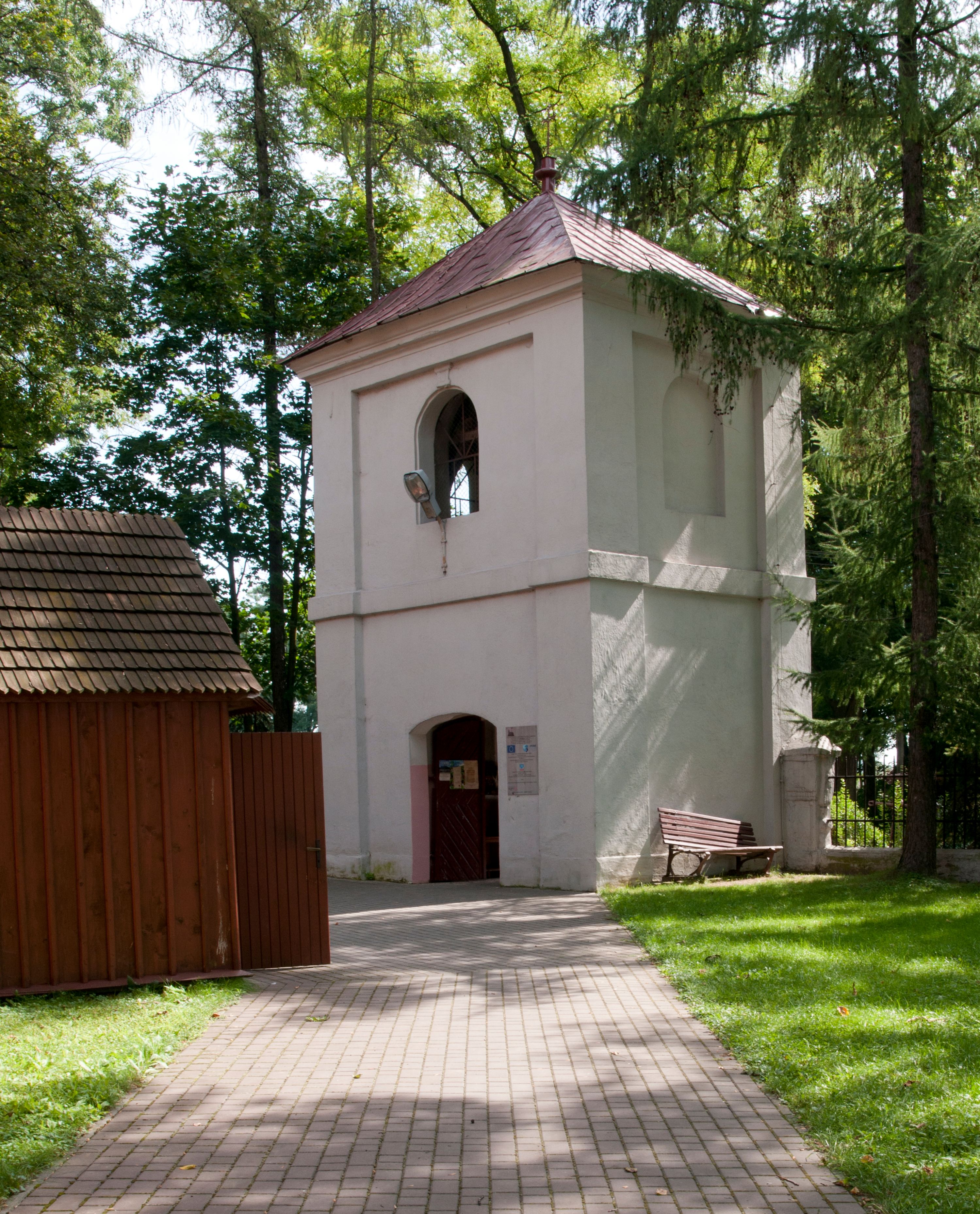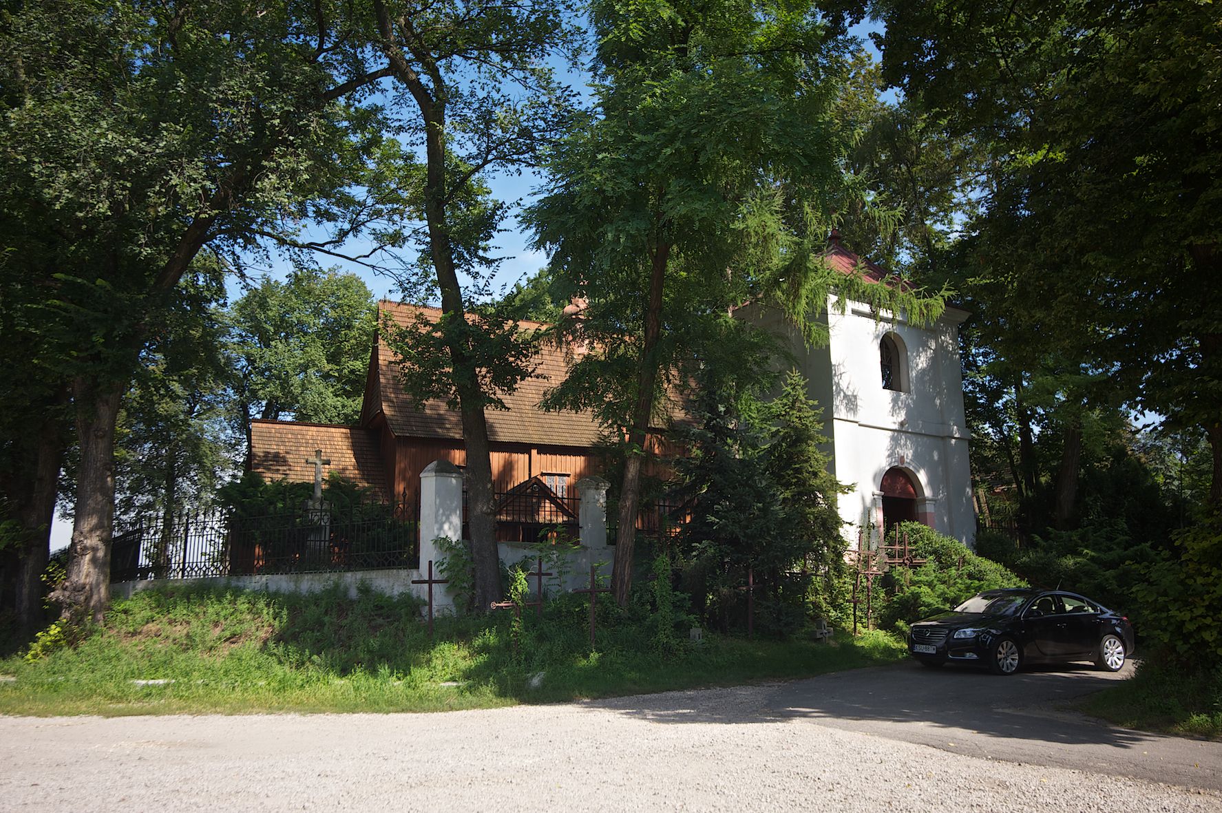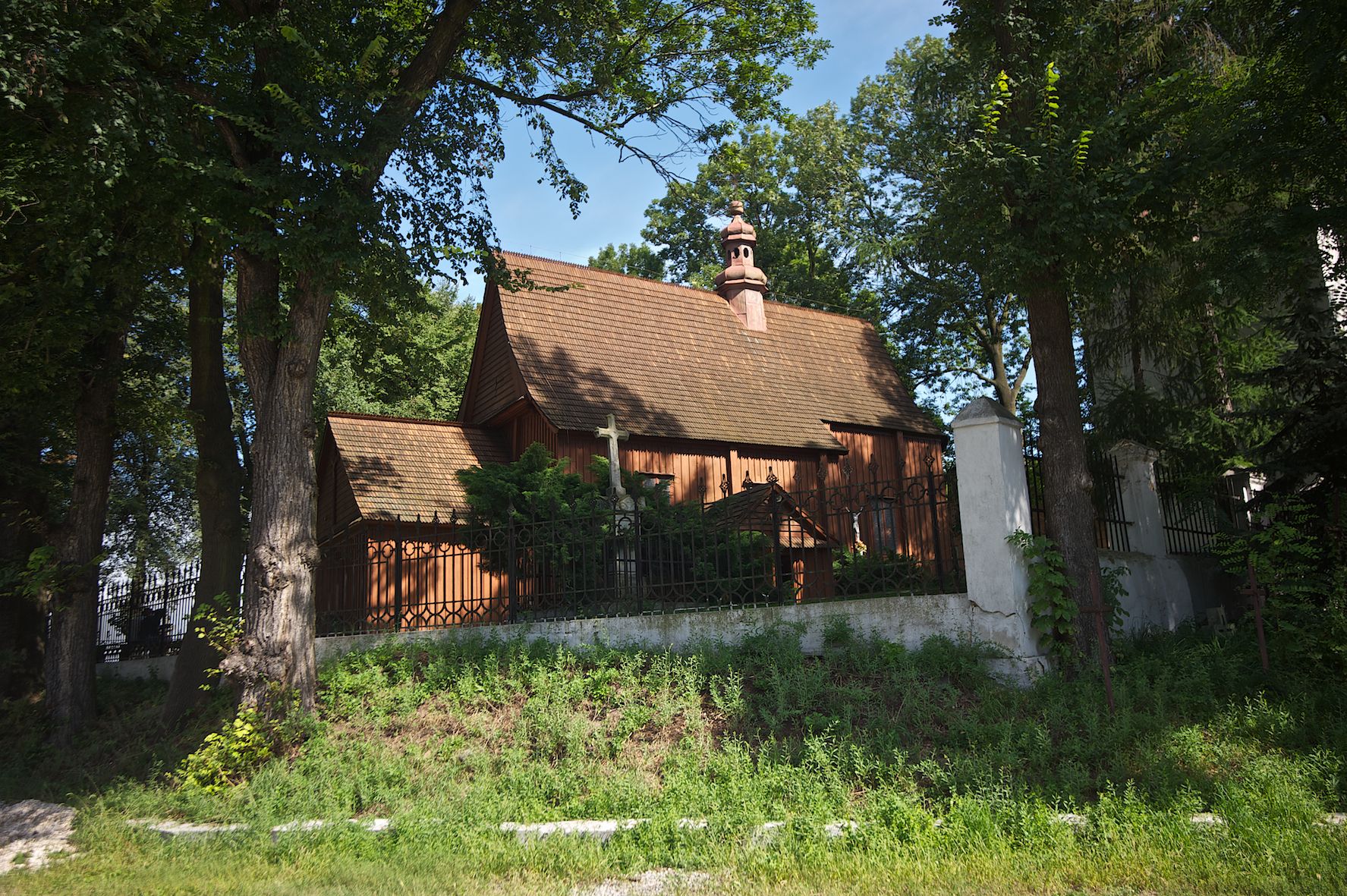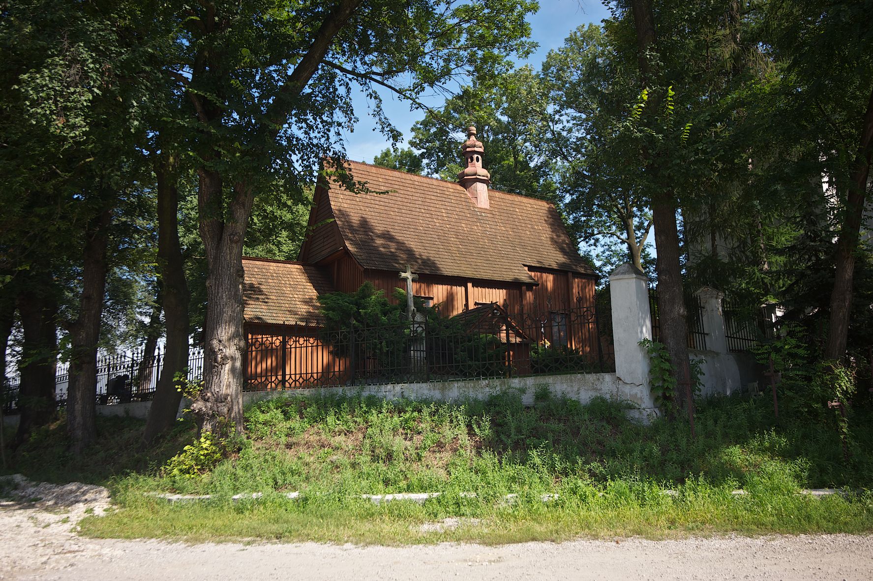 The first church in this place was mentioned as soon as in the 15th century. The present church, funded by Barbara Morsztynowa, was built in 1646 and consecrated in 1698. In 1774 it was described that: "the church has a shingled roof, which needs fixing, the walls are rotting. New one has to be built!". - In 1777, the building was thoroughly renovated thanks to Konstancja Wodzicka of Dębiński family, Castellan of Sandomierz. At the same time, parish priest Kajetan Kulpiński took care of the decor and polychrome, built a new sacristy and furnished it. The church was renovated in 1855, 1860 and 1885. In 1921 and 1943 church organs were renovated and in 1968 new organs were purchased. In 1953, the shingle roofing was replaced and the artist Jadwiga Rymarówna made a polychrome of the interior. In 1954, a chapel with a porcelain relief of Madonna and the Child by M. Piotrowski was built on the eastern external wall of the church. In 1955 electricity was installed. In 1970 the rotten planks in the walls of the church were replaced, also the shingles on the porch were replaced with sheet metal. Five years later, shingles, part of the wooden formwork and windows were replaced. In 1983 and 1993 shingles, windows, annexes, and formwork were replaced and concrete continuous footing and insulation were made. In 1998, the interior of the church, paintings, baptismal font, and altars were renovated and the four times repainted interior was restored to its original state. Further renovation works were carried out in the years 1997-2000. In 2002 the annexes were renovated.