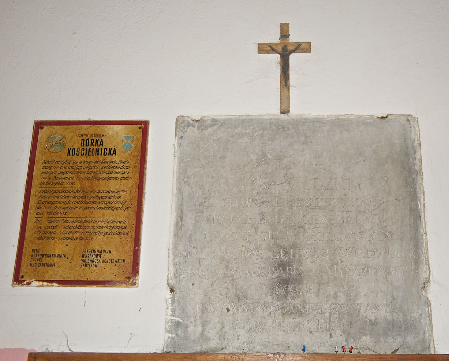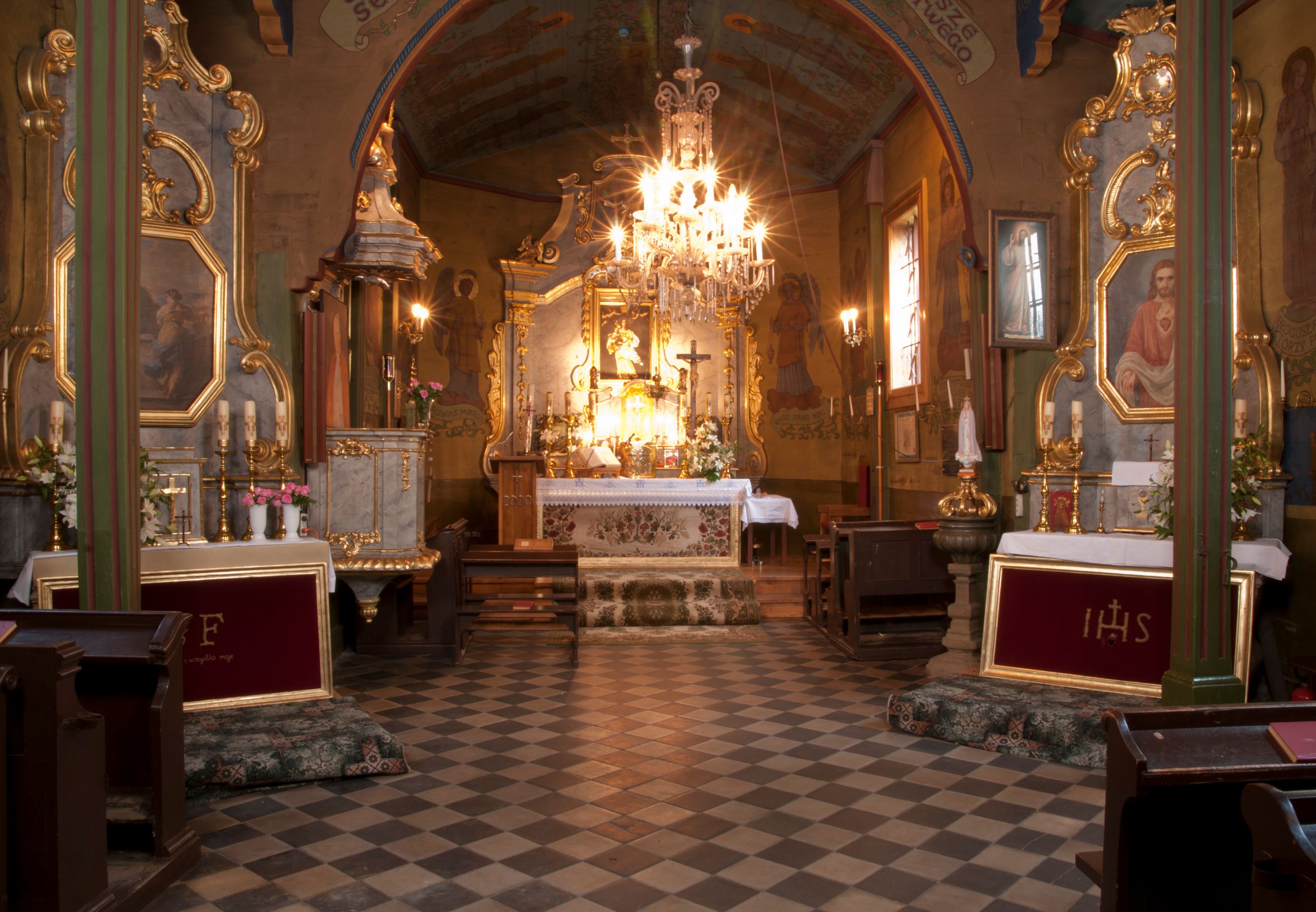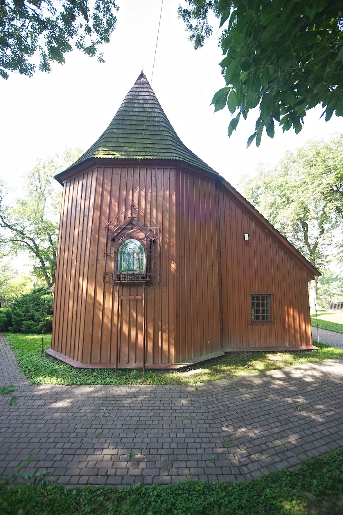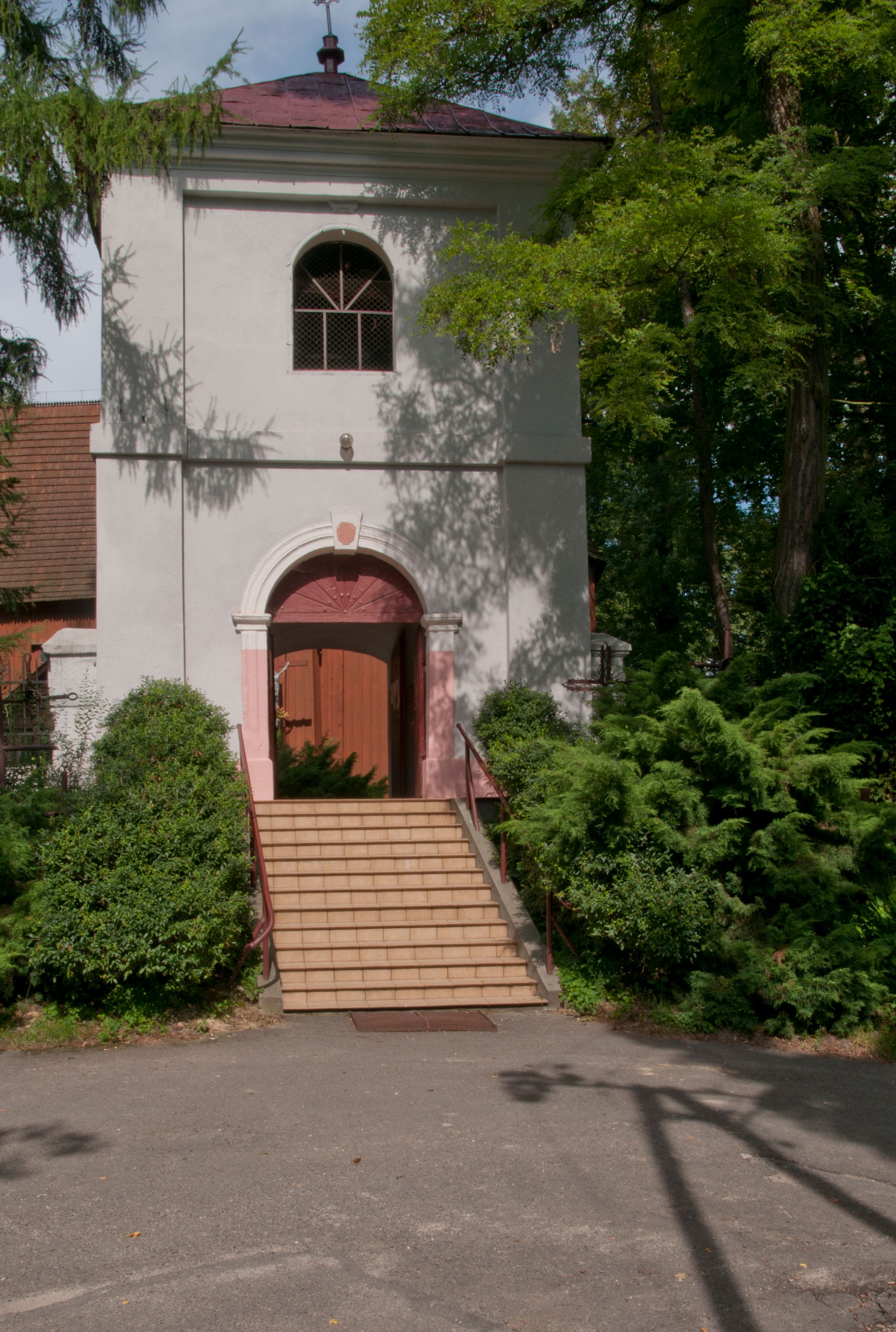 The first church in this place was mentioned as soon as in the 15th century. The present church, funded by Barbara Morsztynowa, was built in 1646 and consecrated in 1698. In 1774 it was described that: "the church has a shingled roof, which needs fixing, the walls are rotting. New one has to be built!". - In 1777, the building was thoroughly renovated thanks to Konstancja Wodzicka of Dębiński family, Castellan of Sandomierz. At the same time, parish priest Kajetan Kulpiński took care of the decor and polychrome, built a new sacristy and furnished it. The church was renovated in 1855, 1860 and 1885. In 1921 and 1943 church organs were renovated and in 1968 new organs were purchased. In 1953, the shingle roofing was replaced and the artist Jadwiga Rymarówna made a polychrome of the interior. In 1954, a chapel with a porcelain relief of Madonna and the Child by M. Piotrowski was built on the eastern external wall of the church. In 1955 electricity was installed. In 1970 the rotten planks in the walls of the church were replaced, also the shingles on the porch were replaced with sheet metal. Five years later, shingles, part of the wooden formwork and windows were replaced. In 1983 and 1993 shingles, windows, annexes, and formwork were replaced and concrete continuous footing and insulation were made. In 1998, the interior of the church, paintings, baptismal font, and altars were renovated and the four times repainted interior was restored to its original state. Further renovation works were carried out in the years 1997-2000. In 2002 the annexes were renovated.