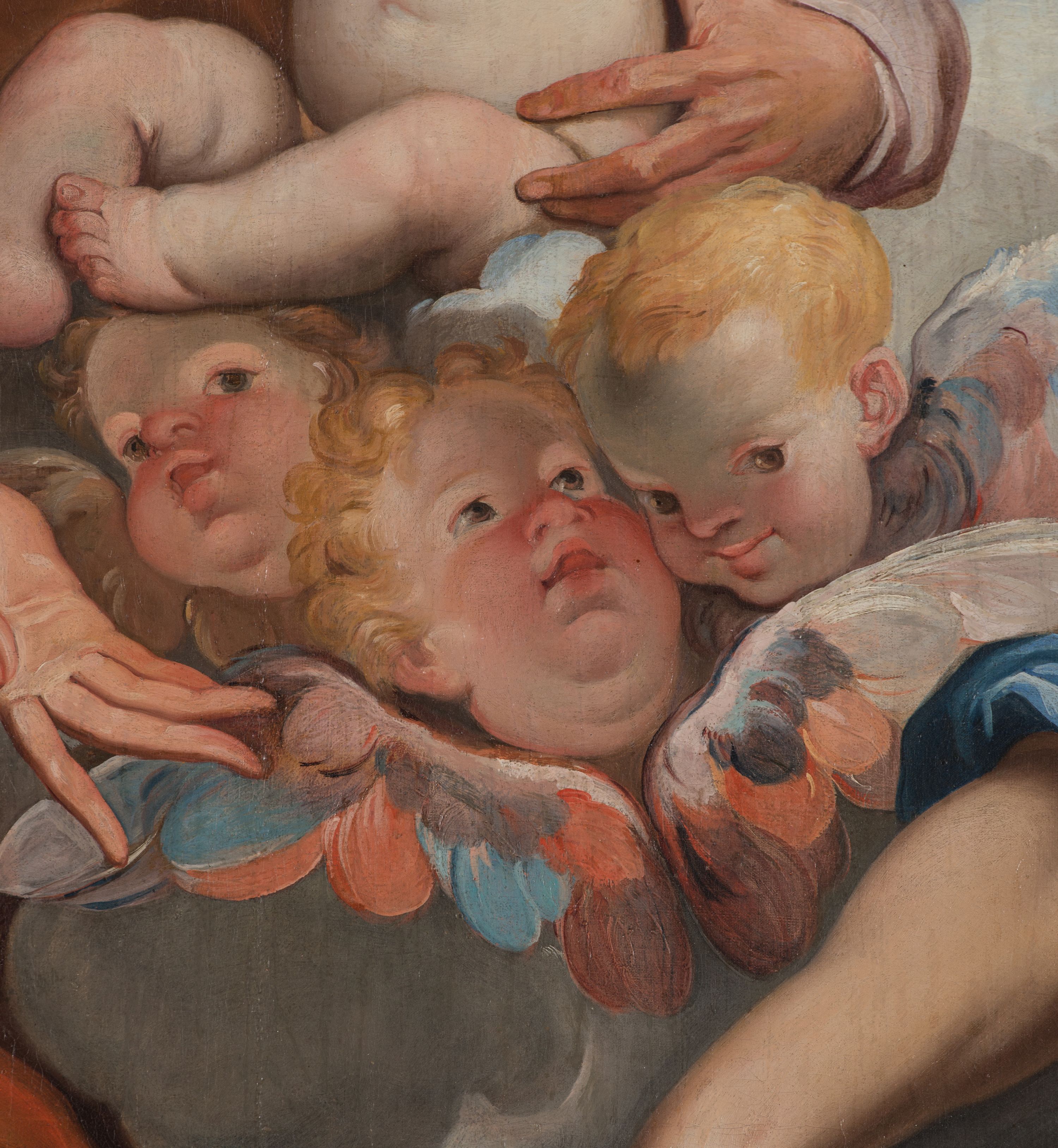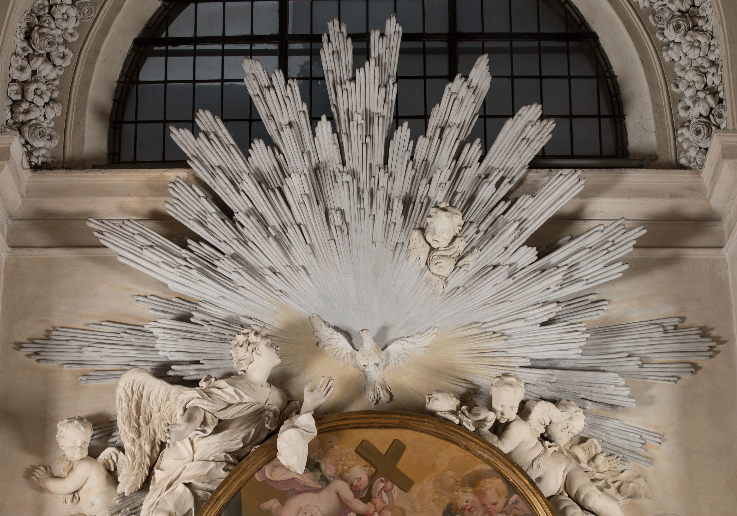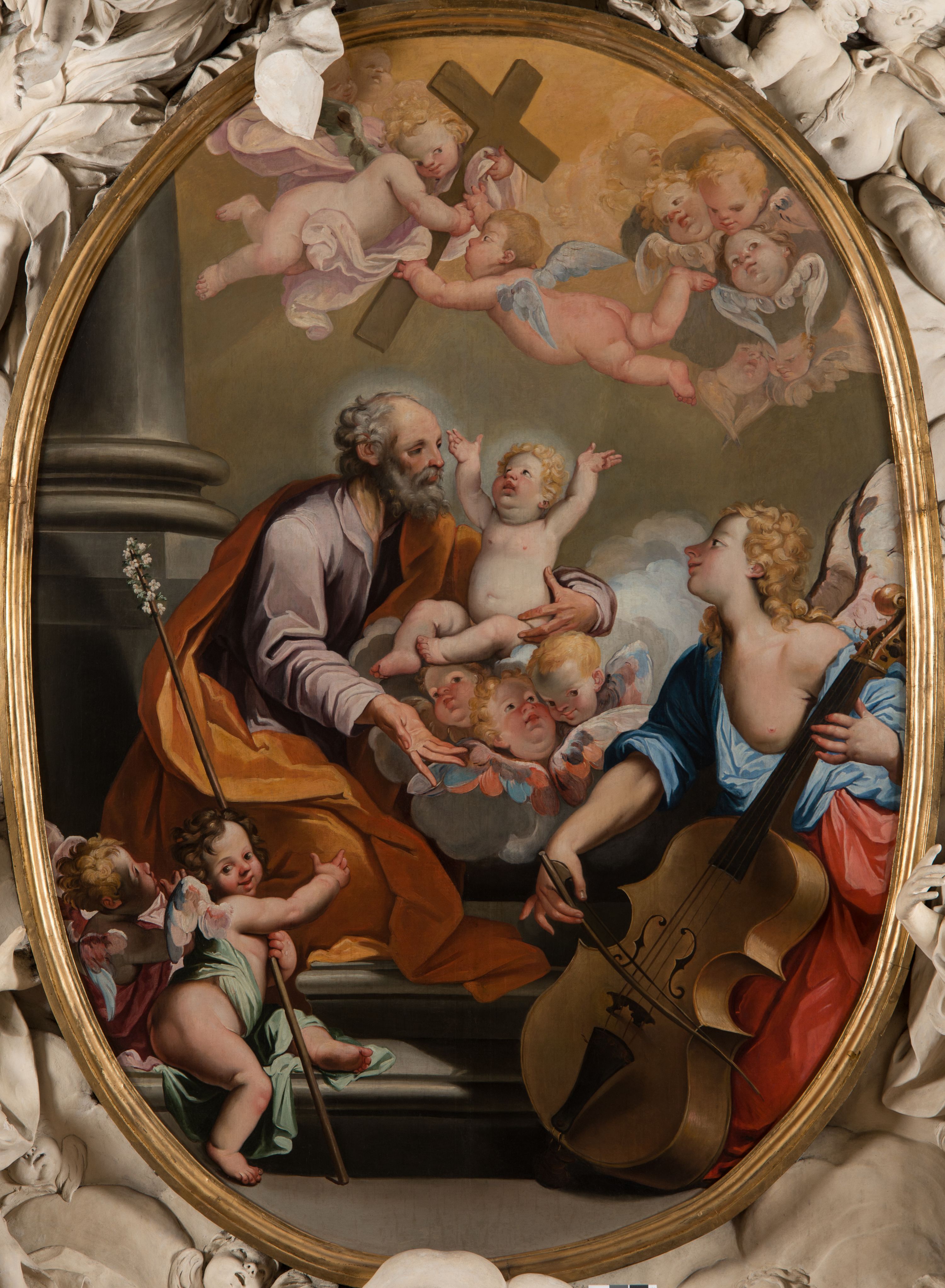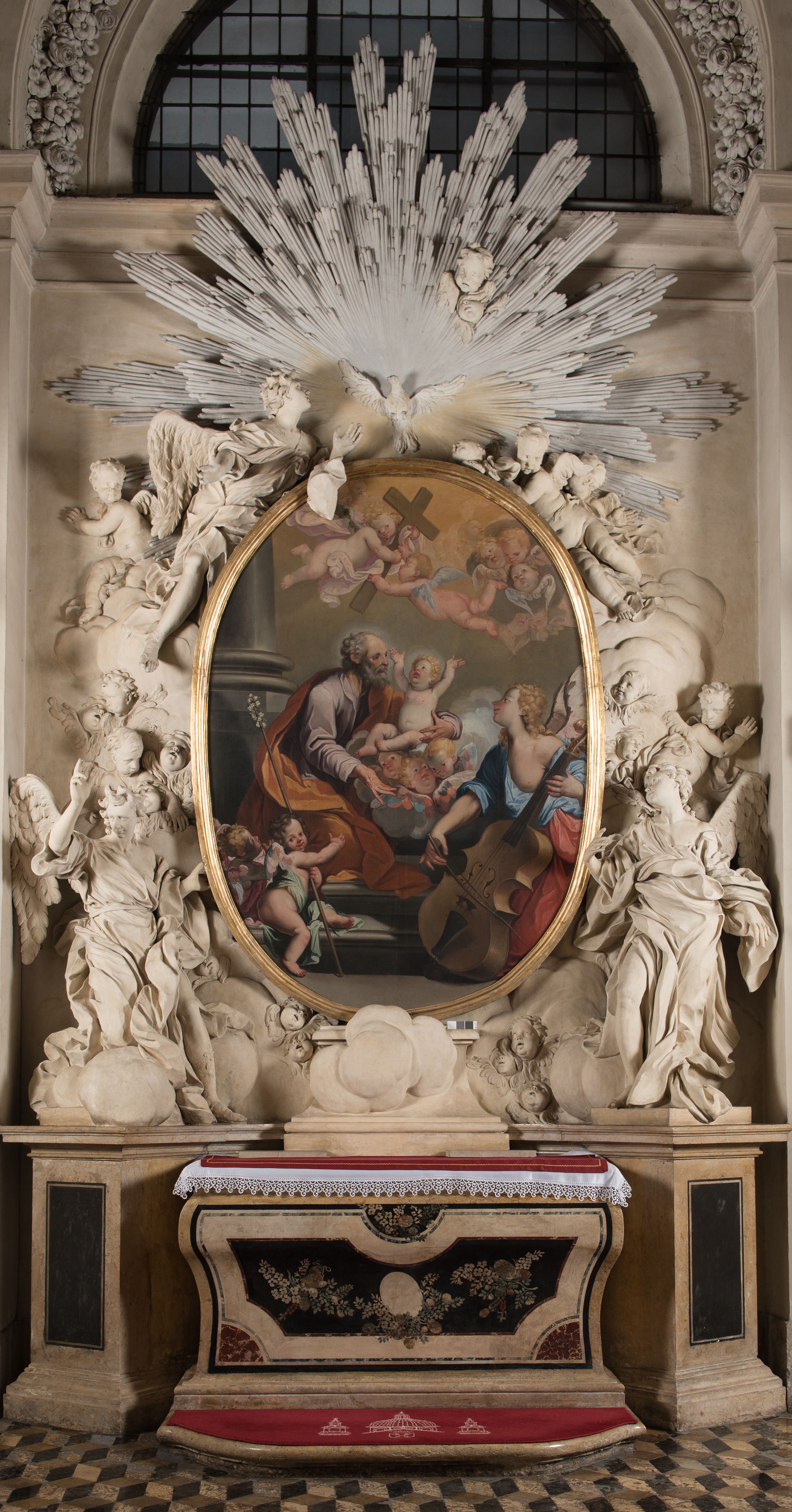 The altar in St. Joseph's chapel was built in 1695-1703. Its structure and sculptural decoration were made by Baltazar Fontana and his workshop. The innovative type of reredos, in the form of an oval painting flanking by angels, was inspired by Roman works from the circle of Giovanni Lorenzo Bernini (altars in the Church of Santa Maria del Popolo).