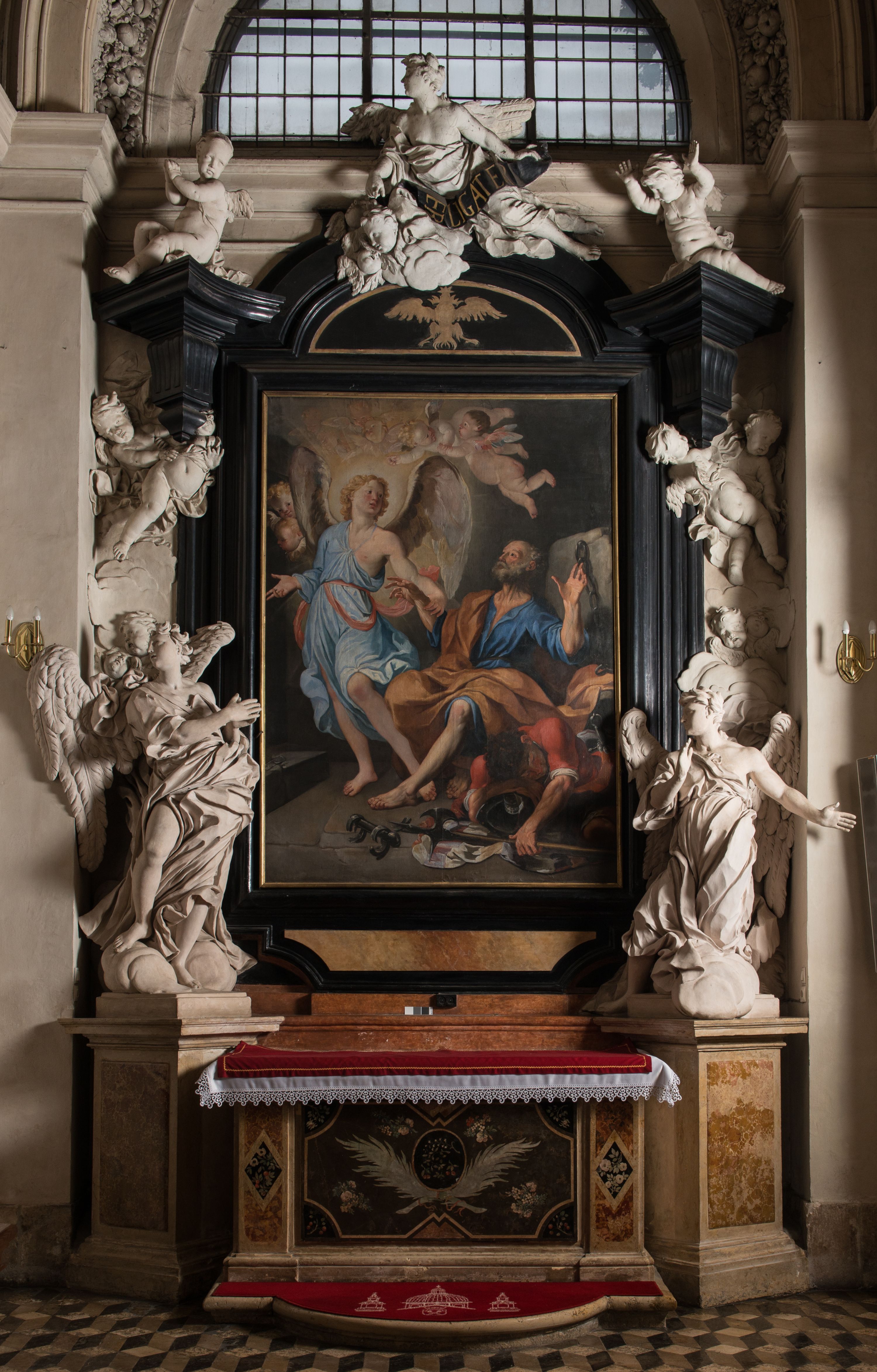 The St. Peter's altar was built in 1695-1703. Its author was Baltazar Fontana and his workshop. An innovative type of reredos in Poland – with a pair of angels flanking a painting, was taken from the Roman art. The altars in the Church of Santa Maria del Popolo, most probably created to the designs of Giovanni Lorenzo Bernini, were the source of inspiration. Modeling angels in an expressive way, with wave-shaped draperies, the artist was inspired by statues on the Angel's Bridge in Rome, and, above all, Bernini's angels in the Church of San Andrea della Fratte.