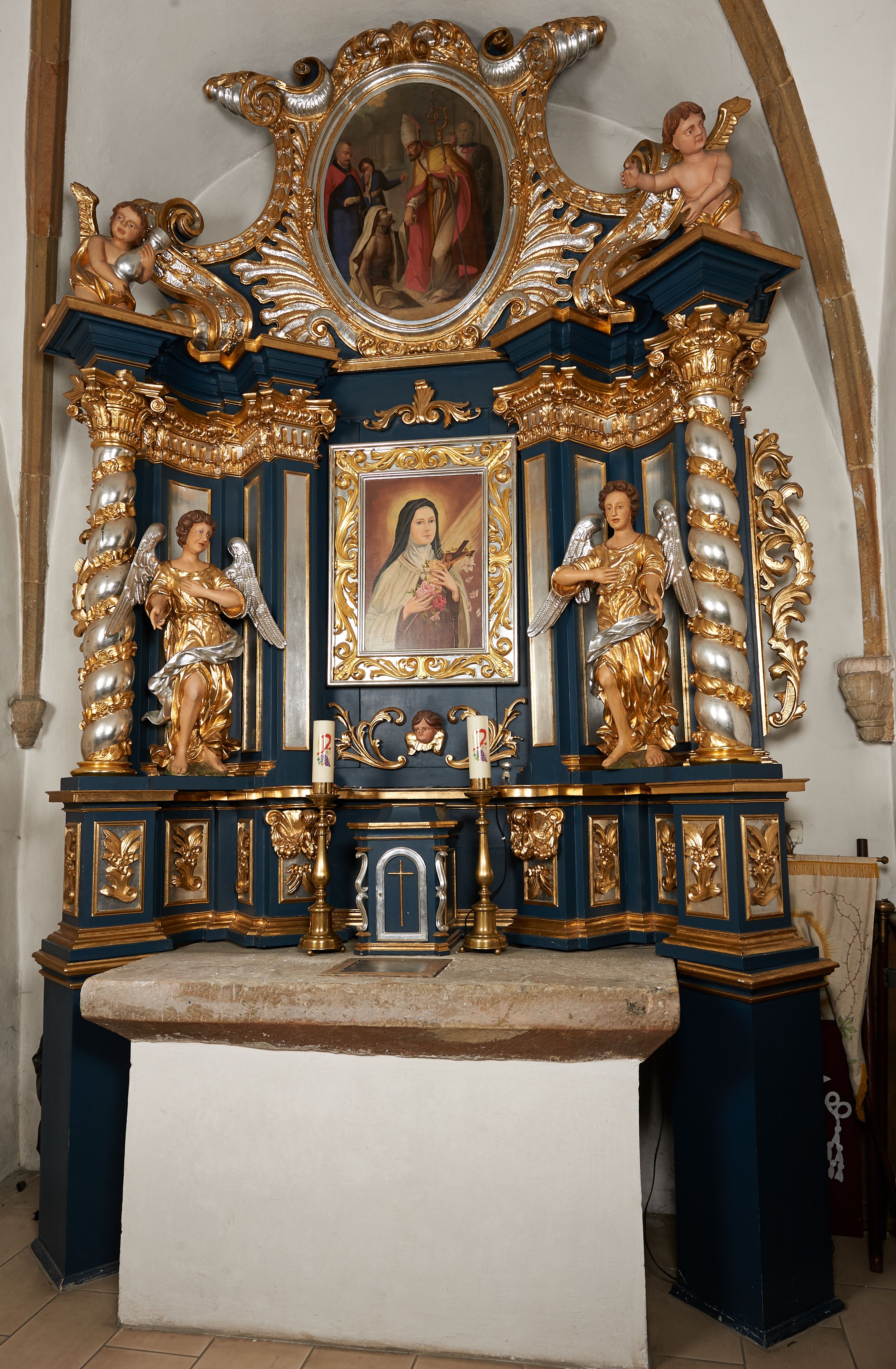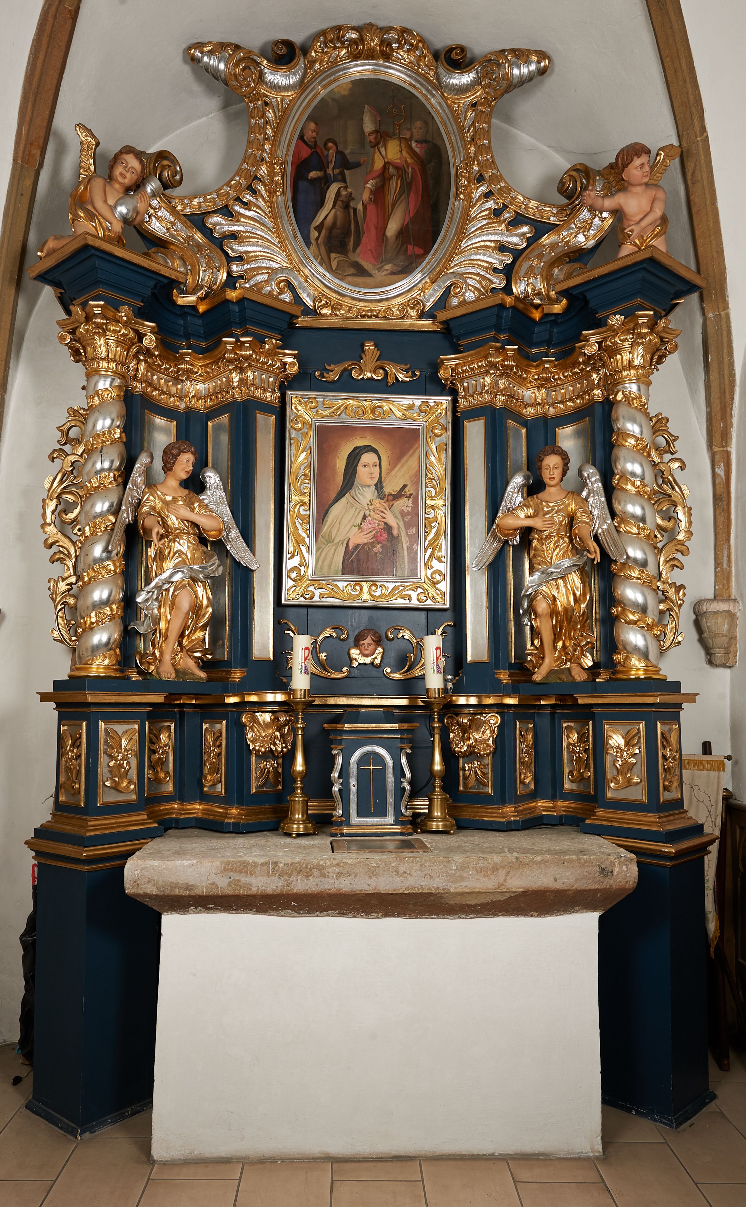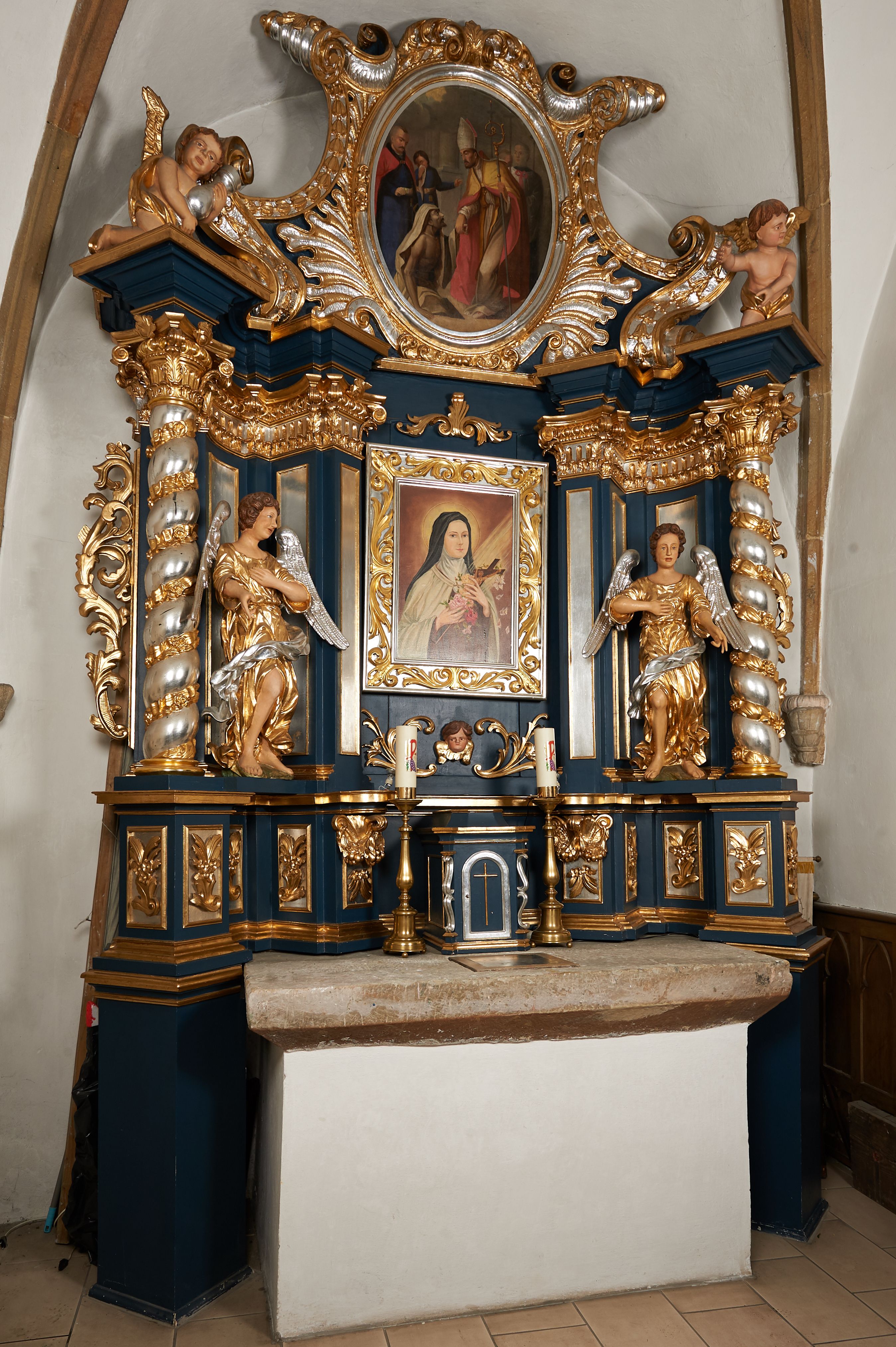 The altar, most probably, came into being in the second quarter of the 18th century and comes from the parish church in Wadowice. In 1899, on the initiative of Franciszek Błachut – a resident of Wadowice –and parish priest in Łazany, the reredos along with the second late baroque altar (non-preserved) was moved to the temple in Łazany. Originally, the main area of the altar included the painting depiciting St. John of Kety, which does not exist today. Currently, the painting has been replaced with an image of St. Thérèse of Lisieux, created in the 20th century. In 1900, a painting of St. Stanislaus was placed in the altar final which was modelled after "Resurrection of Piotrawin" painted by Tadeusz Kuntze-Konicz.