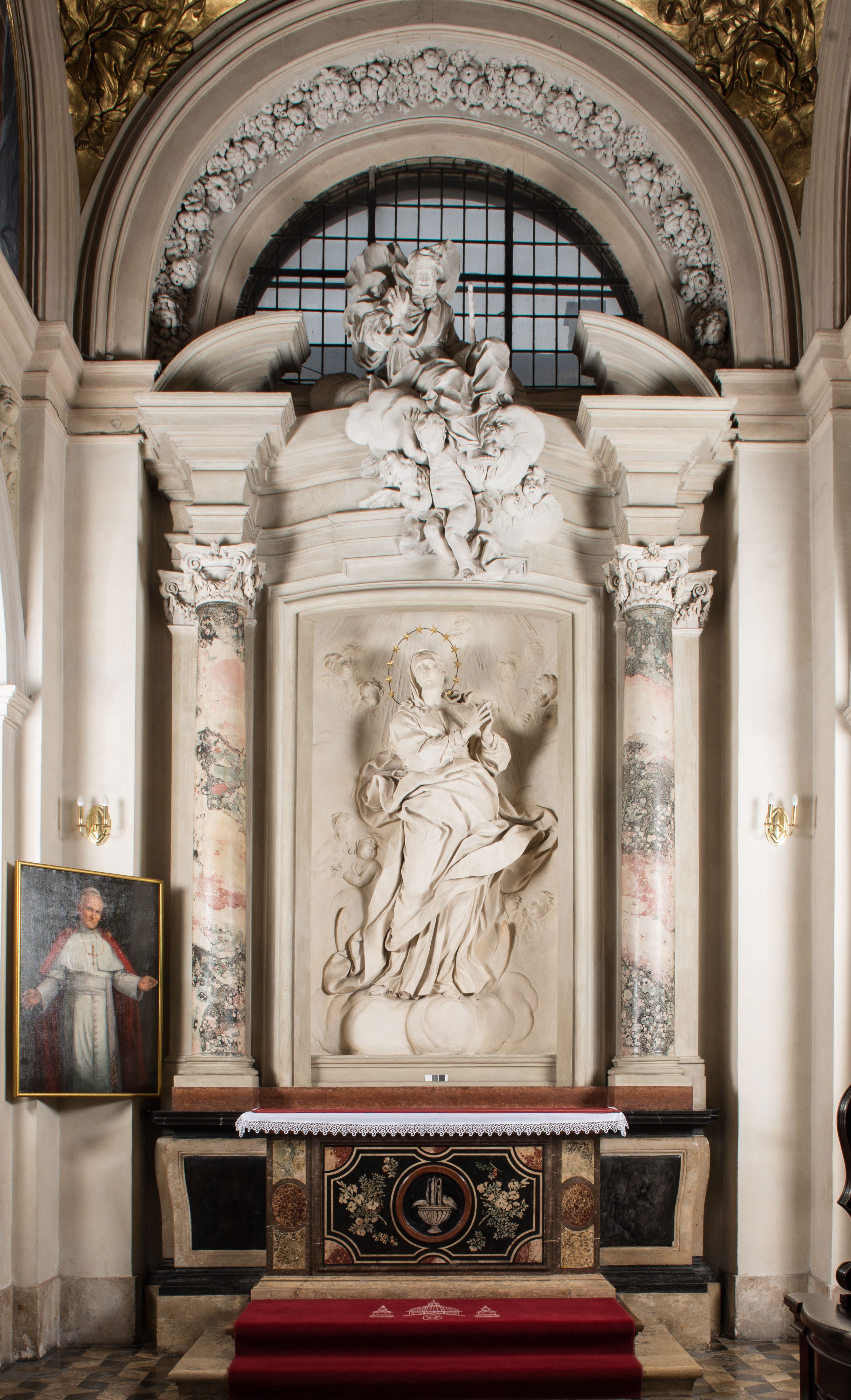 The altar in the chapel of Our Lady of the Immaculate Conception was built in 1695-1703. Its author was Baltazar Fontana and his workshop. In this work, the sculptor used a solution taken from Roman art – illumination of the statue with light falling from a hole invisible to a viewer, located behind the bow-fronted entablature.
