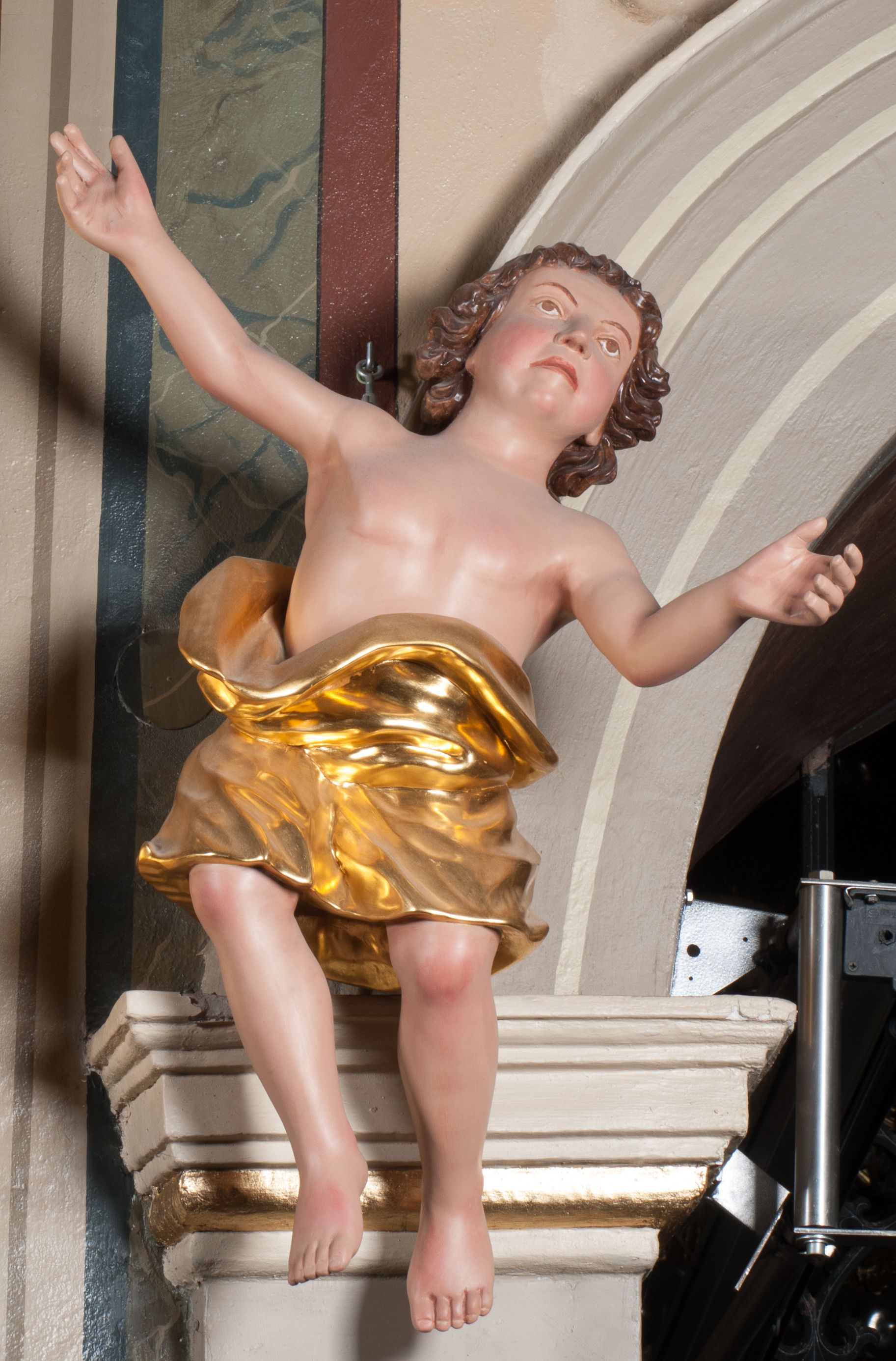 The statue of the angel placed on the pilaster's head was made in the 18th century. The angel has no wings, it is characterised by well-rendered body proportions and a slightly stiff pose.