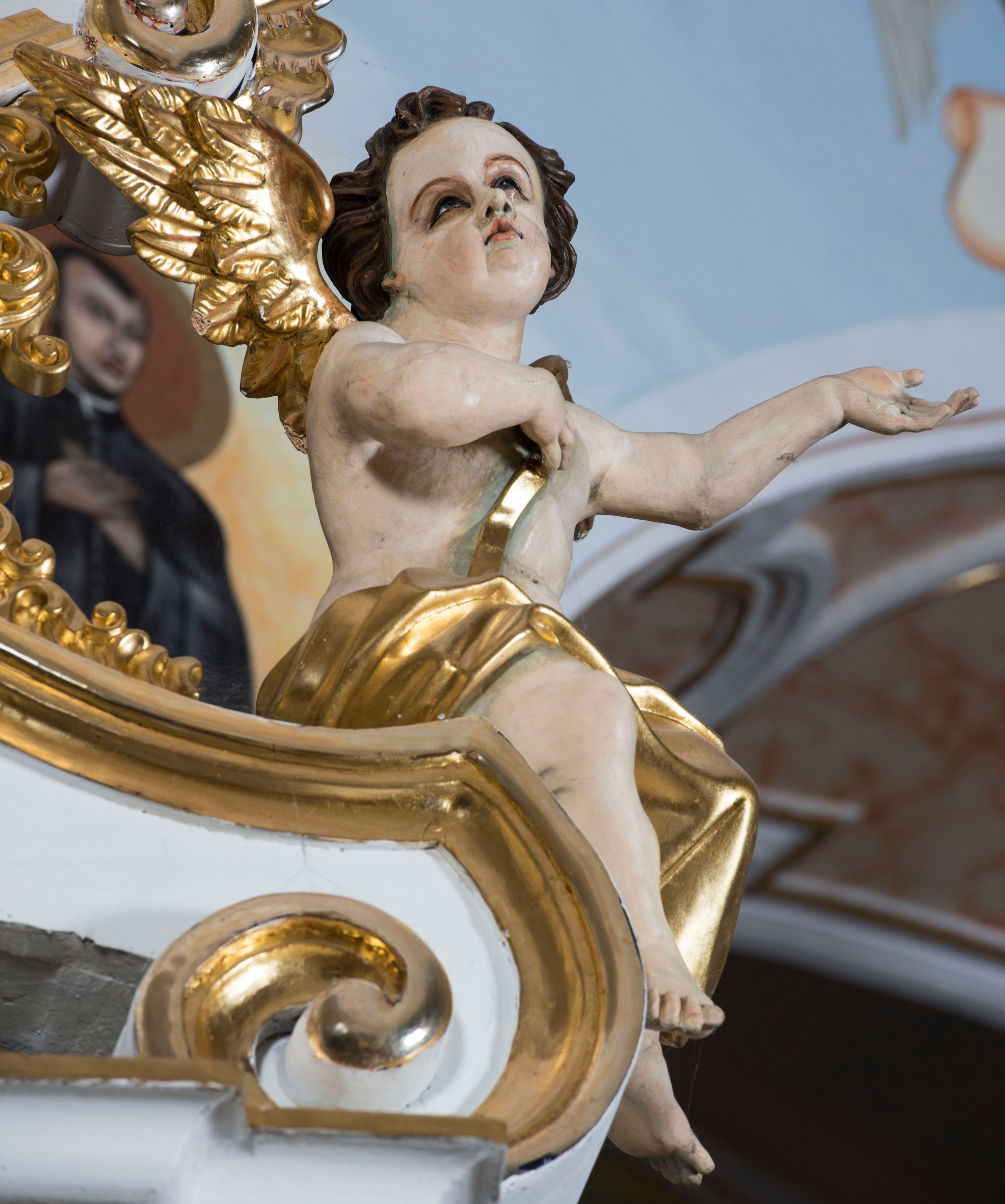 A pair of figures of angels is one of the elements of the side altar of the Sacred Heart of Jesus in the parish church in Kęty. Such type of sculptures, presented in whole or angel heads, were an ornamental element of reredoses in the Baroque era.